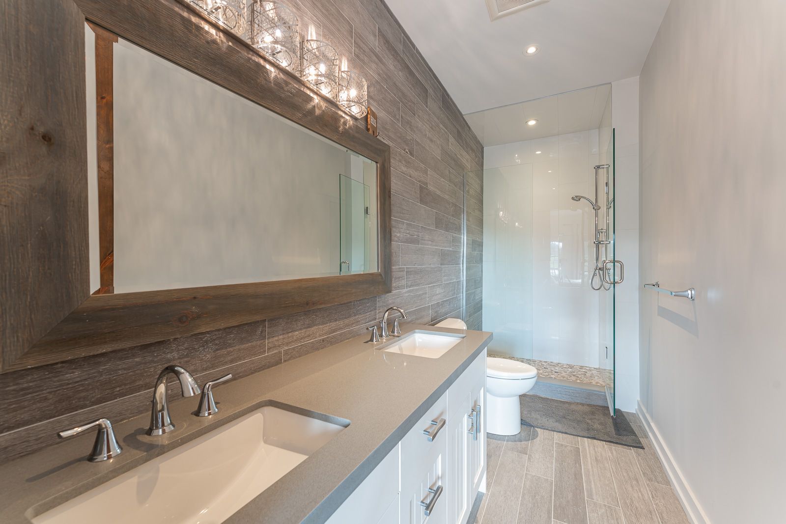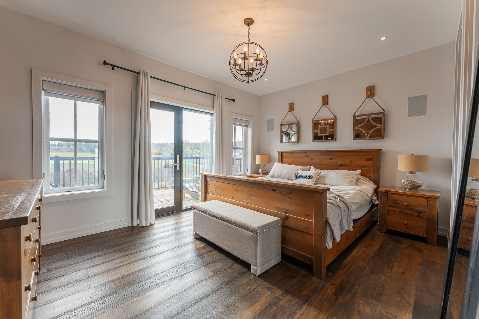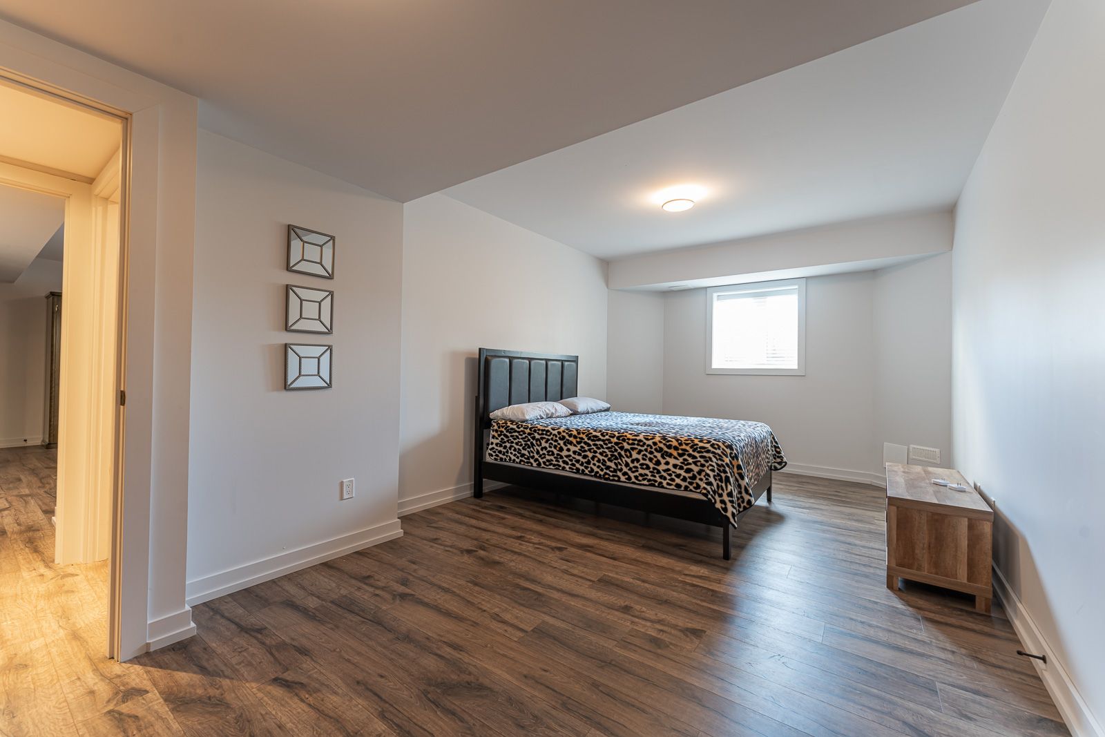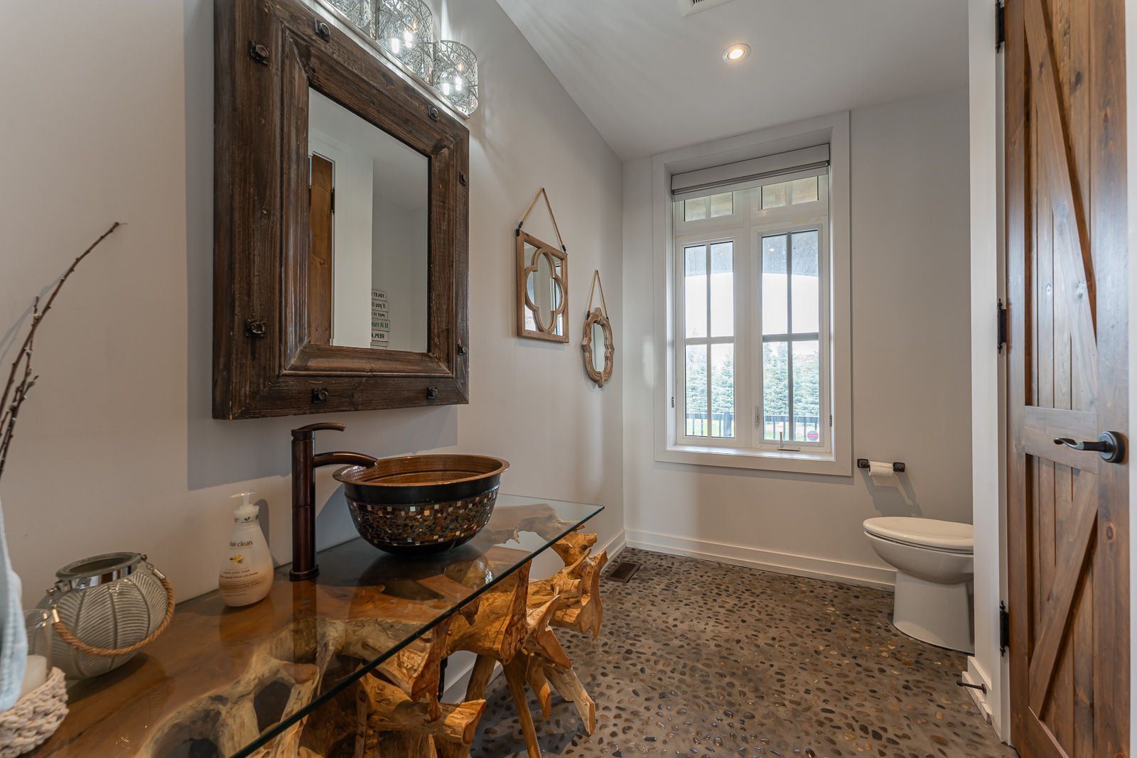 This custom-designed lora bay home in the blue mountains seamlessly combines contemporary chalet style with eco-conscious materials, like precast concrete and recycled steel, ensuring a low carbon footprint and long-lasting durability. The great room features vaulted ceilings, wood beams, and panoramic golf course views. A modern concrete fireplace adds elegance, and the chef's dream kitchen boasts granite counters, high-end appliances, and a wine fridge. The main floor offers a primary bedroom with a spa-like ensuite, walk-in closet, and a hot tub on the deck. Upstairs, three bedrooms and ensuites provide ample space, and the lower level includes a rec room, two bedrooms, a bathroom, and storage. Outside, an expansive back deck with a hot tub and beautiful landscaping invites relaxation and outdoor enjoyment.