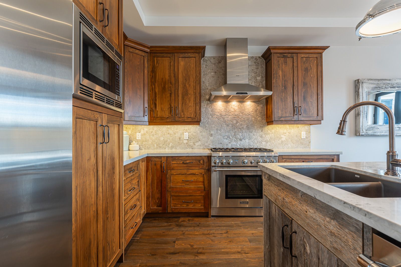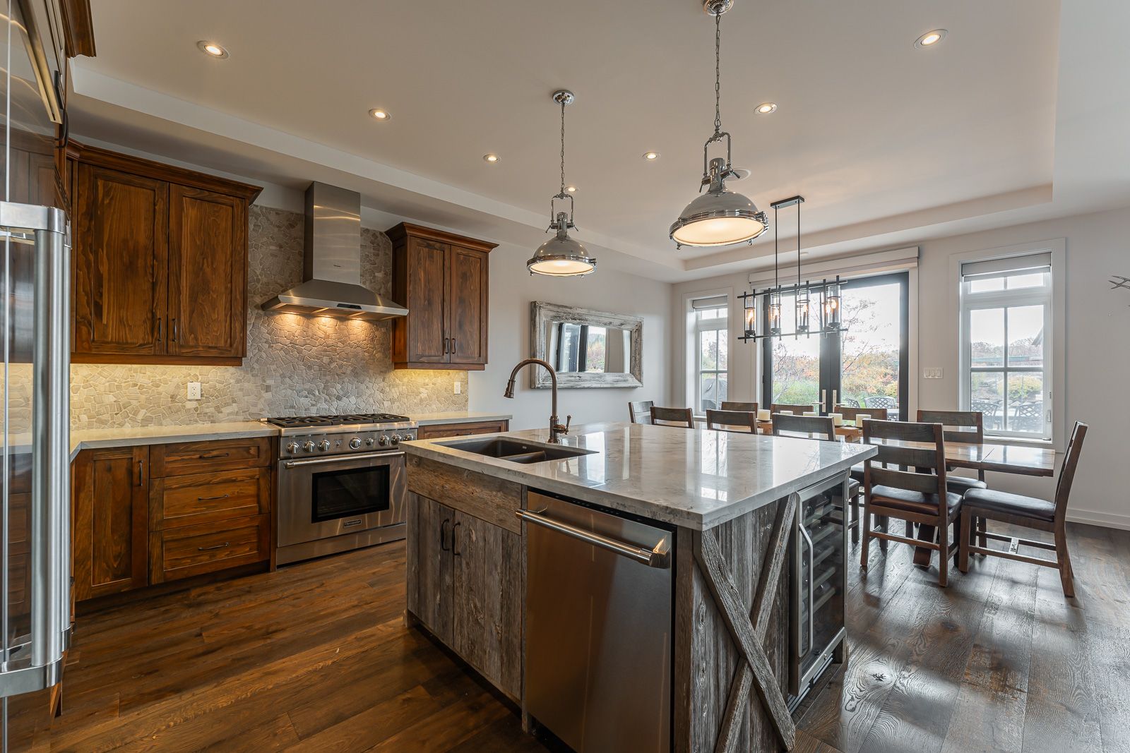• Chef's kitchen equipped with granite counters and high-end appliances.