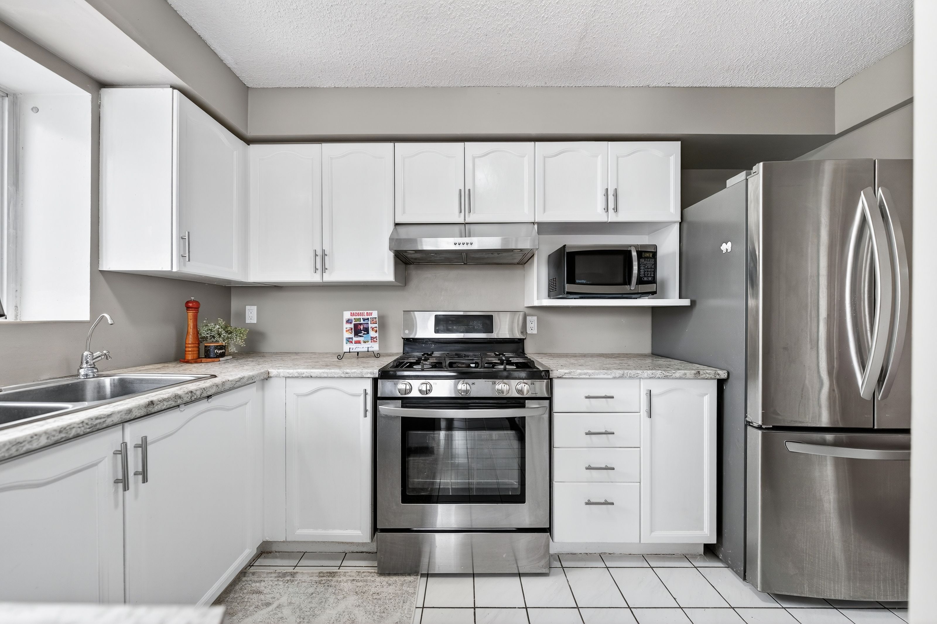 • Modern kitchen with stainless steel appliances and in-suite laundry.
