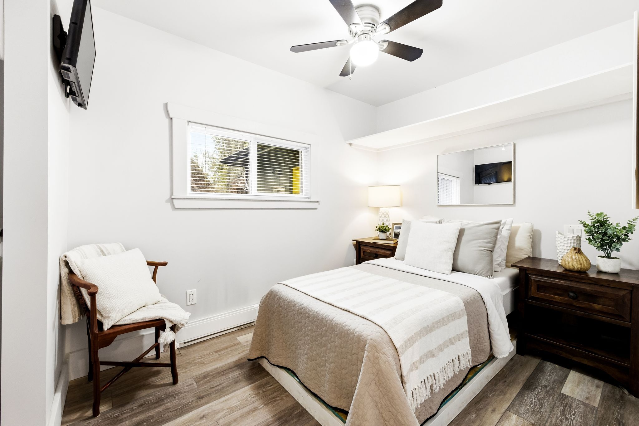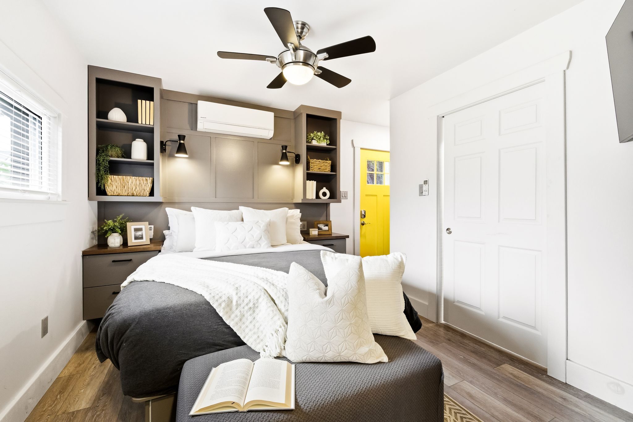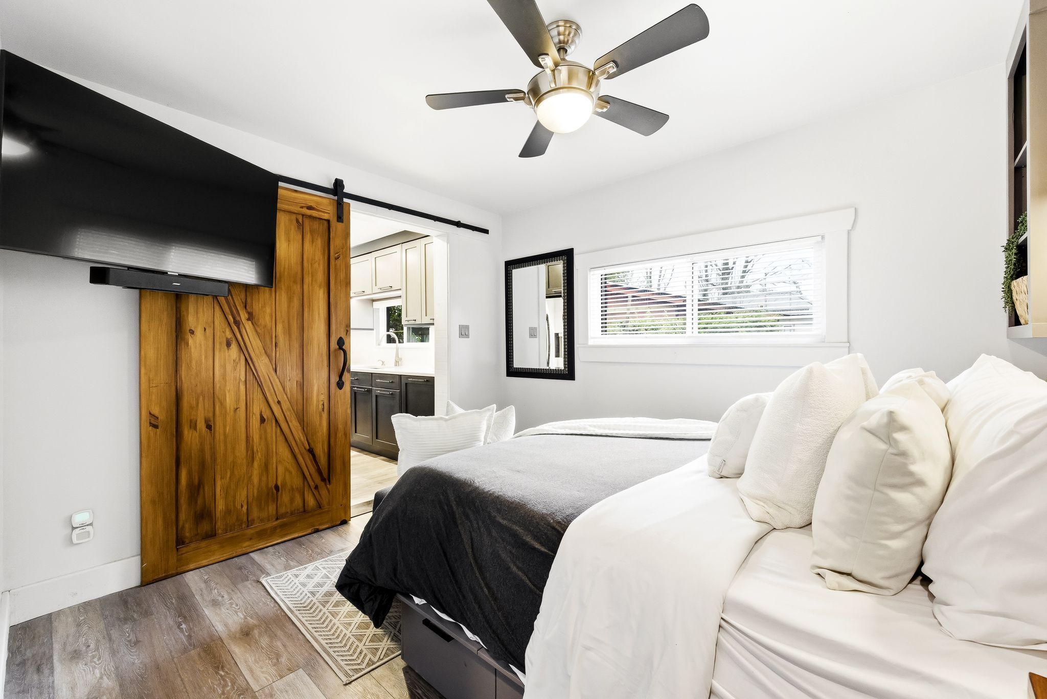 • Spacious primary bedroom features a walk-in closet and custom furniture.