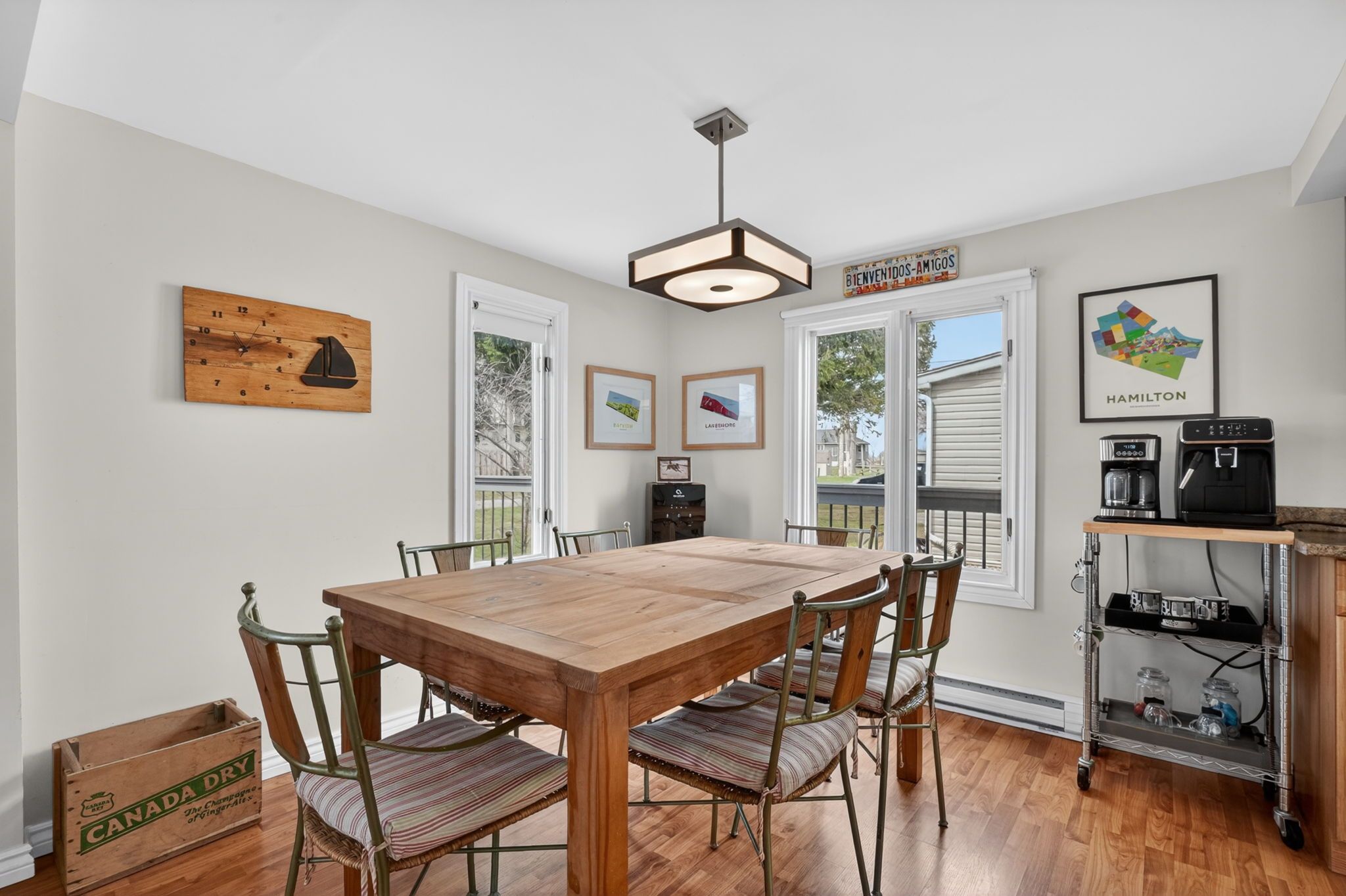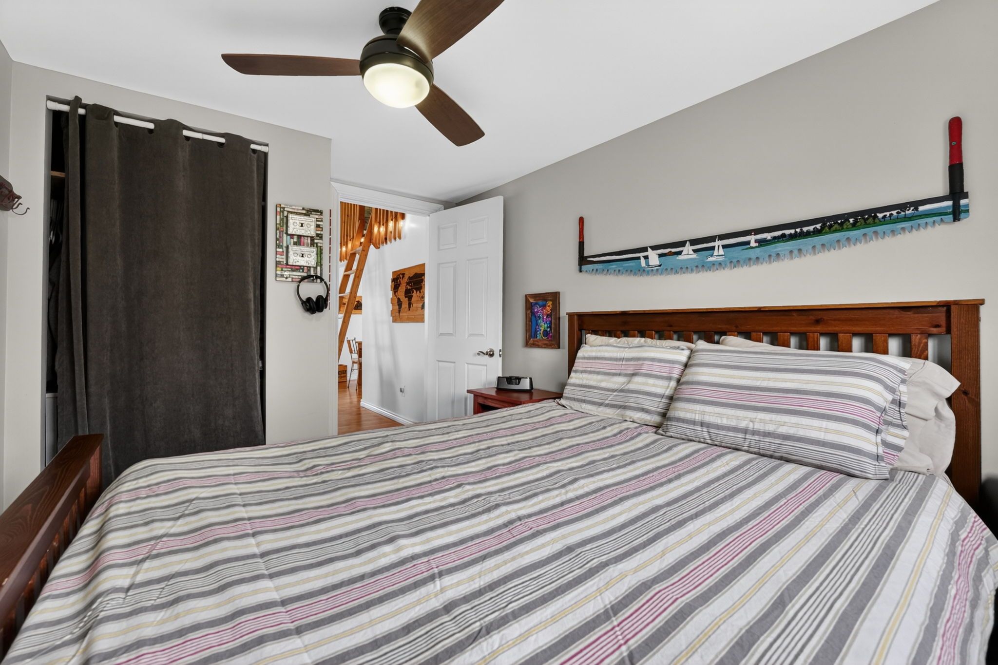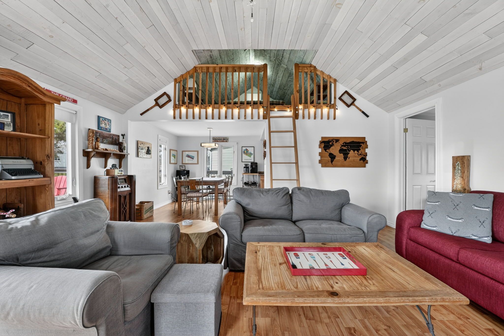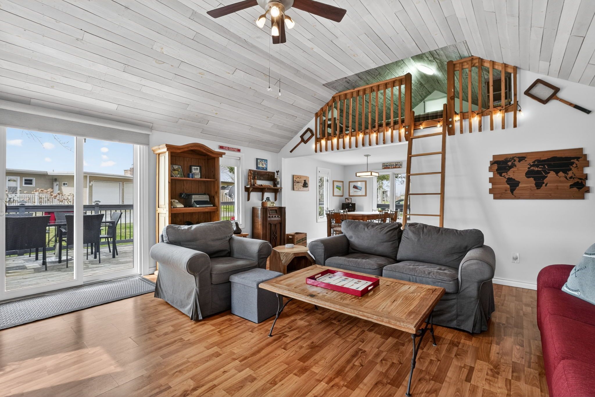 • Open concept living space with nautical decor and high ceilings for a bright feel.