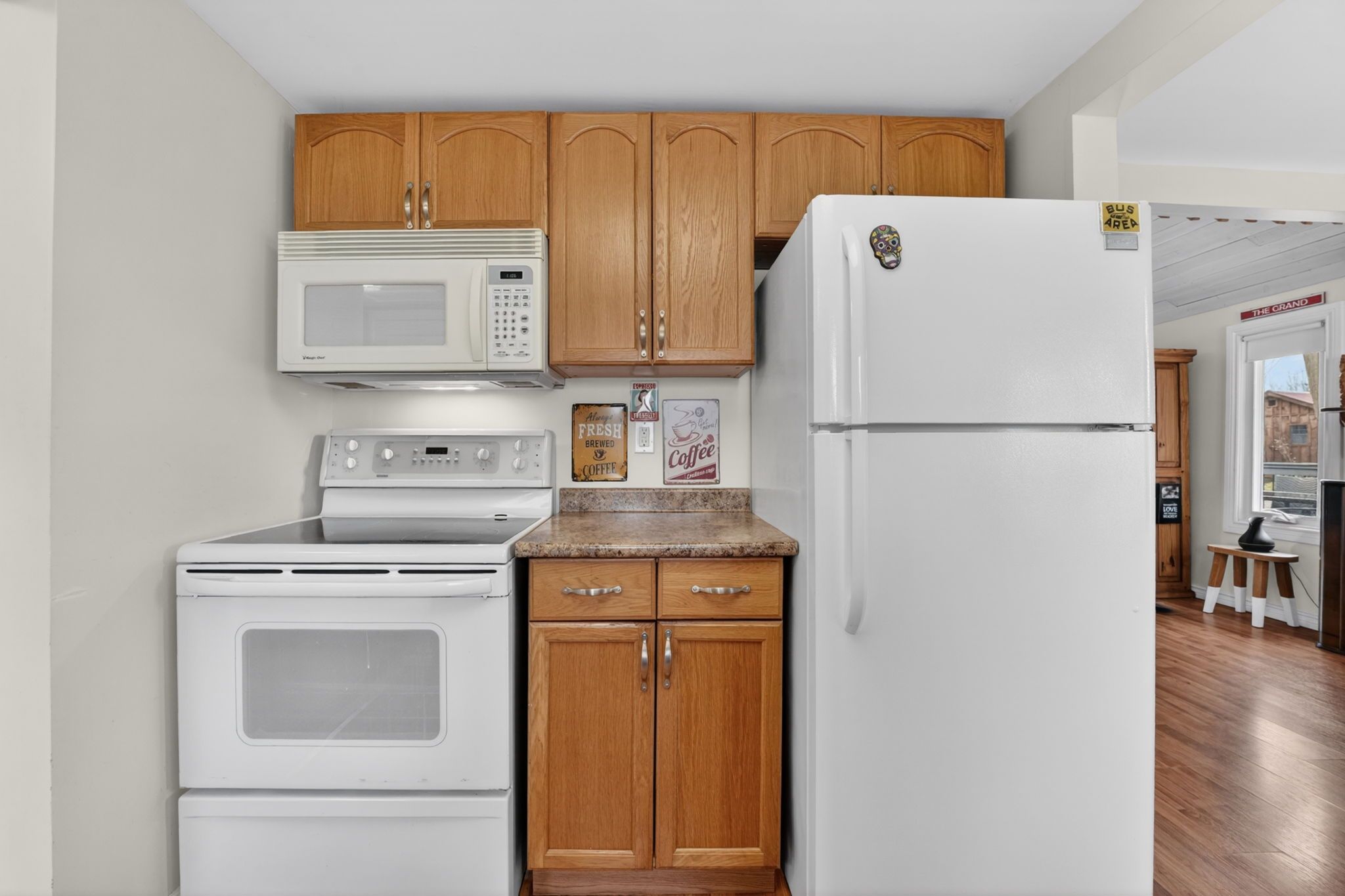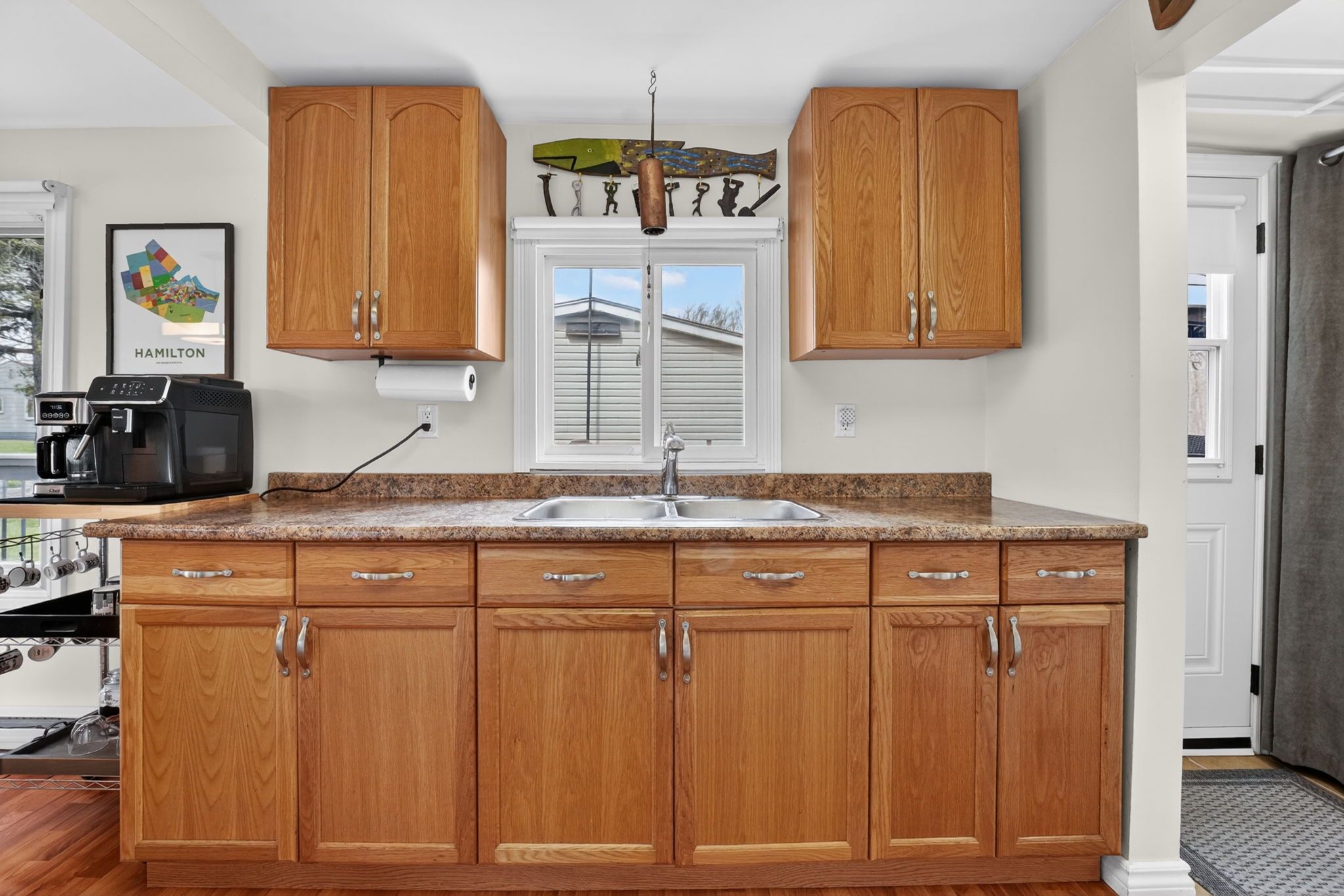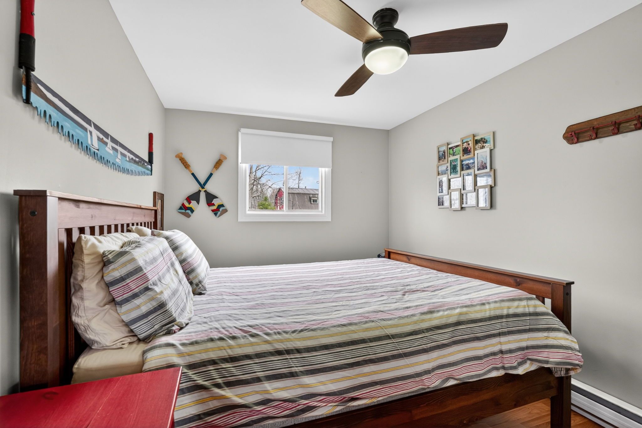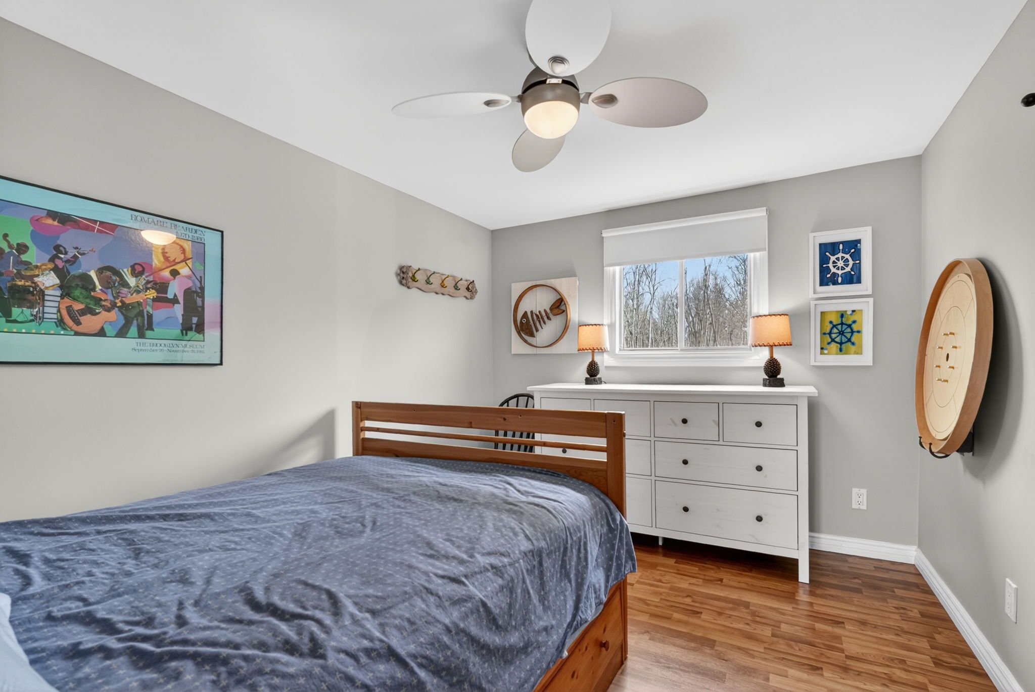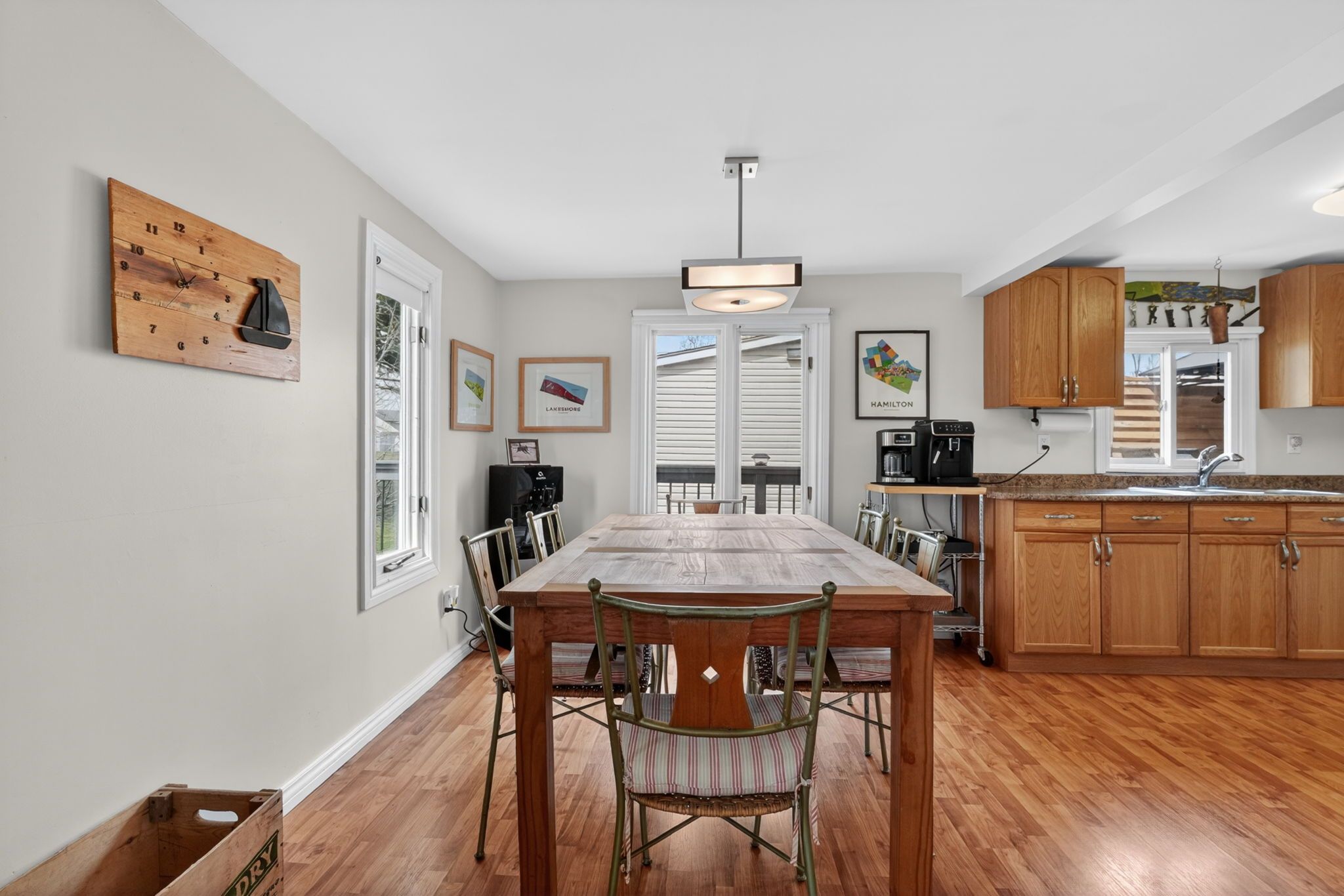 • Open concept living space with nautical decor and high ceilings for a bright feel.