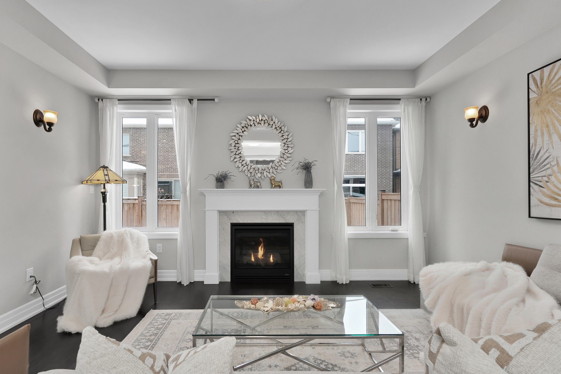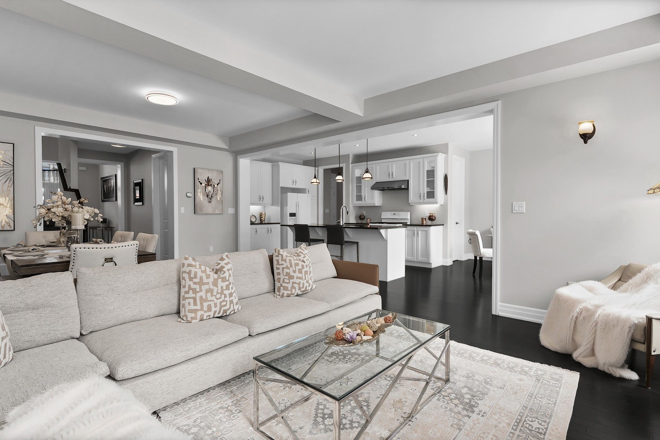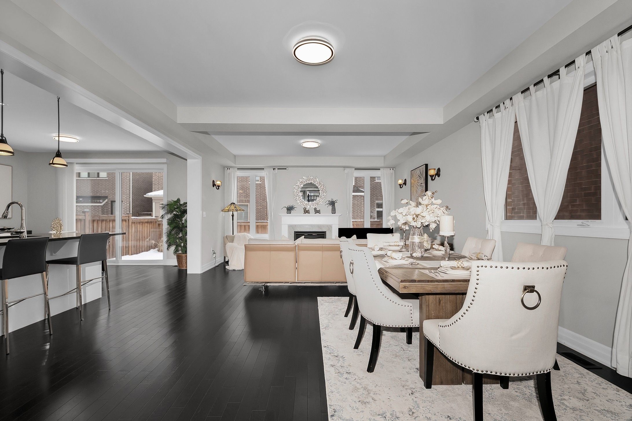 • Open-concept living area with gas fireplace and elegant lighting.