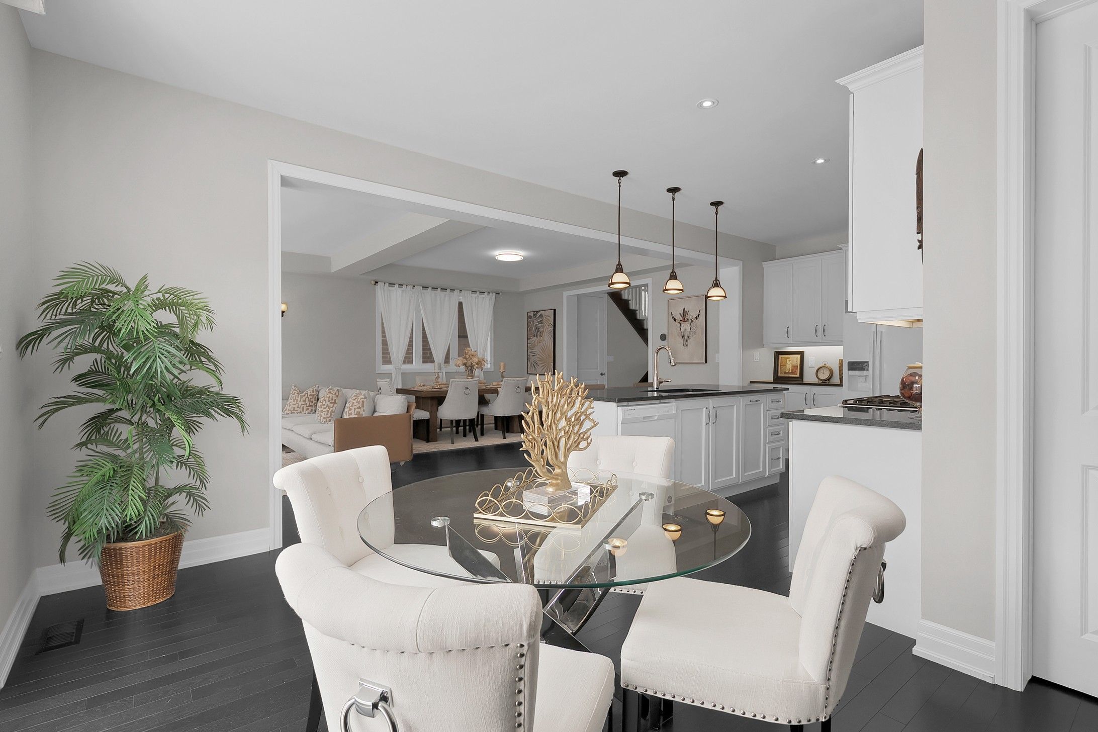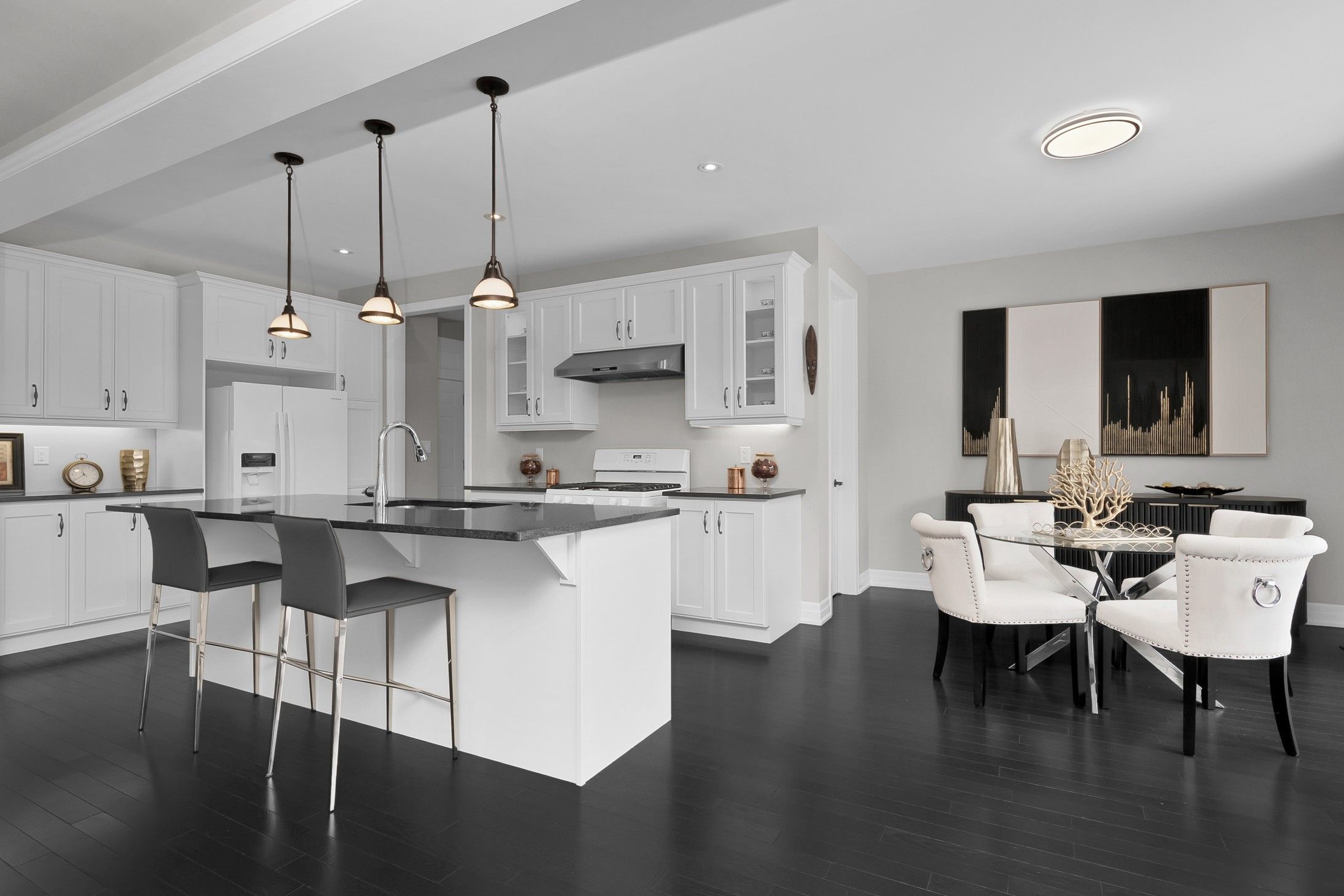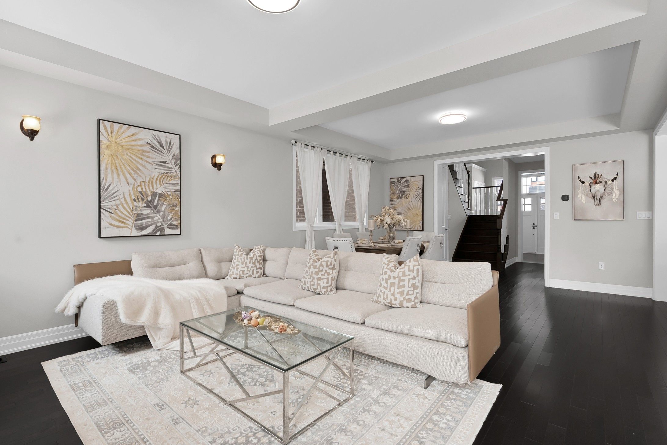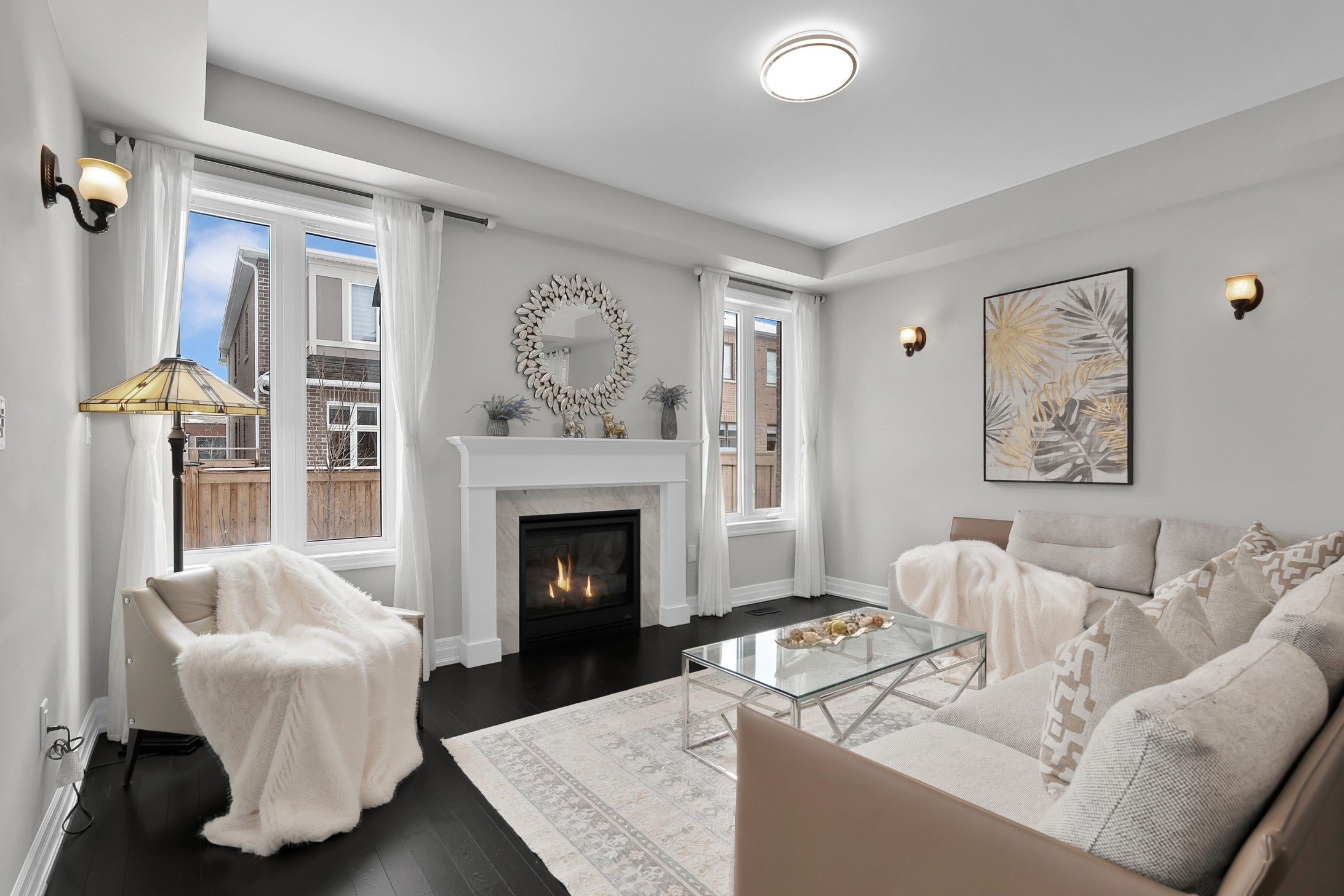 • Open-concept living area with gas fireplace and elegant lighting.