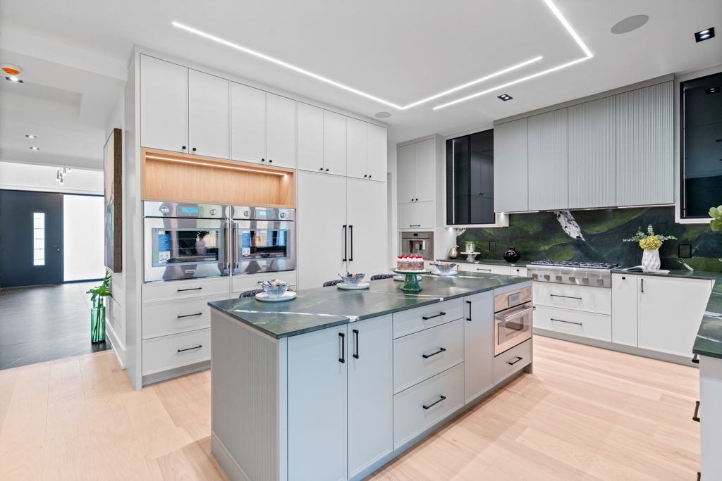 • Custom kitchen features Thermador appliances and leathered quartzite countertops.