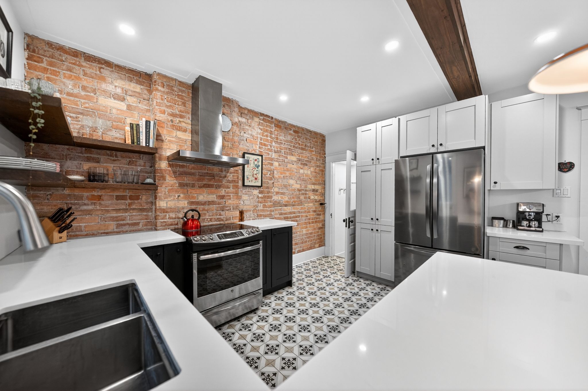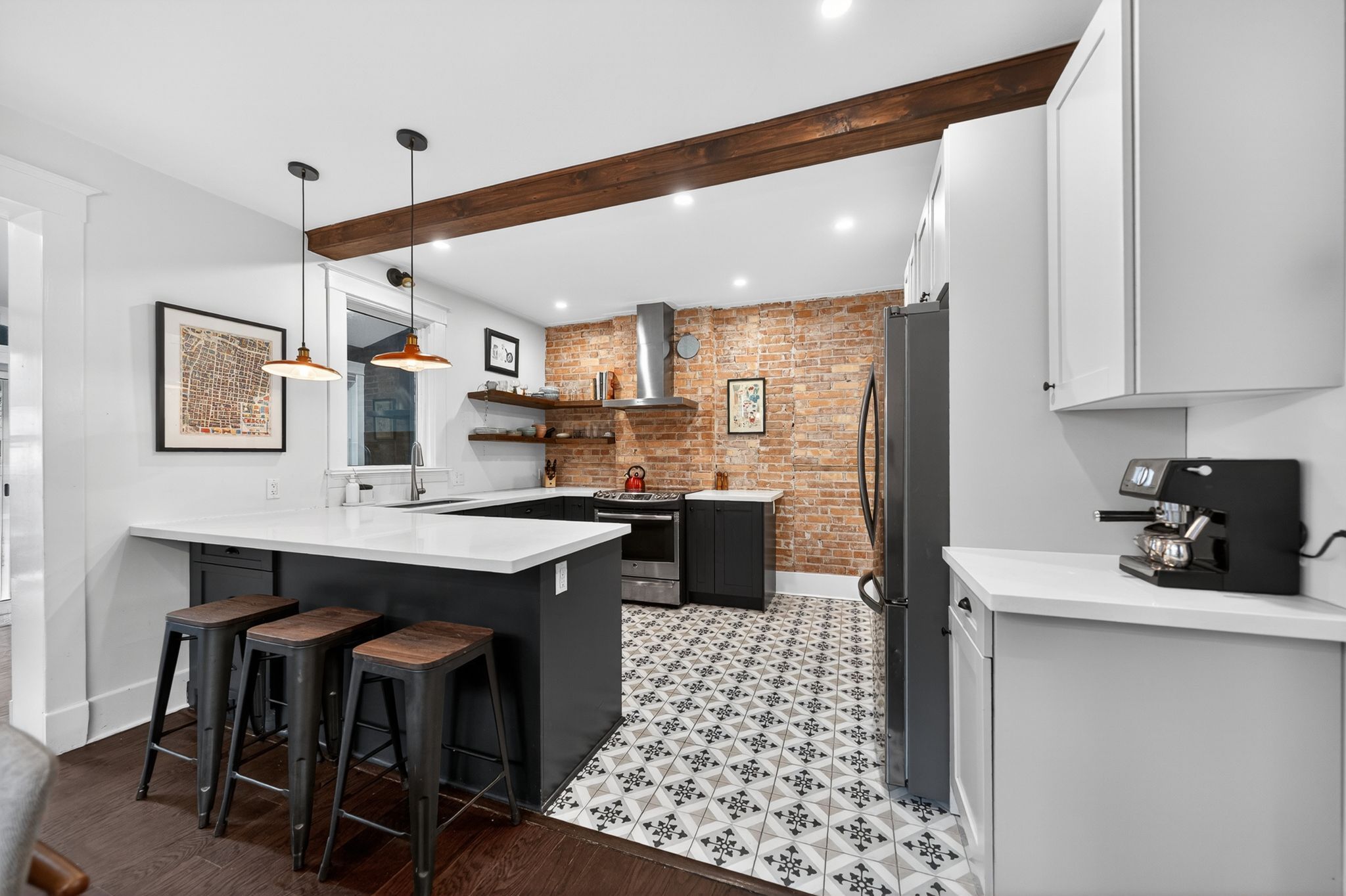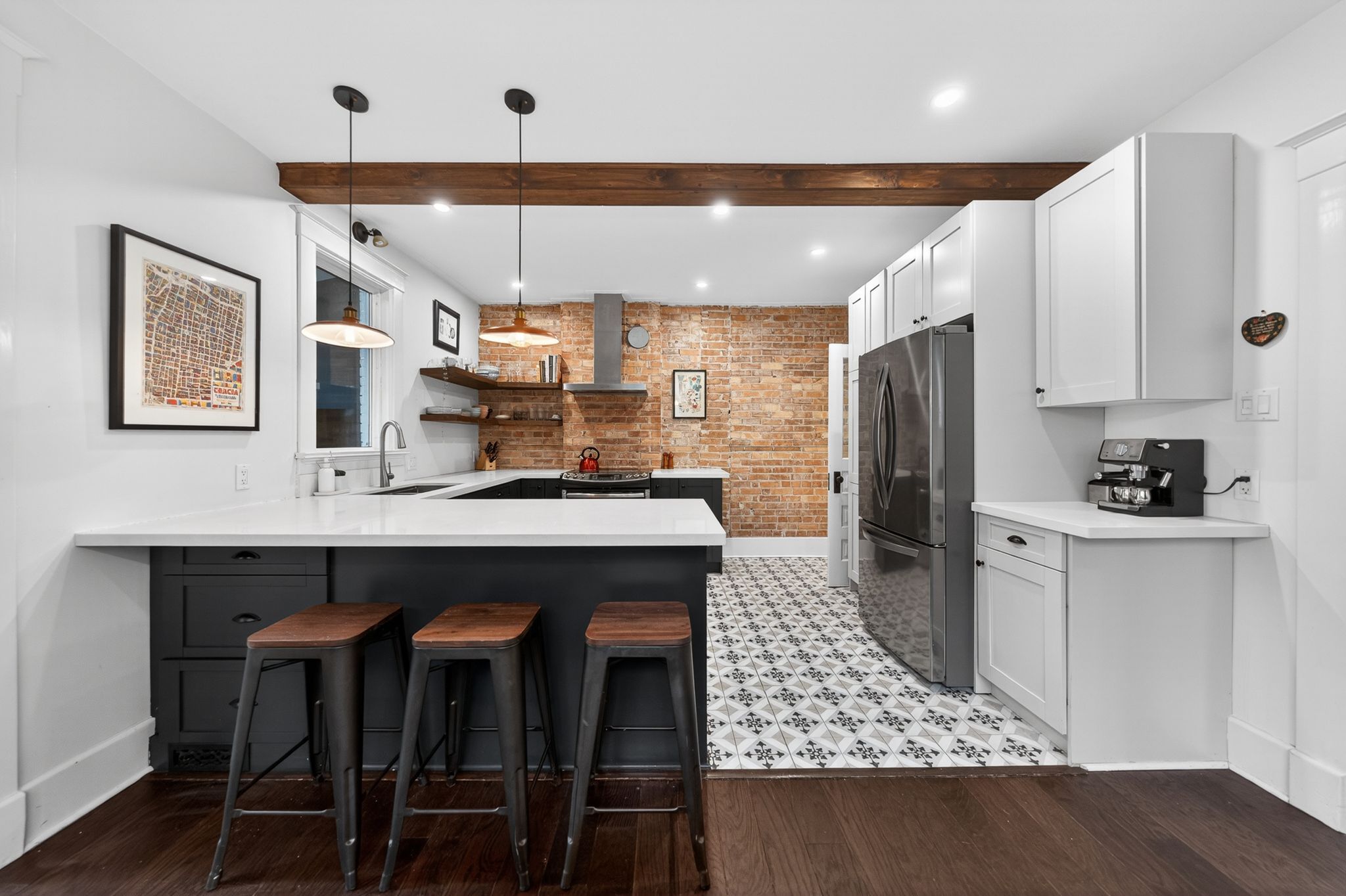 • Inviting kitchen with open shelving, exposed brick, and breakfast bar.