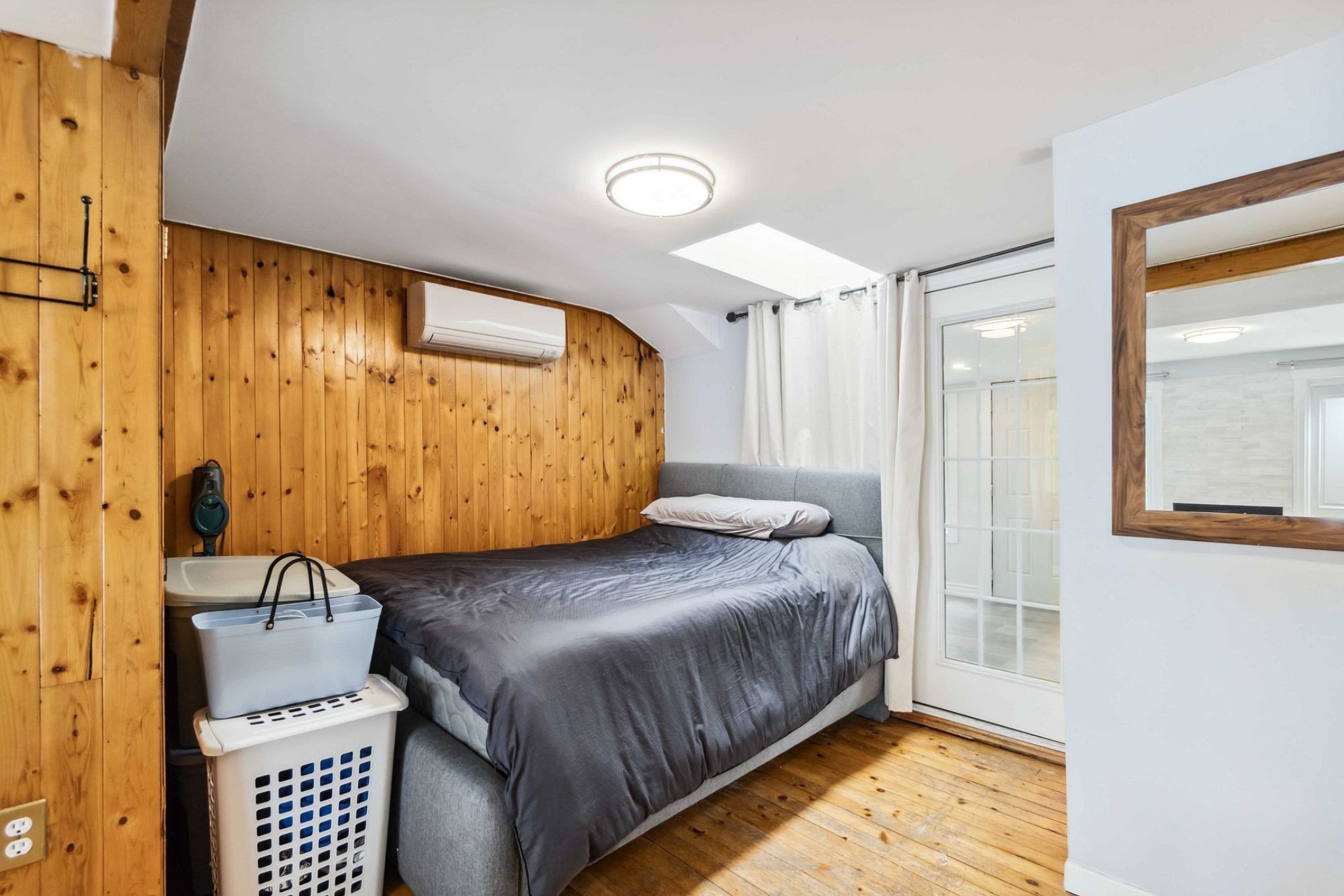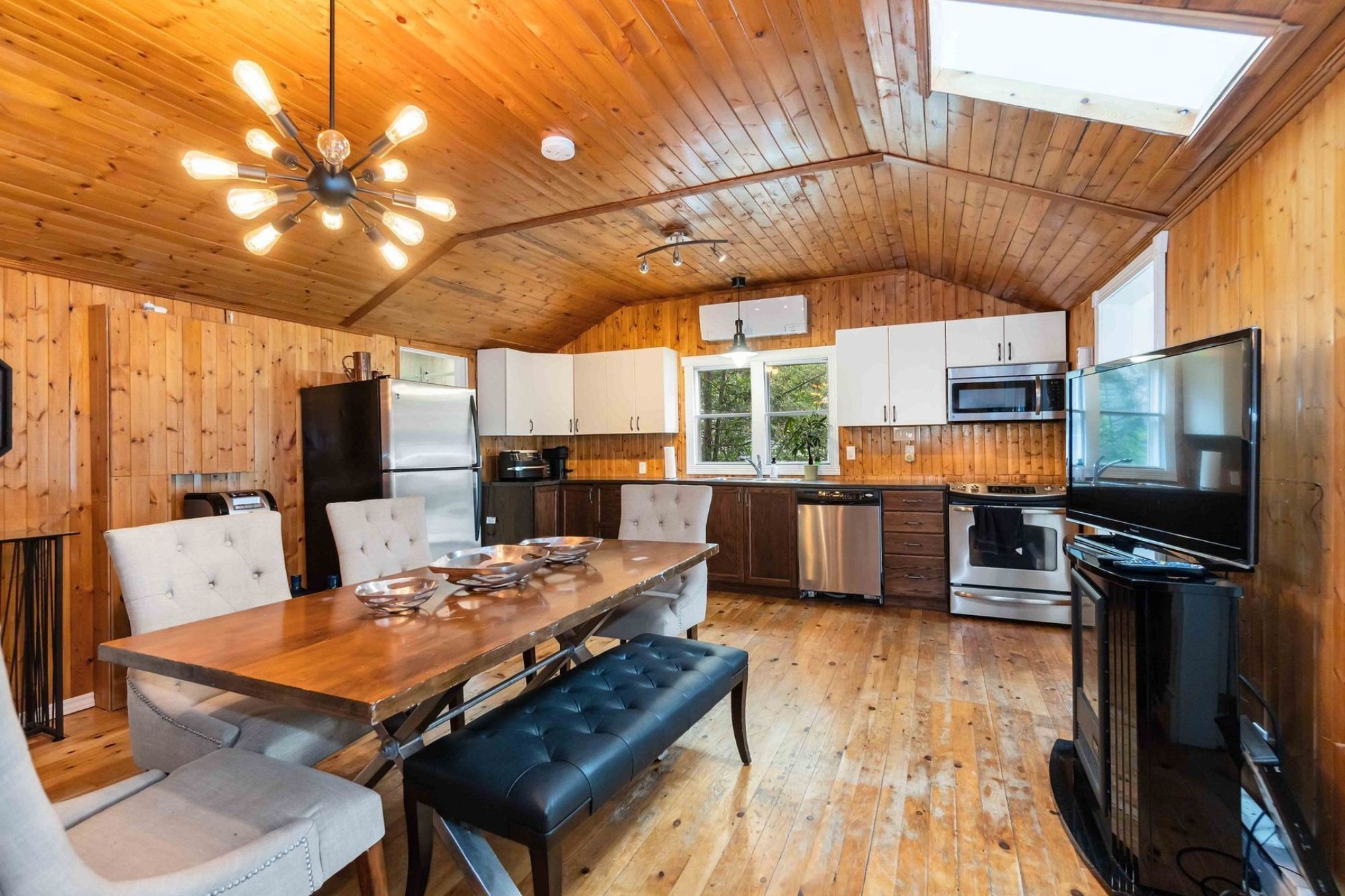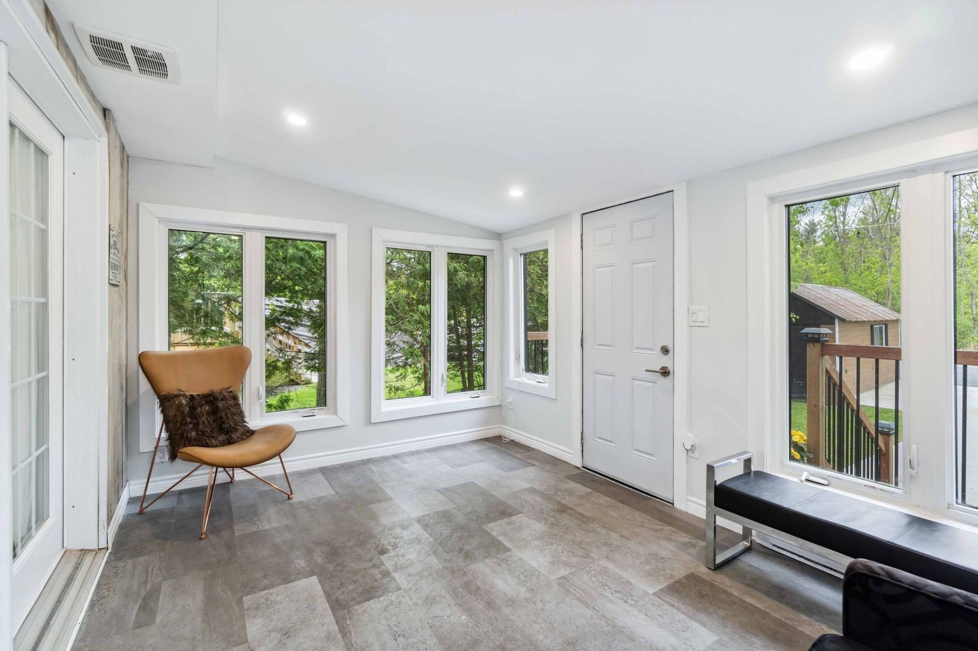 • Bright living area with large windows and cozy propane fireplace.