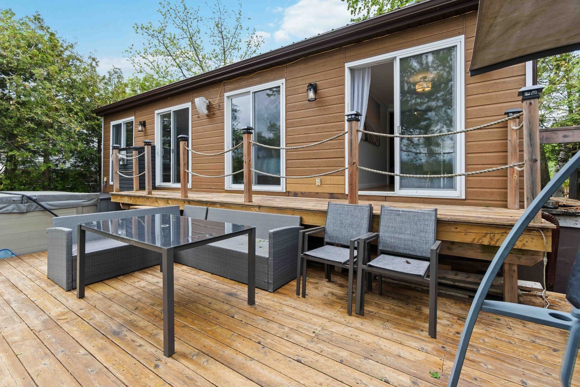 • Outdoor amenities include a hot tub, fire pit, and scenic trails nearby.