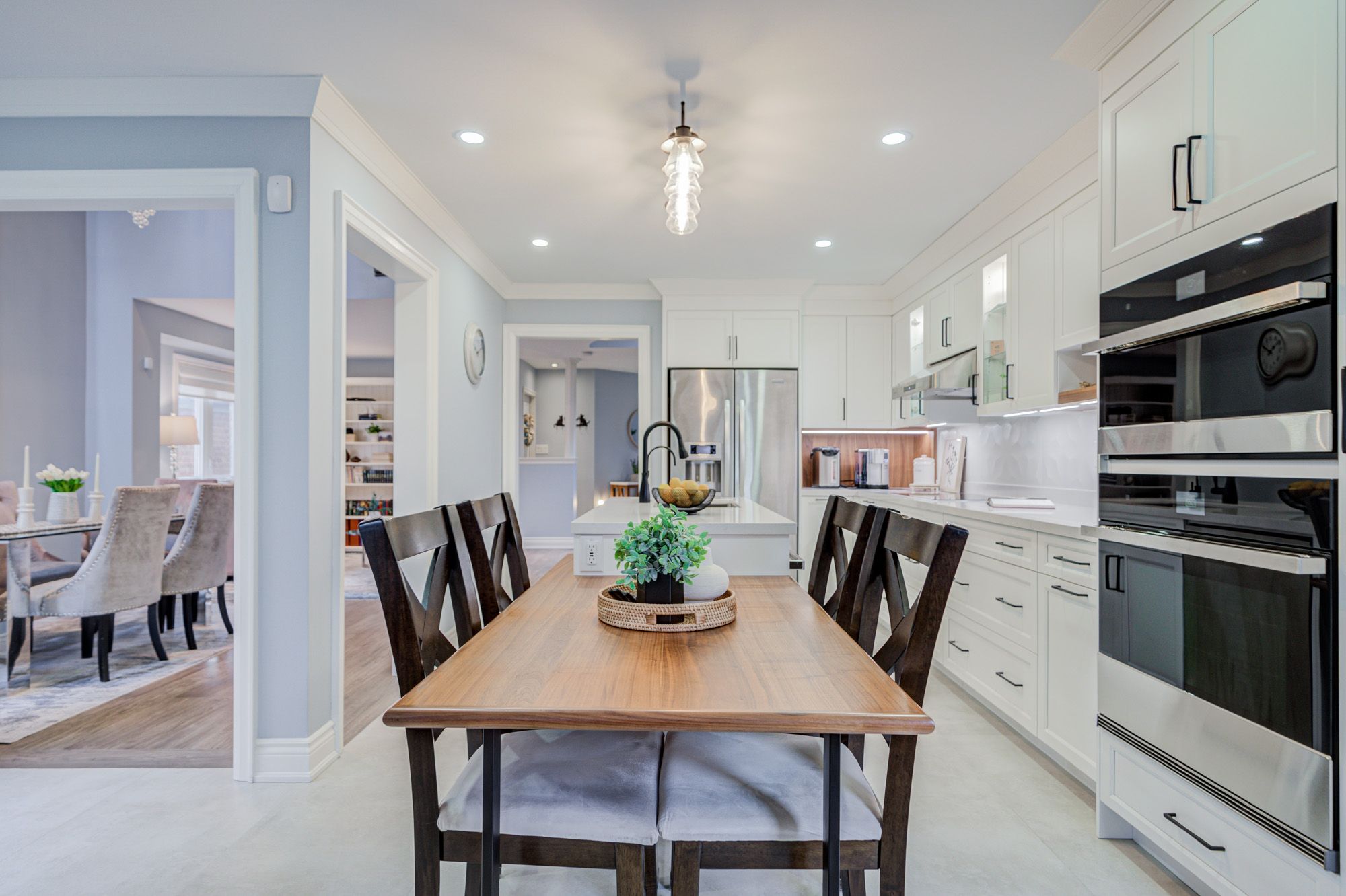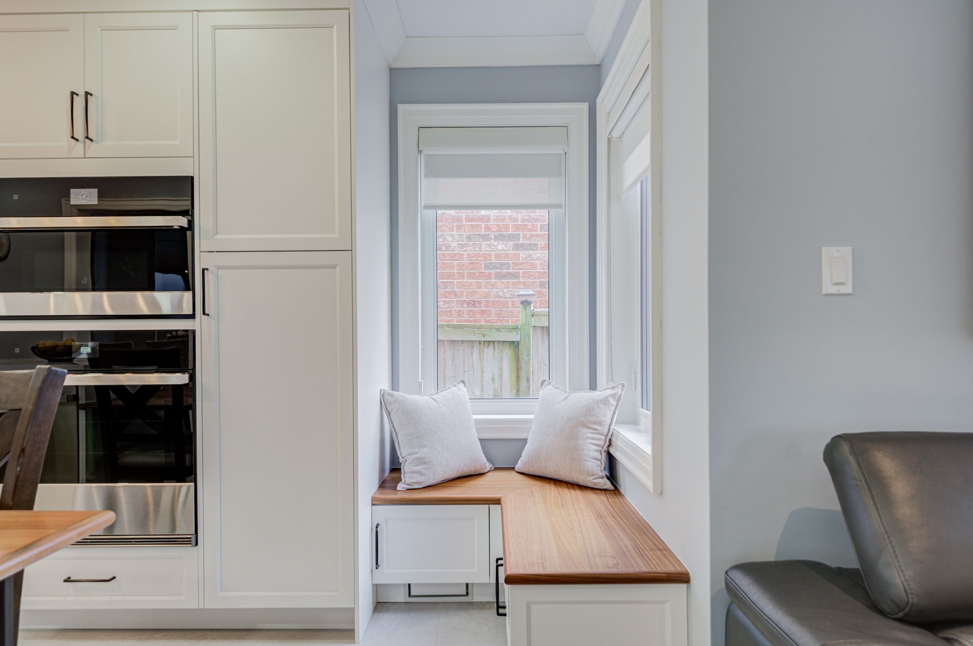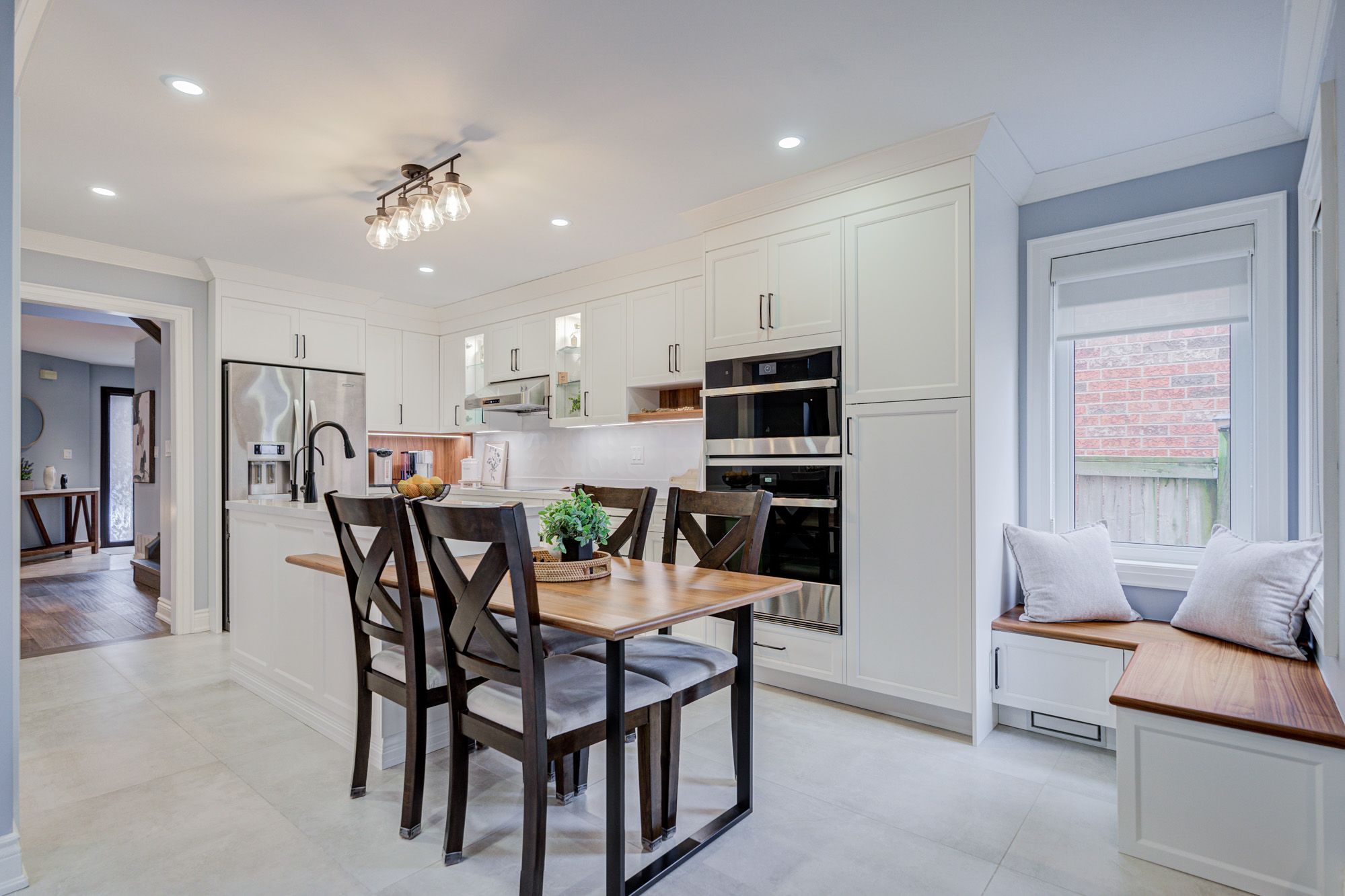 • Custom kitchen with built-in appliances and cozy breakfast nook.