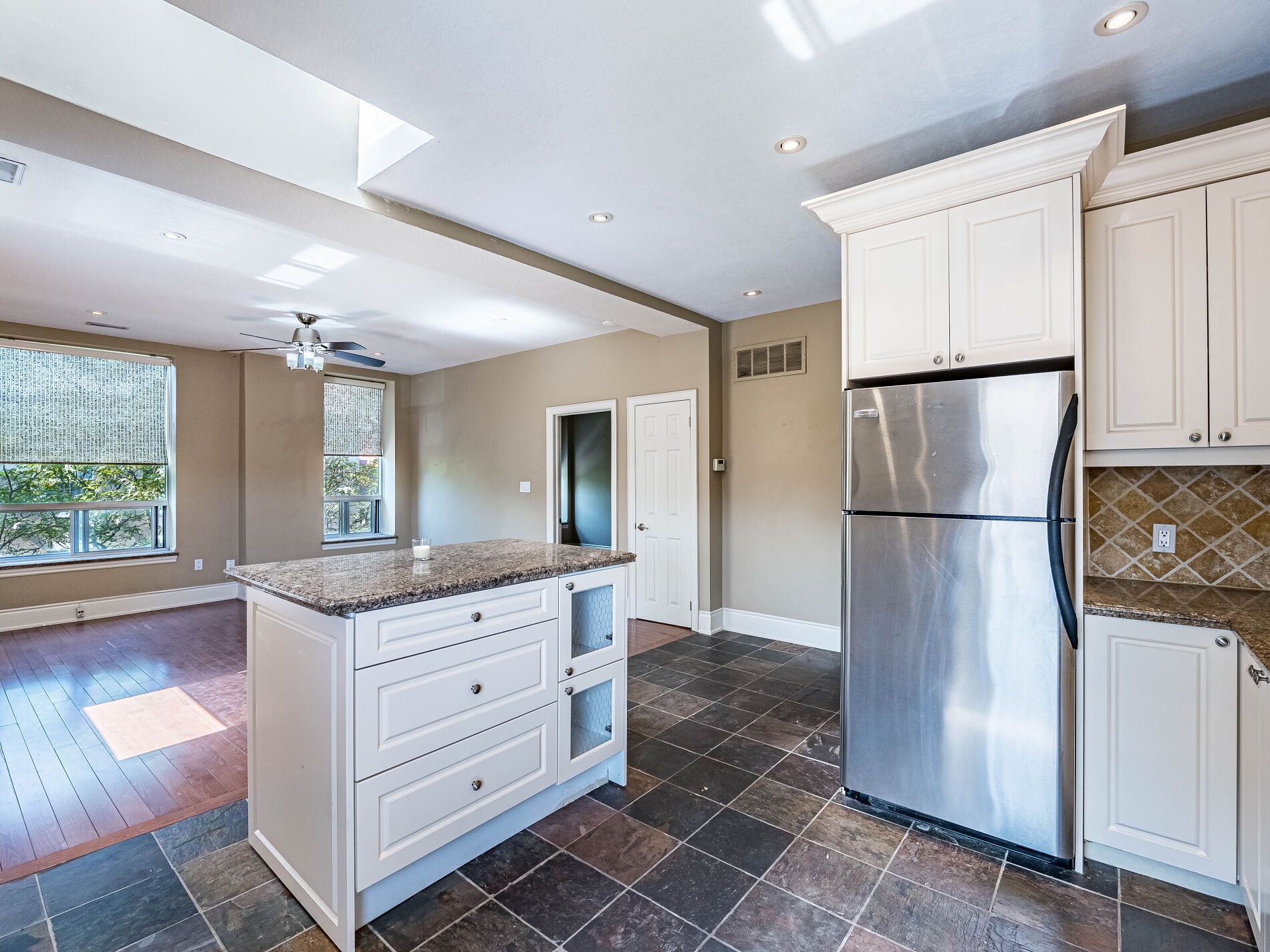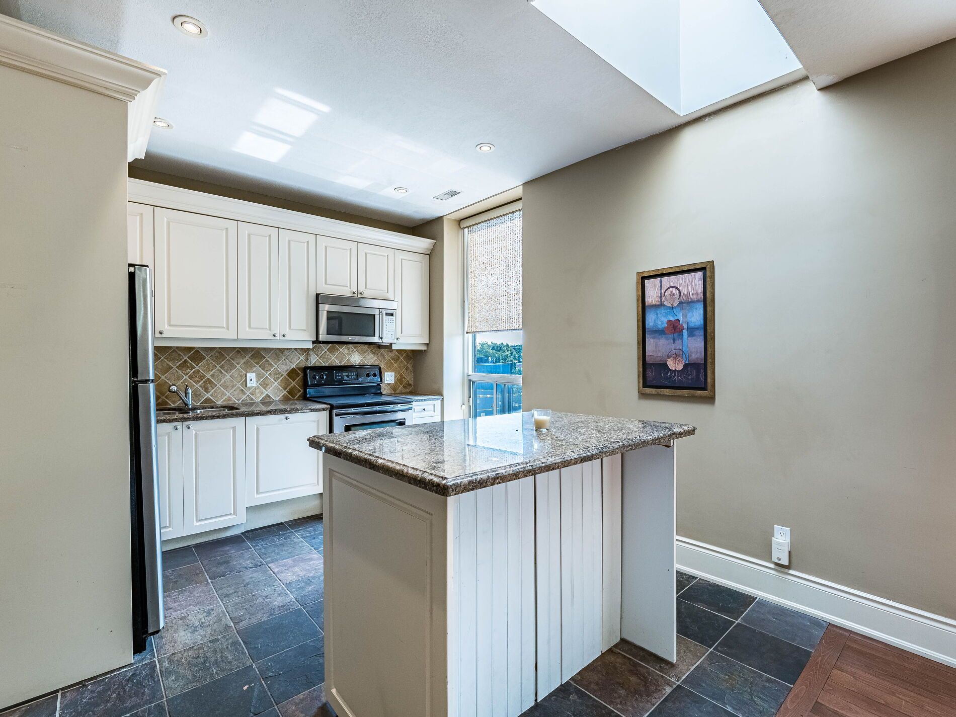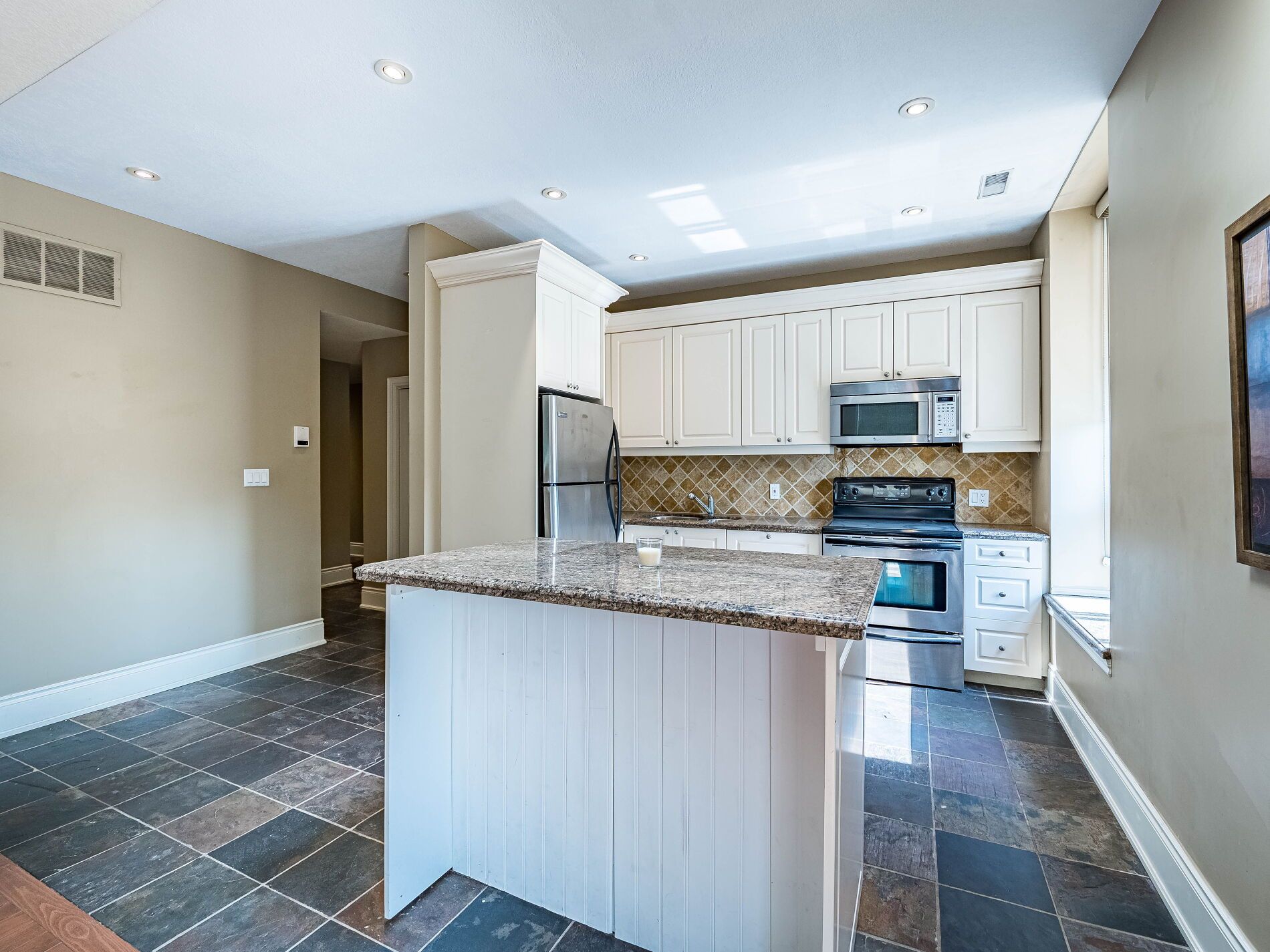• Modern kitchen featuring granite counters and stainless steel appliances.
