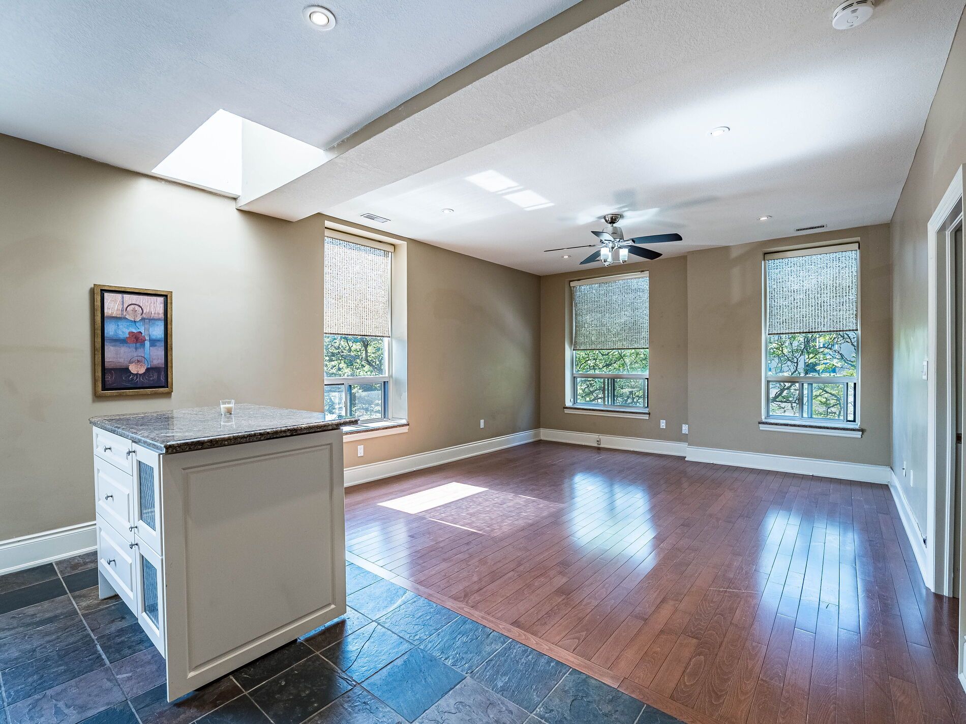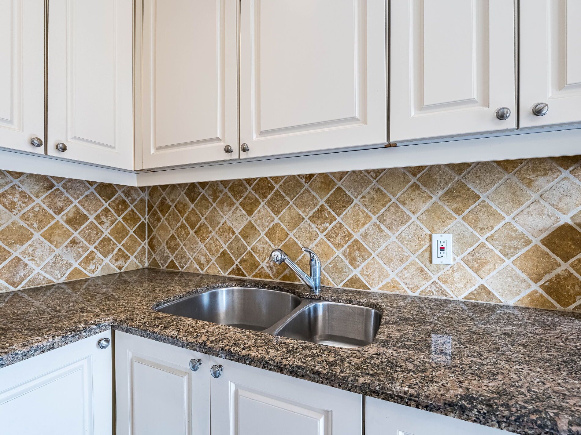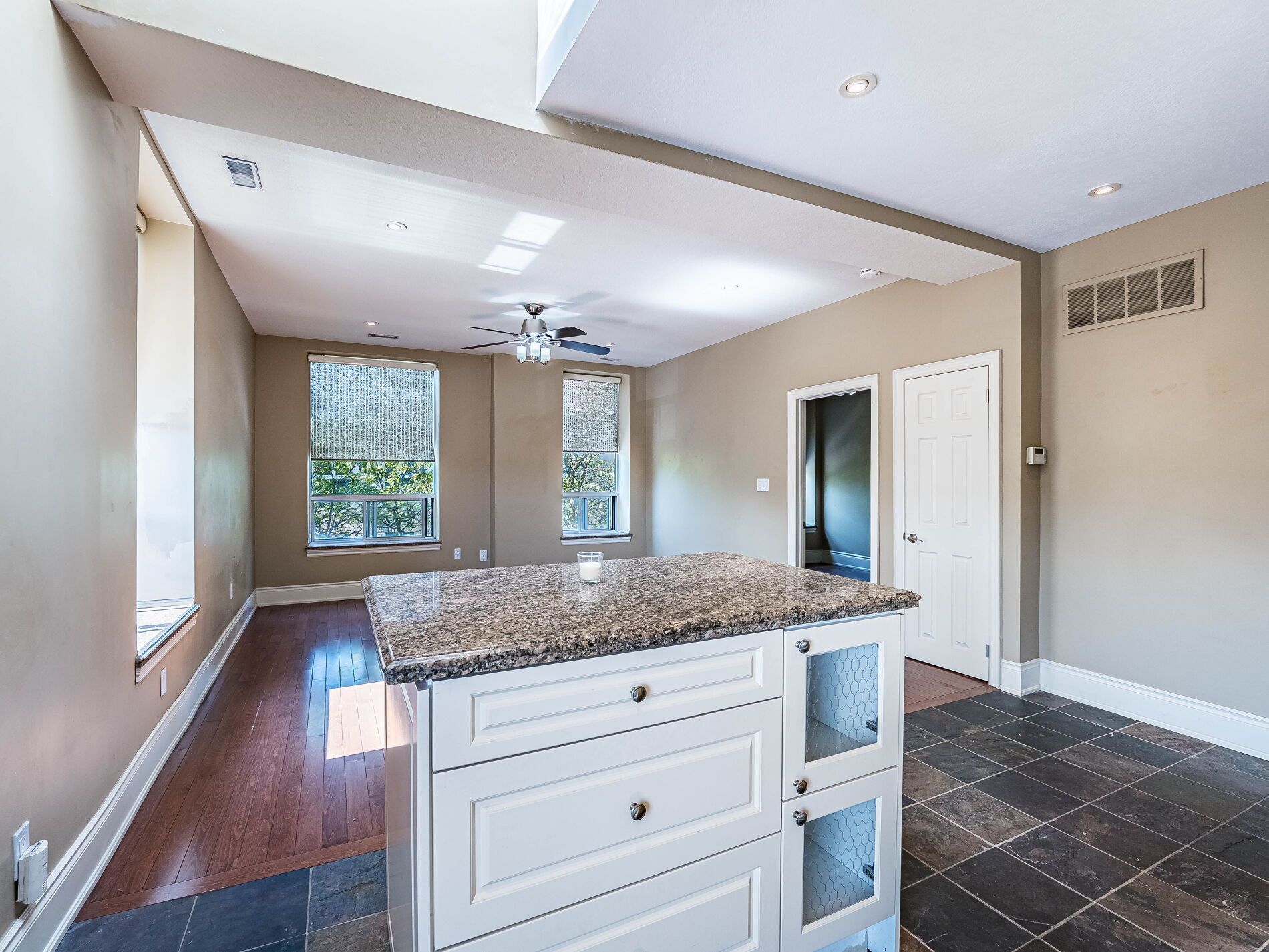 • Modern kitchen featuring granite counters and stainless steel appliances.