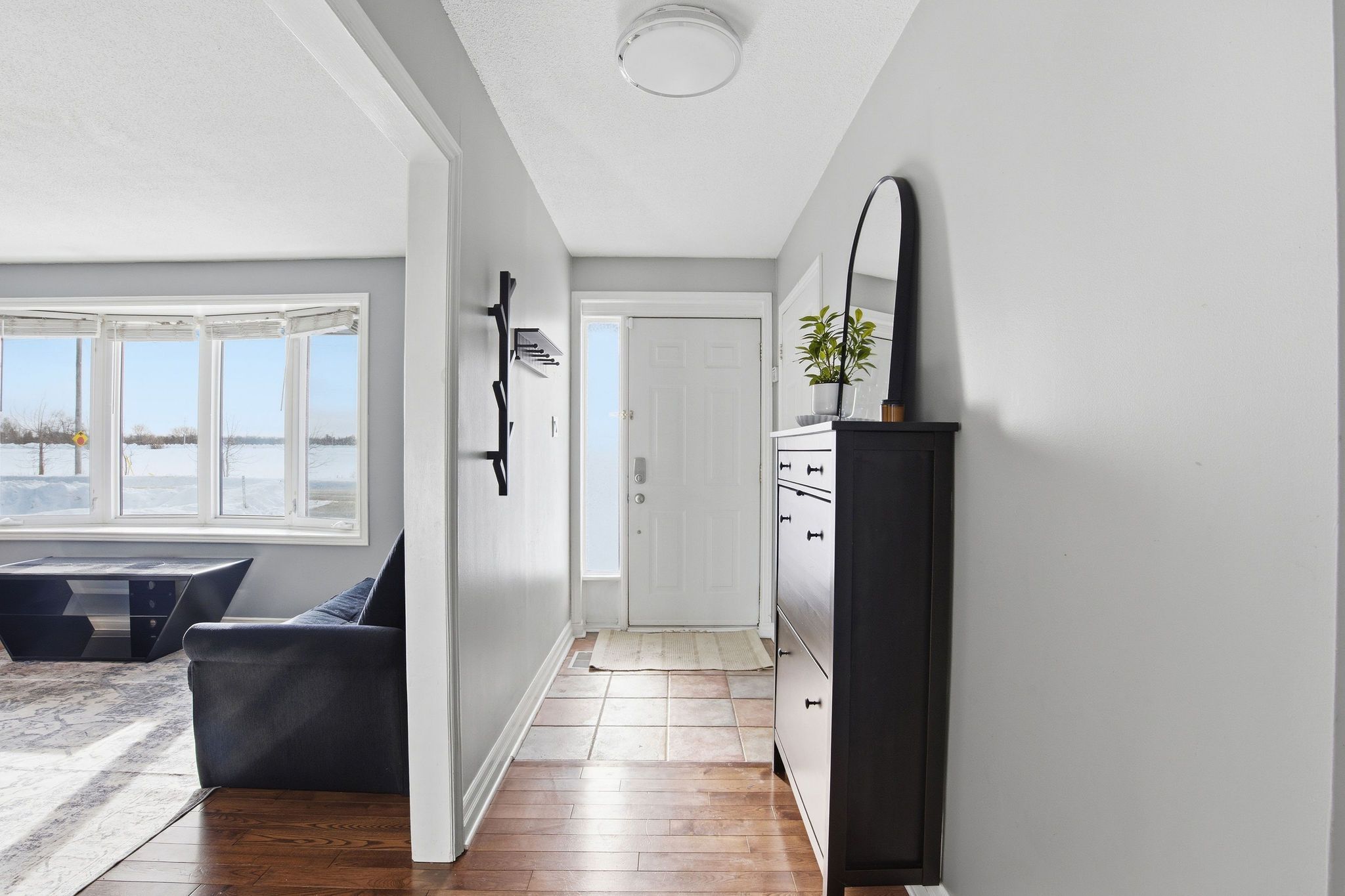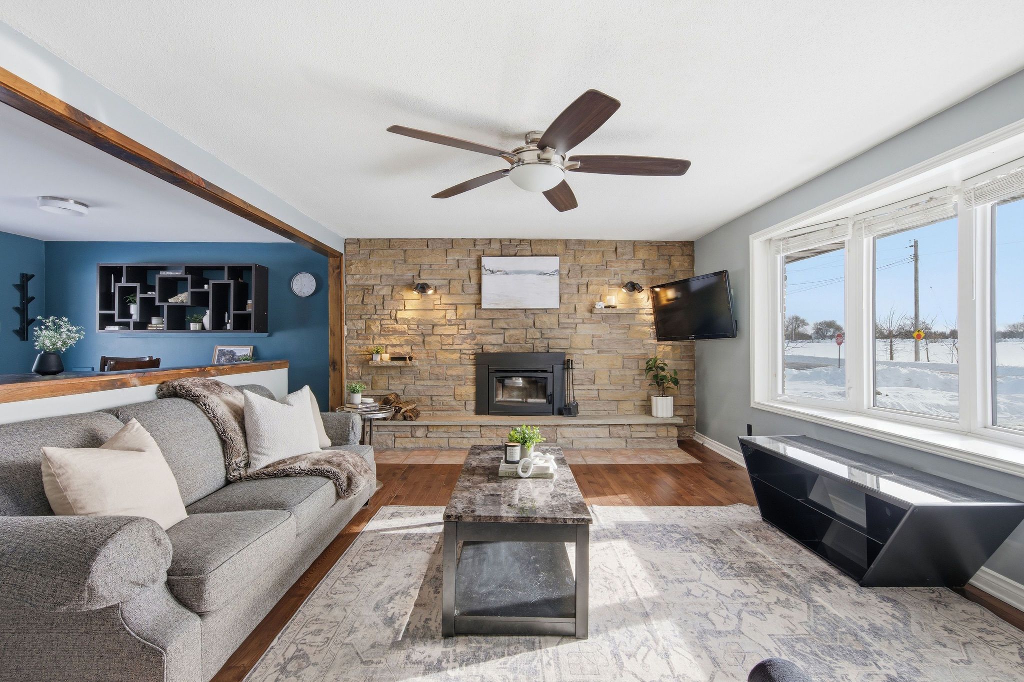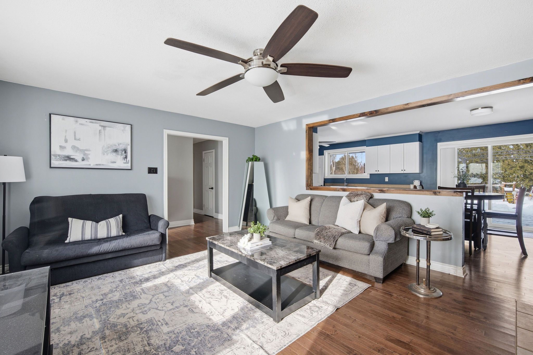 • Spacious living room with natural light from bay windows and patio doors.