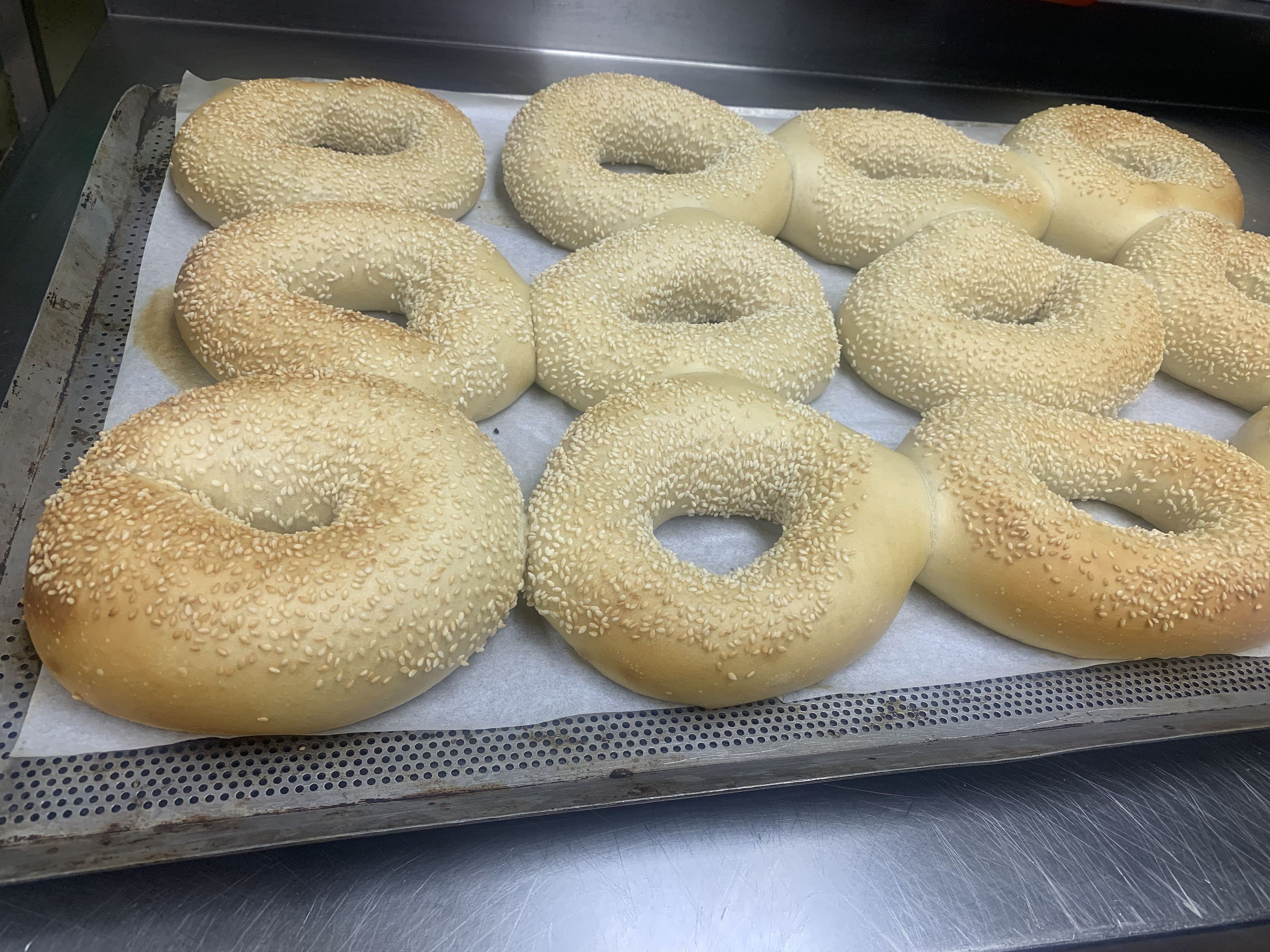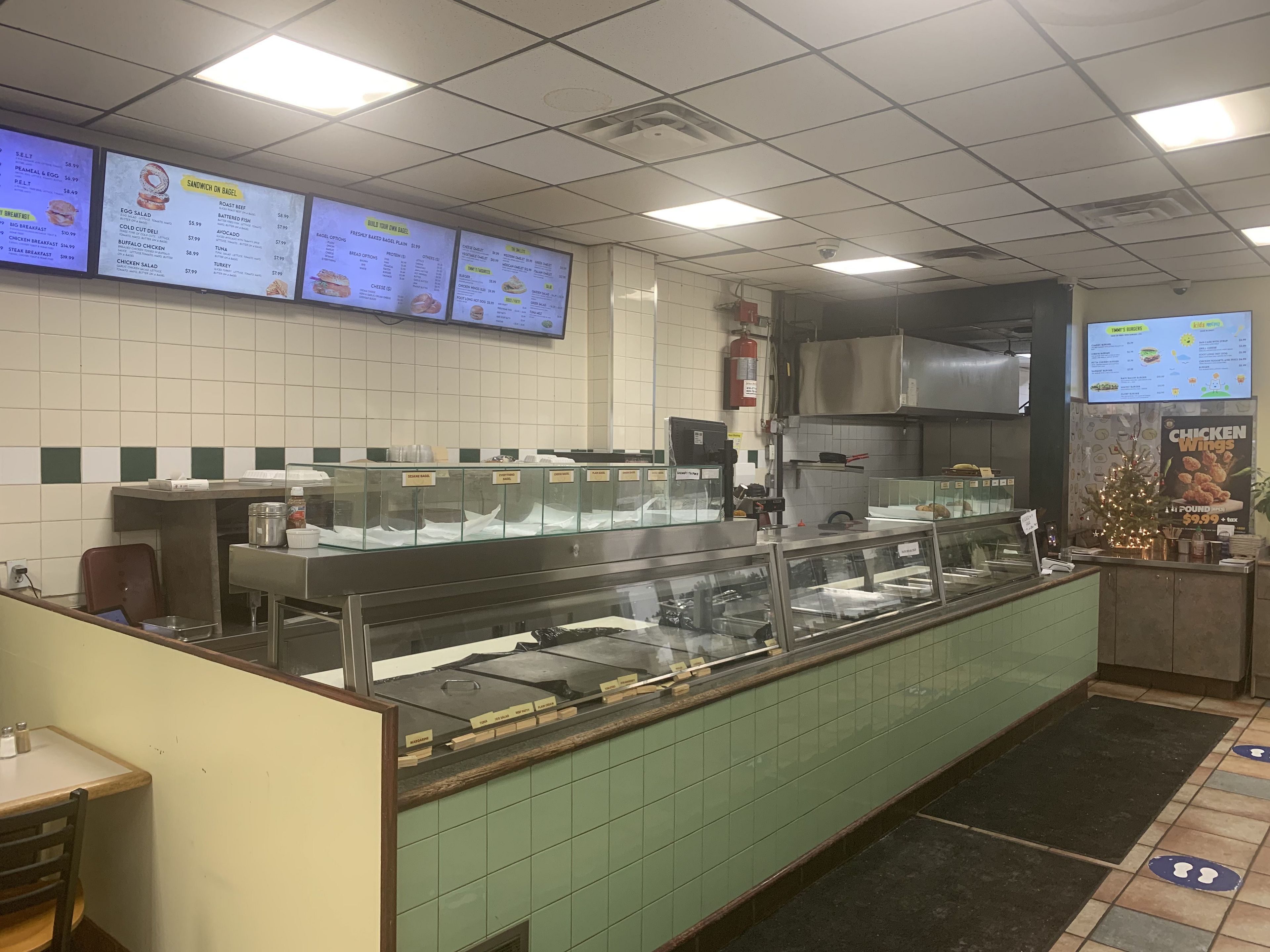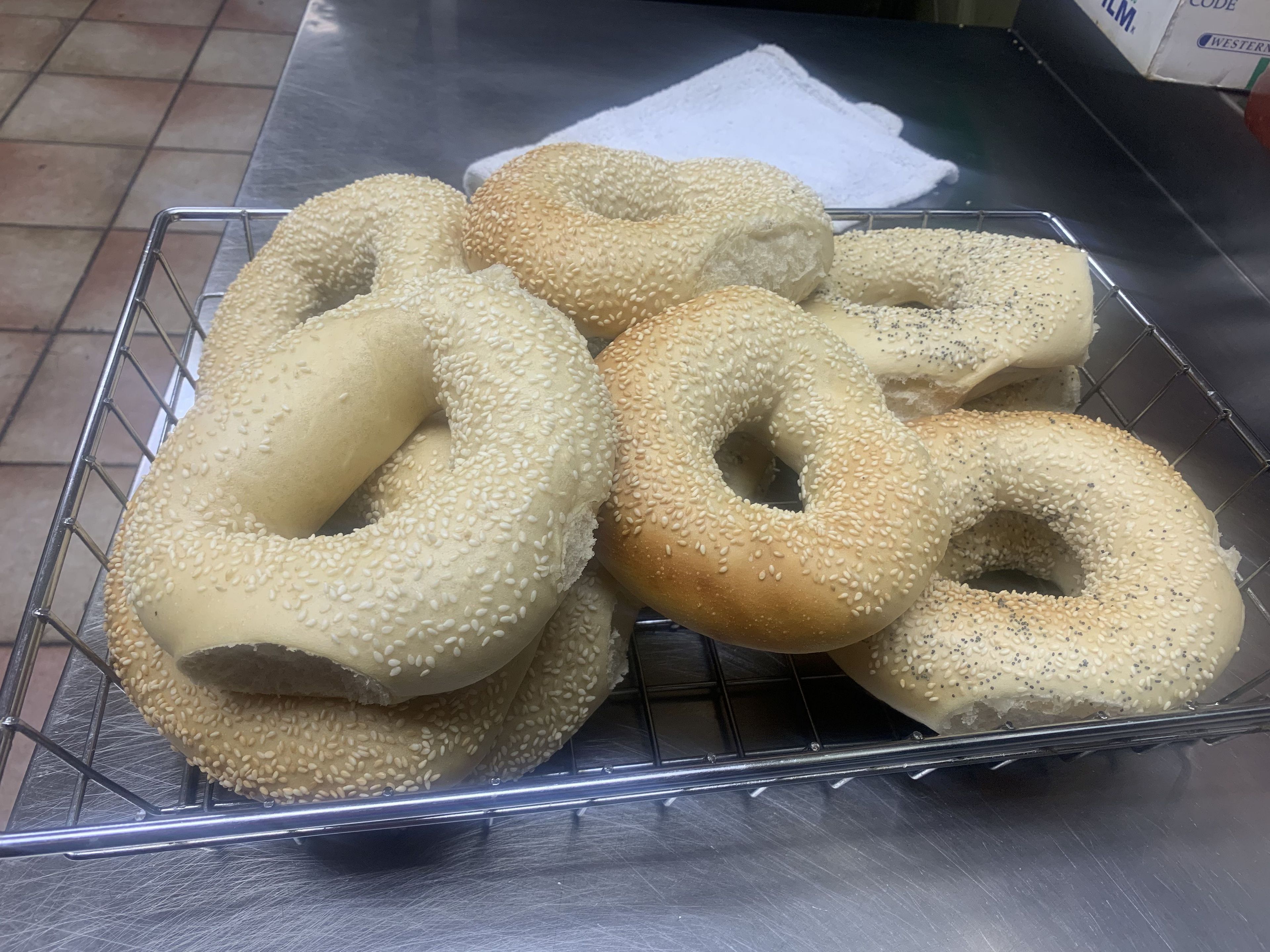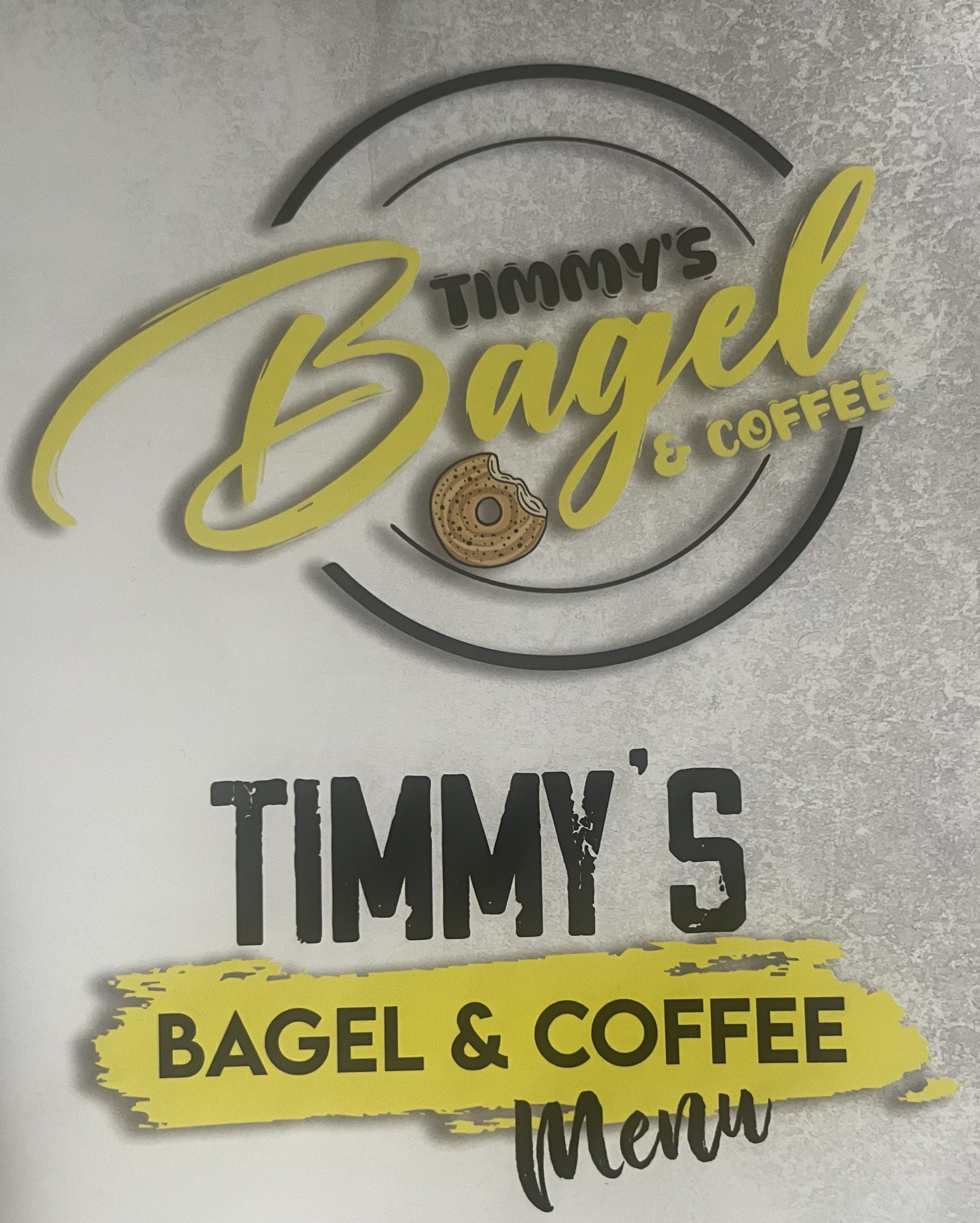 • Menu includes bagels, coffee, muffins, breakfast, and lunch options.