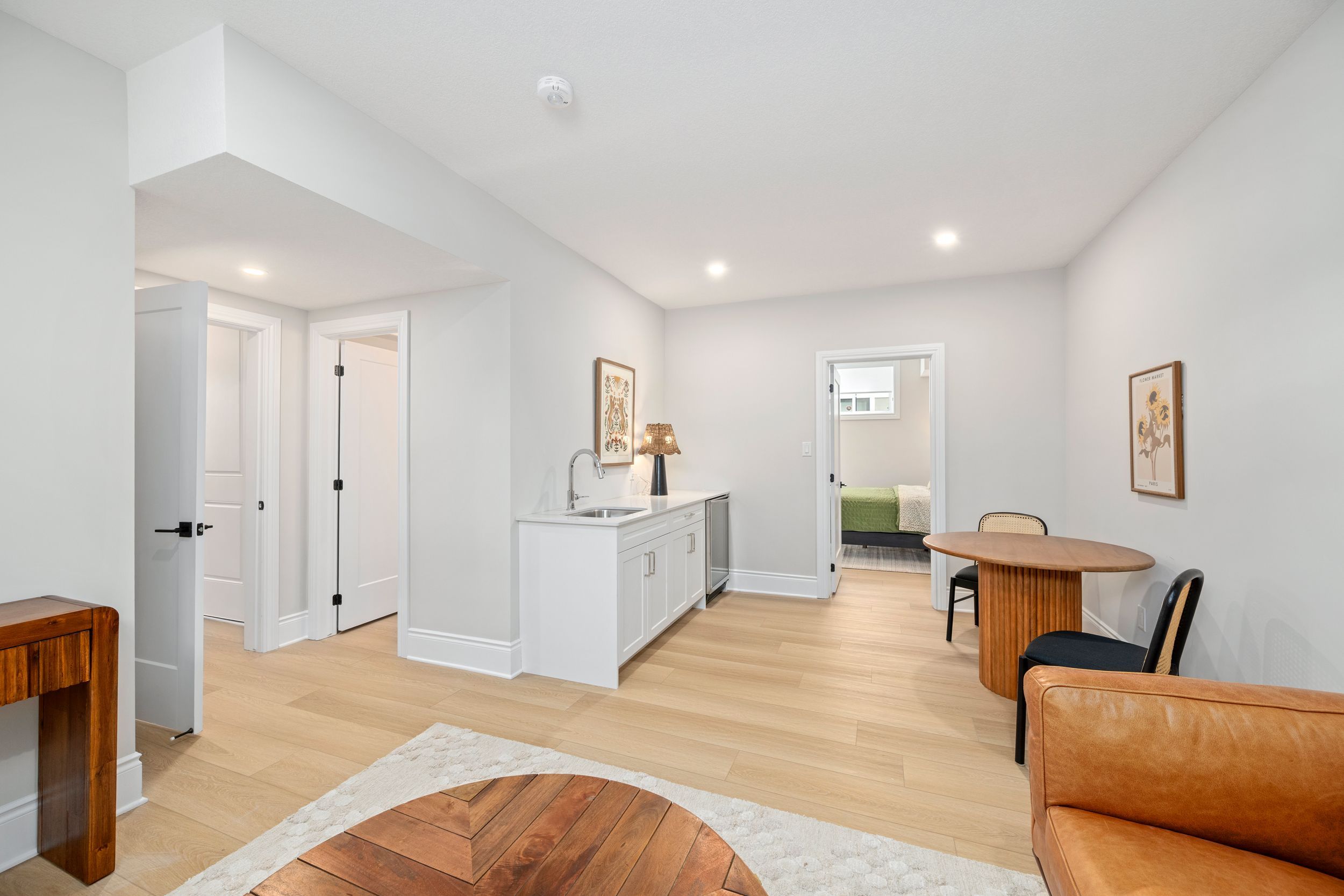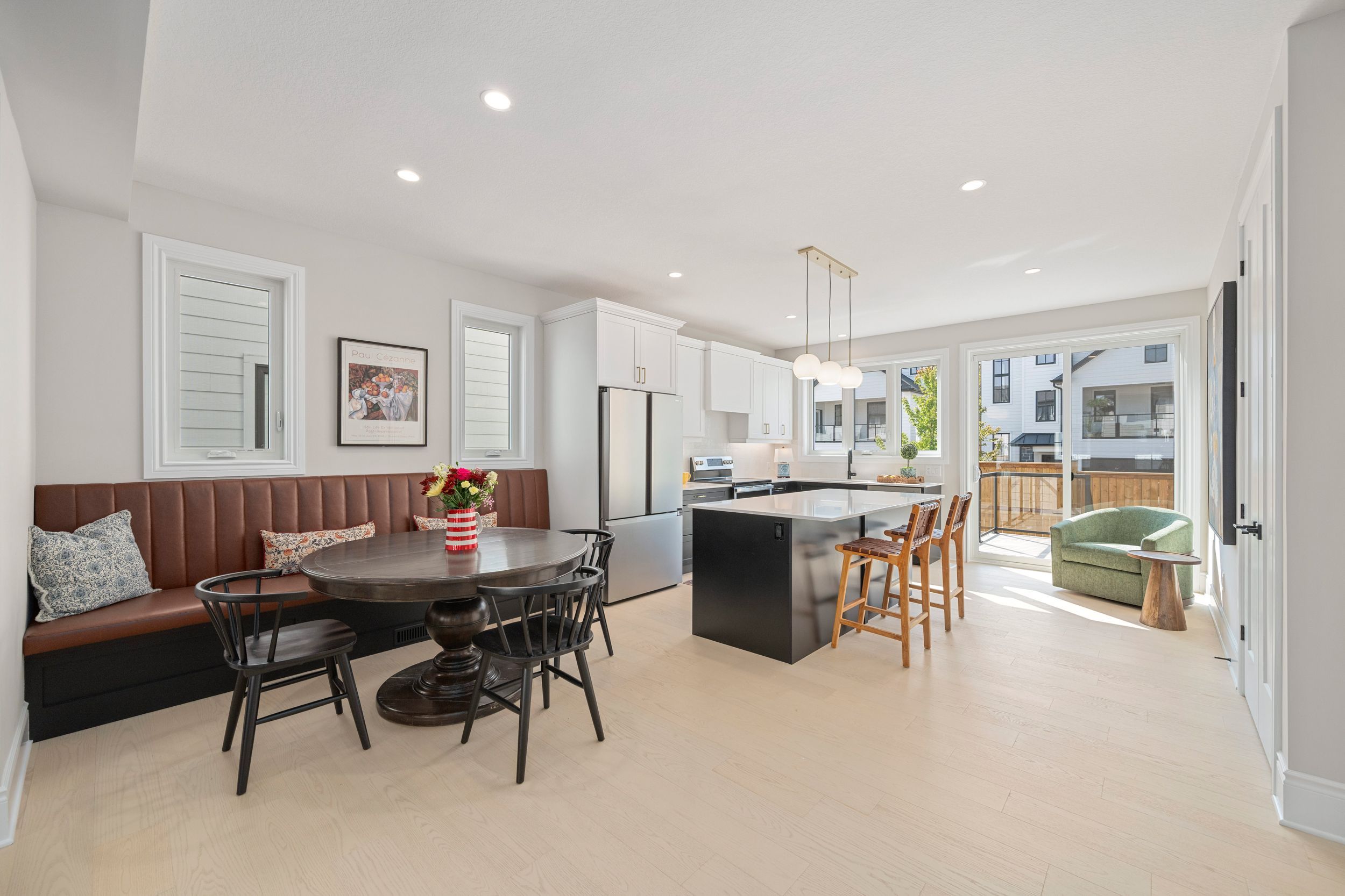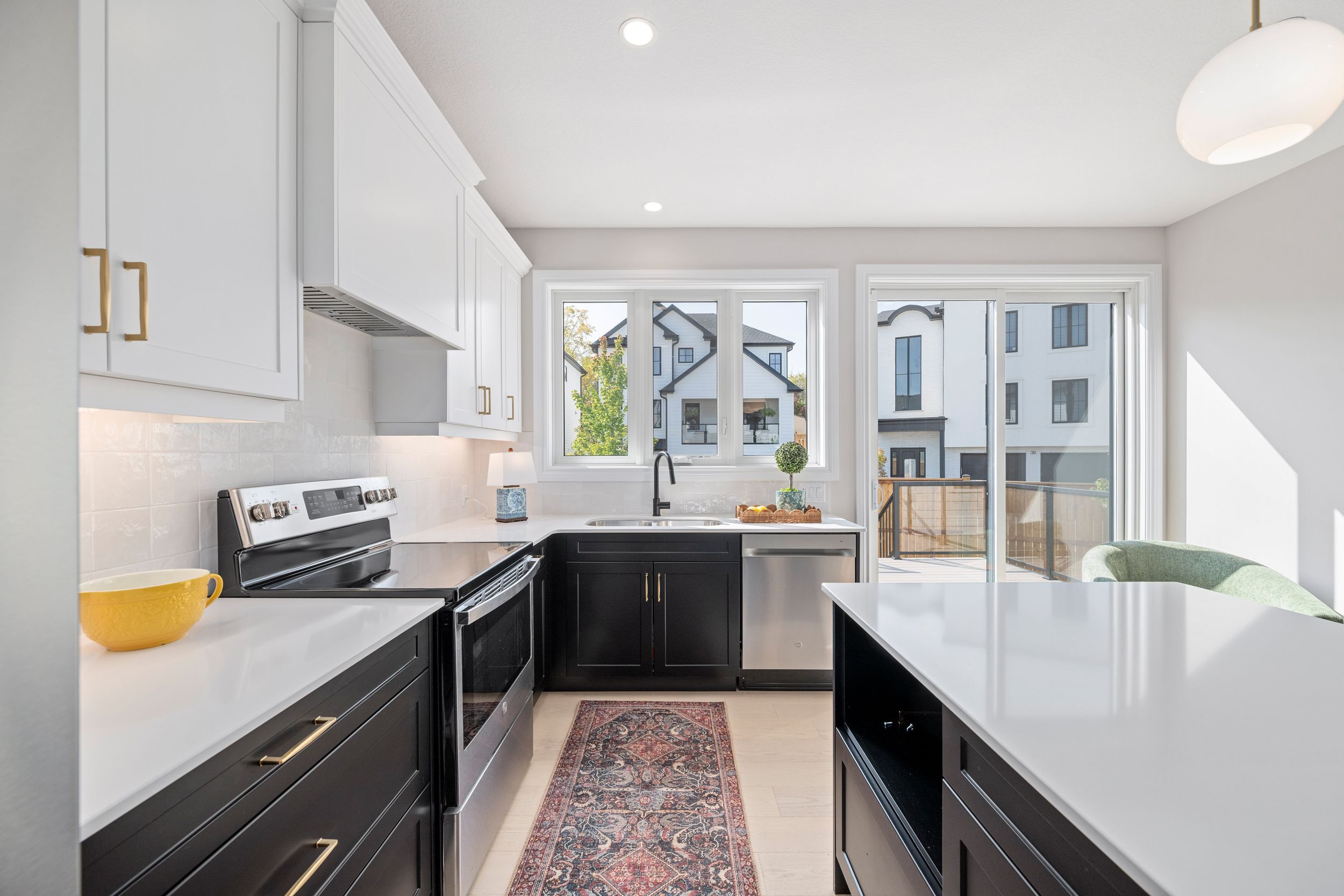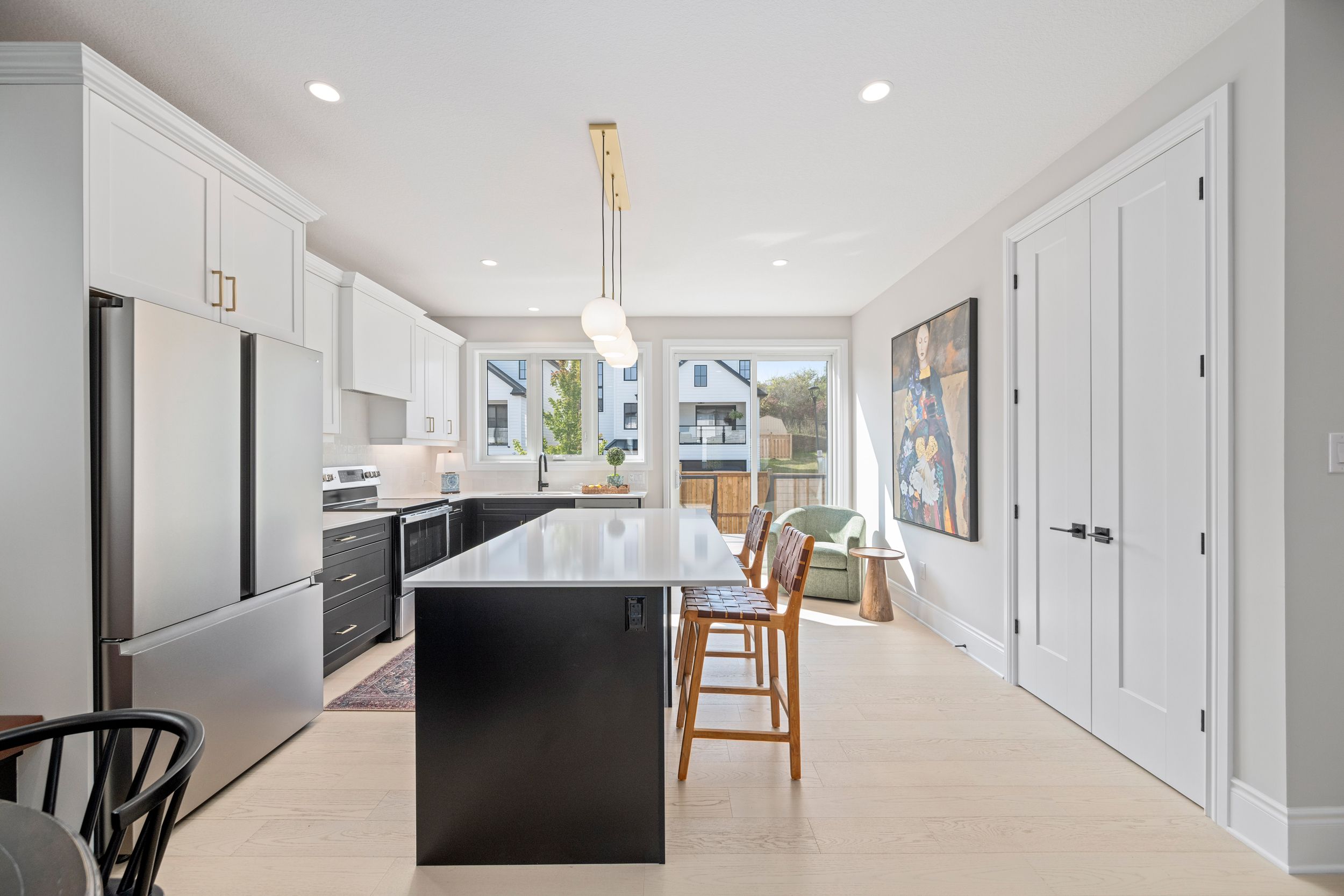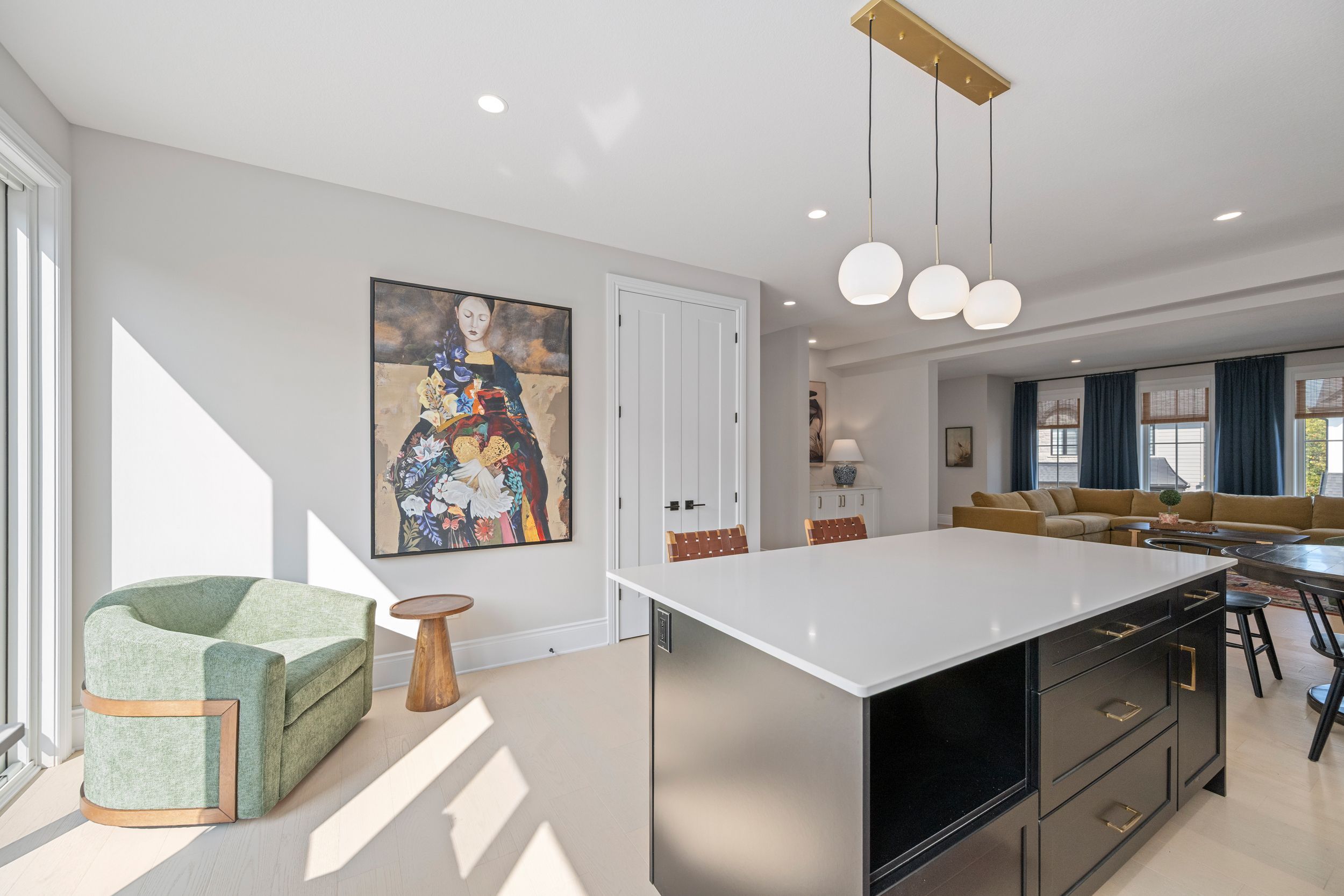 • Modern kitchen with quartz surfaces and seamless flow to living areas.