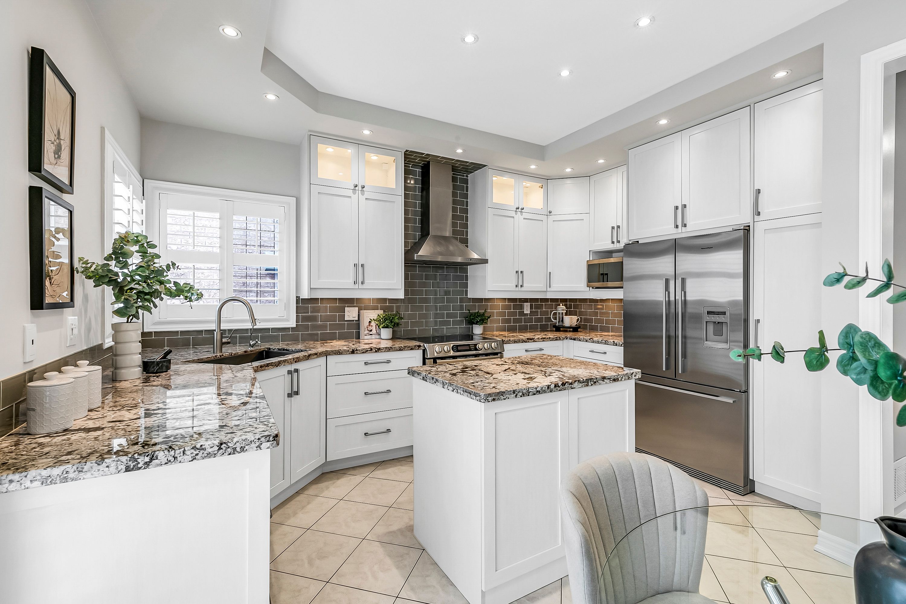 • Modern kitchen with granite countertops and stainless steel appliances.