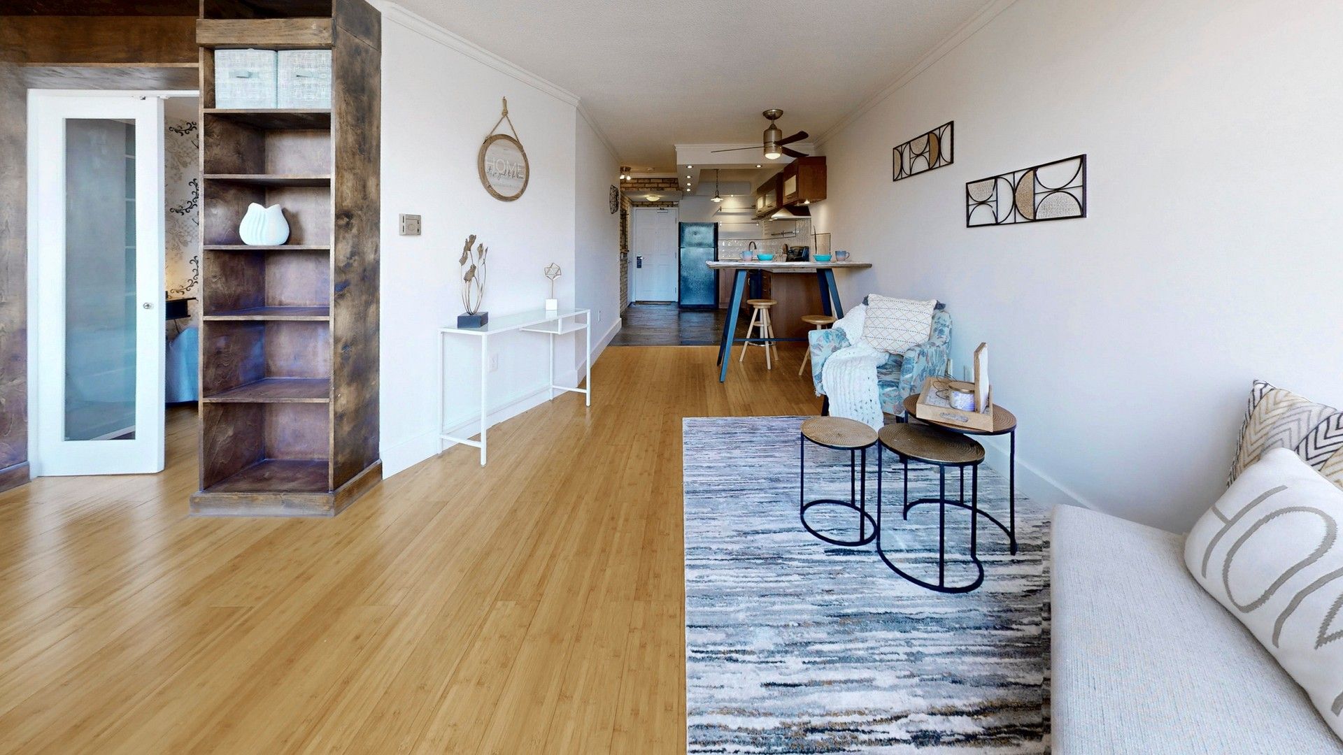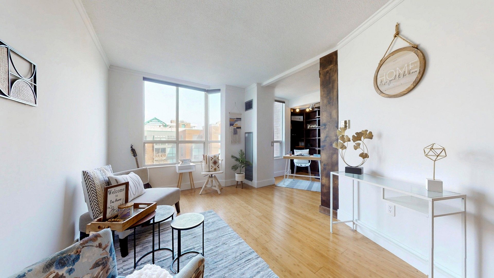 • Bright open-concept suite with large windows and tree-lined views.