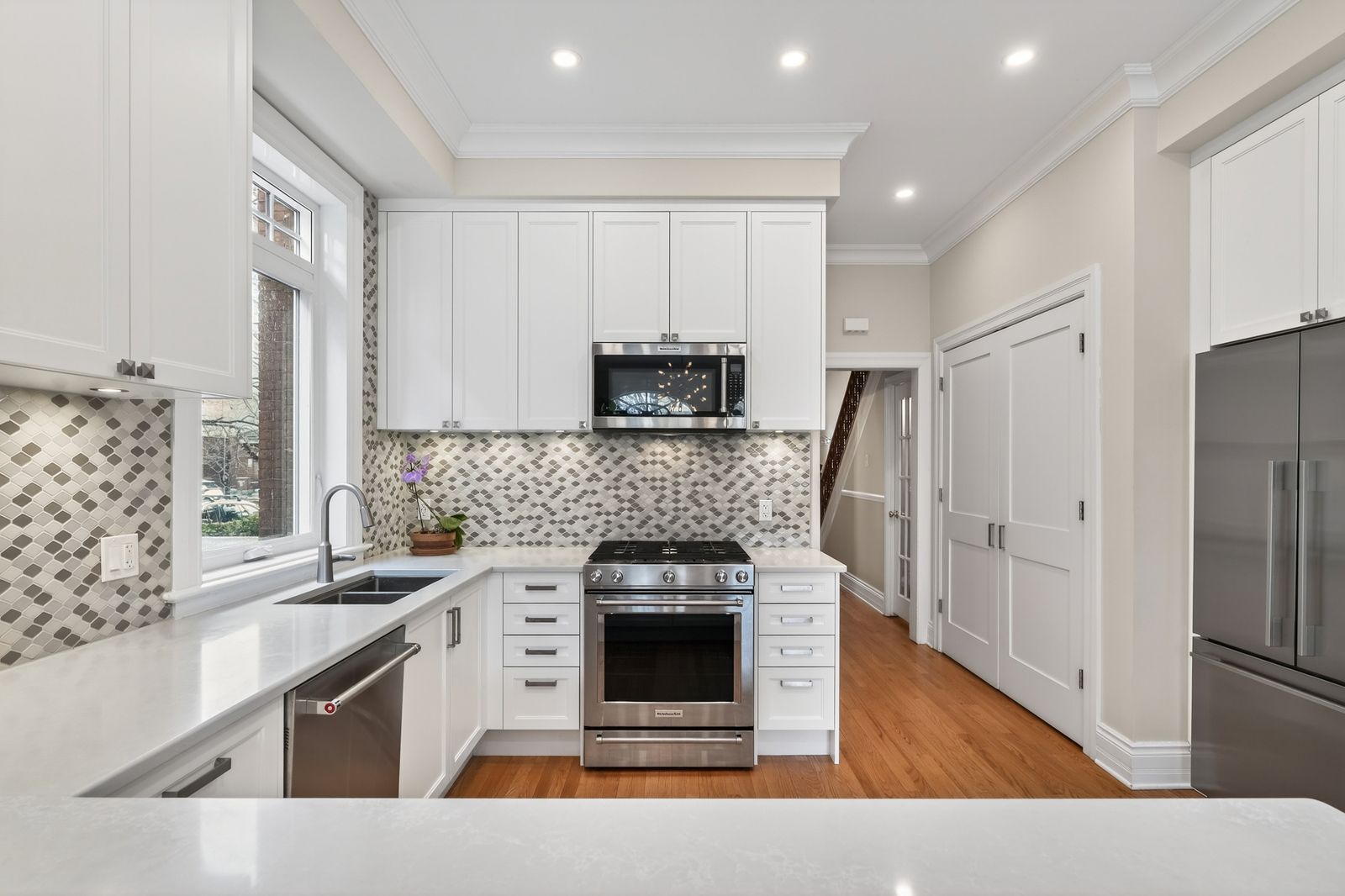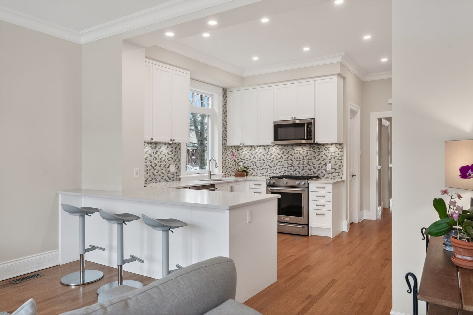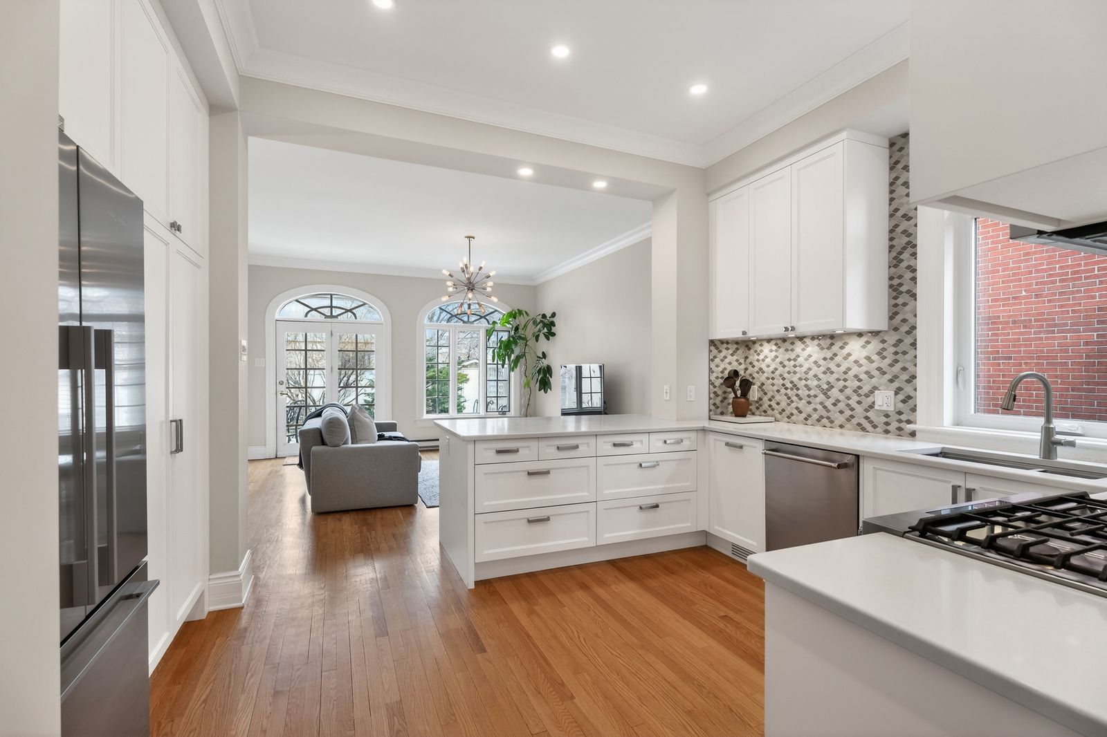• Renovated kitchen flows into a sun-filled family room.