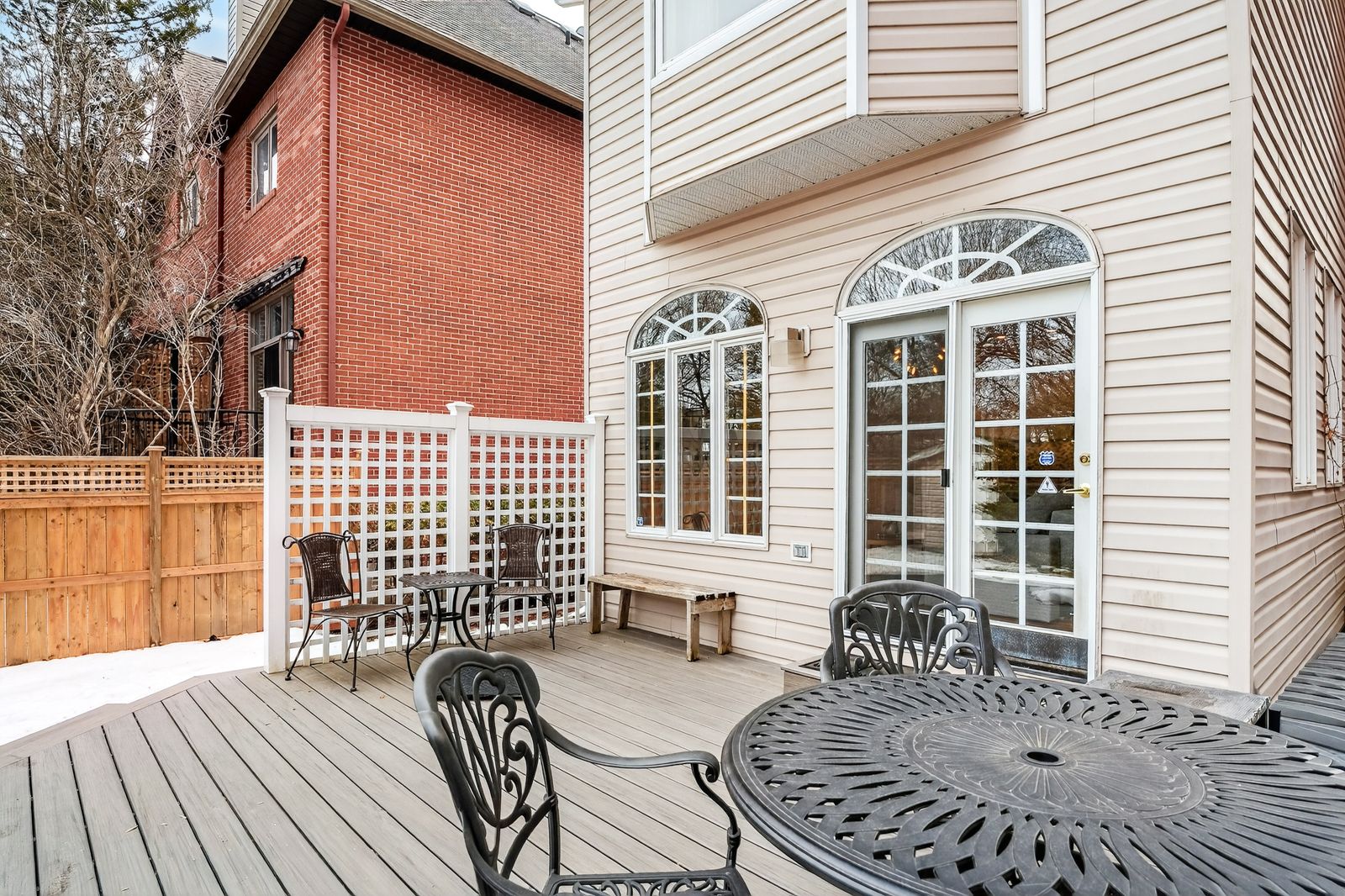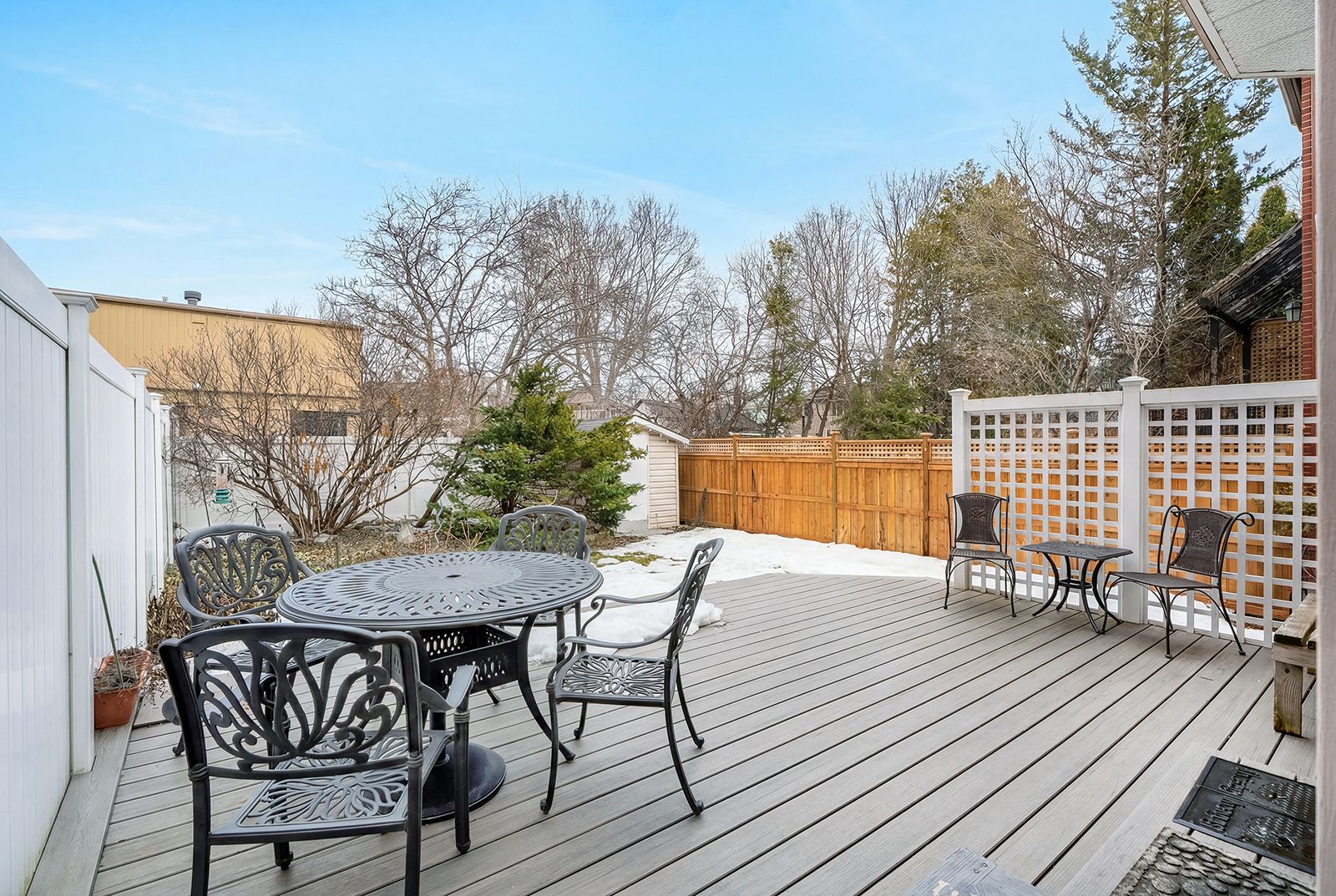 • Deep backyard oasis with flowers and a large composite deck.