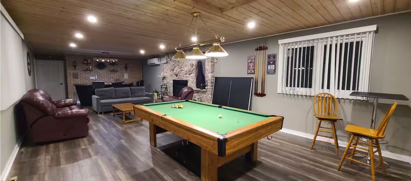 • Open-concept layout includes a fireplace, billiard table, and stylish bar area.