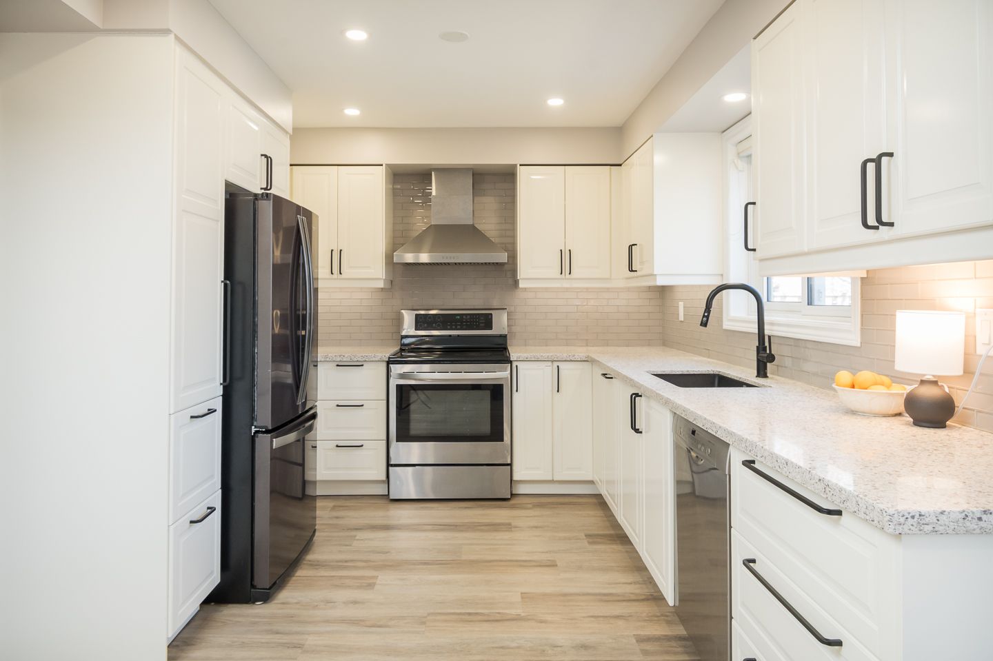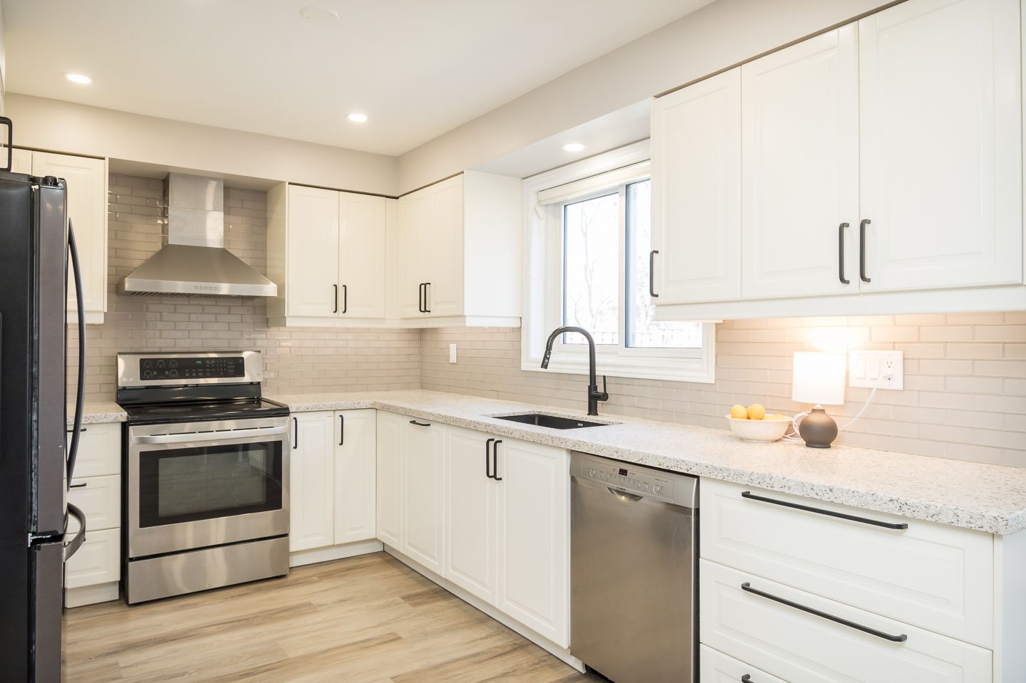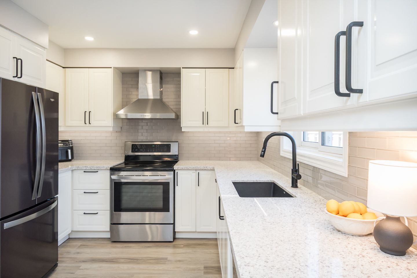 • Renovated kitchen with quartz countertops and stainless steel appliances.