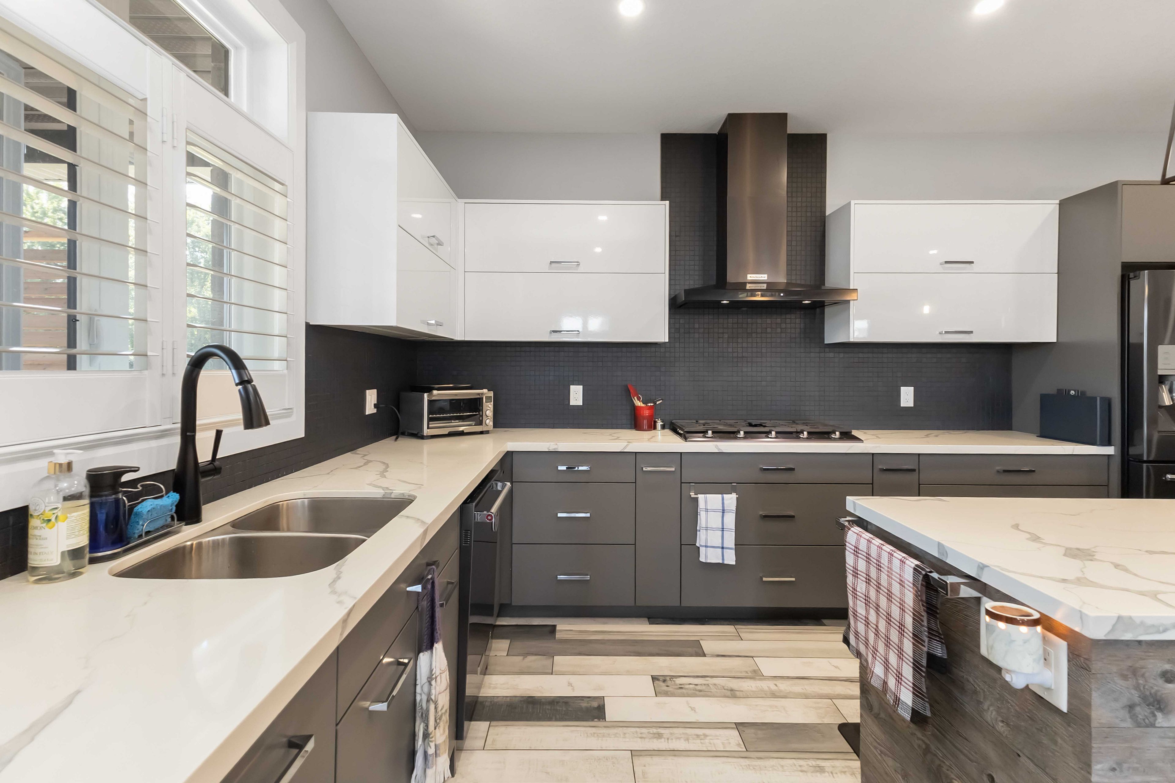 • Gourmet kitchen with high-end European cabinetry and gas cooking appliances.