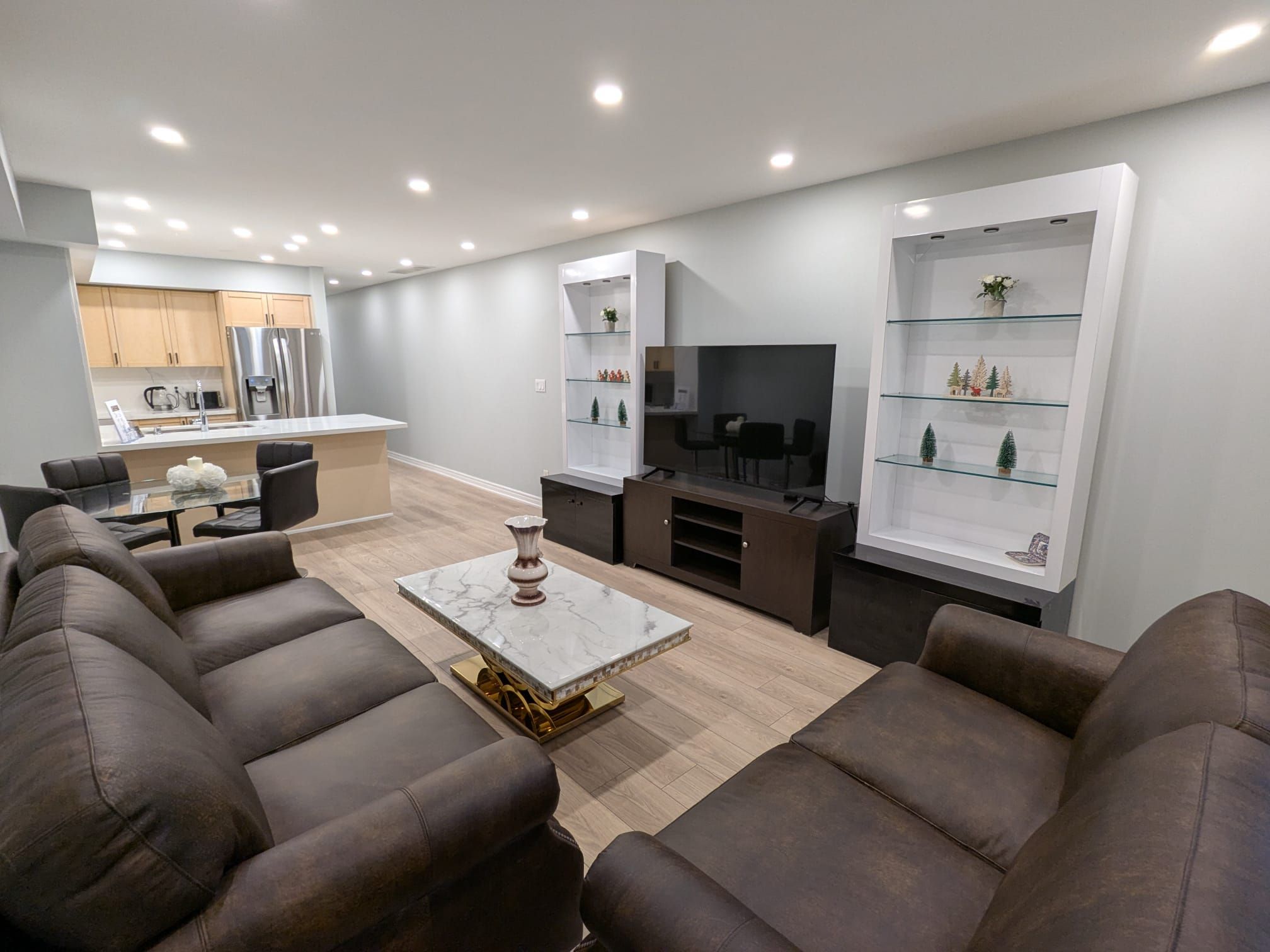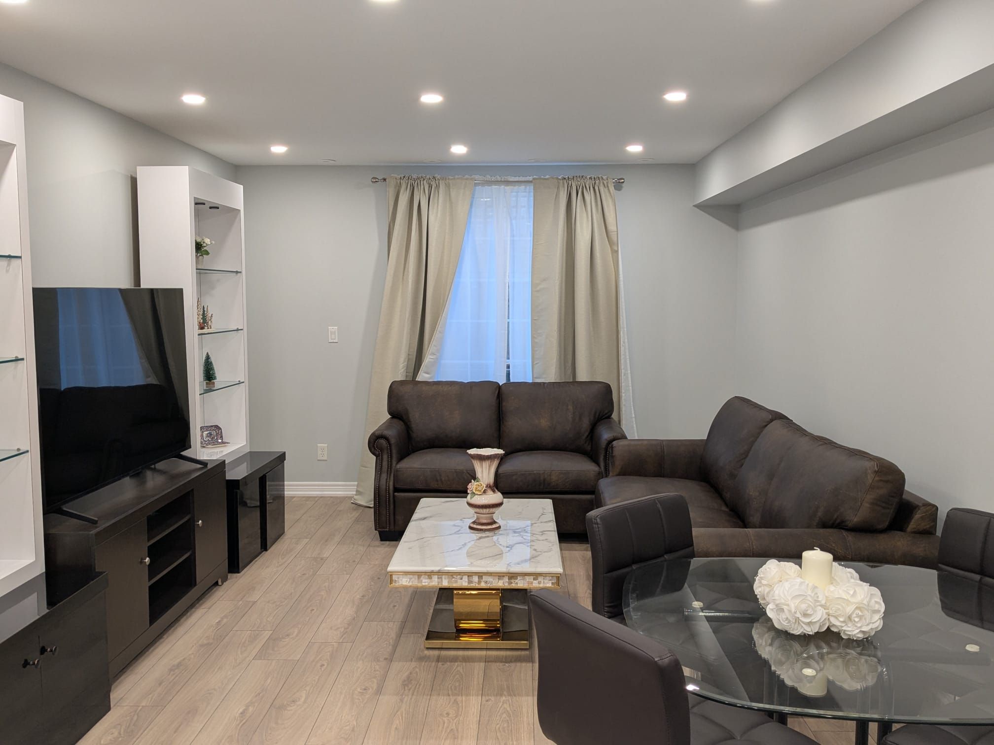 ***** exquisite executive townhome | fully renovated | 3 bed, 3 bath + 2 owned parking spotswelcome to a sanctuary designed for the modern lifestyle. This stunning 1,240 sq. Ft. Executive townhome seamlessly blends contemporary elegance with everyday convenience. Featuring a complete top-to-bottom renovation, this turn-key residence offers three spacious bedrooms, three updated bathrooms, and the rare benefit of two owned parking spaces. Interior highlights:gourmet kitchen: a chef's dream featuring brand-new stainless steel appliances (fridge, stove, dishwasher, hood, and microwave), luxurious countertops, refreshed cabinetry, and a sleek breakfast bar ideal for casual dining or entertaining. Elegant living areas: enter through a grand foyer with premium flooring that sets a sophisticated tone. The open-concept main level is illuminated by pot lights and smooth ceilings, while rich hardwood floors add timeless warmth throughout. Spa-inspired retreats: unwind in tastefully updated washrooms equipped with stylish new vanities. Fresh, professional paint throughout ensures every corner feels crisp and contemporary. Private outdoor oasis: step out to your fully fenced backyard-a private haven perfect for weekend barbecues, relaxation, or safe pet play. Unbeatable location & connectivity:stop commuting and start living in a neighborhood where everything you need is minutes away. Transit: 1 minute to public transit. Recreation: 5 minutes to antibes community centre (pool, gym, courts) and local parks/trails. Dining & shopping: 3 minutes to tim hortons; 3 km to promenade mall; 15 minutes to yorkdale shopping centre. Commute: quick access to highways 401, 407, and 400. Whether you are a growing family, a busy professional, or seeking upscale urban living, this home offers exceptional walkability and top-tier amenities right at your doorstep. Schedule your private viewing today to experience this gem firsthand. Potential.