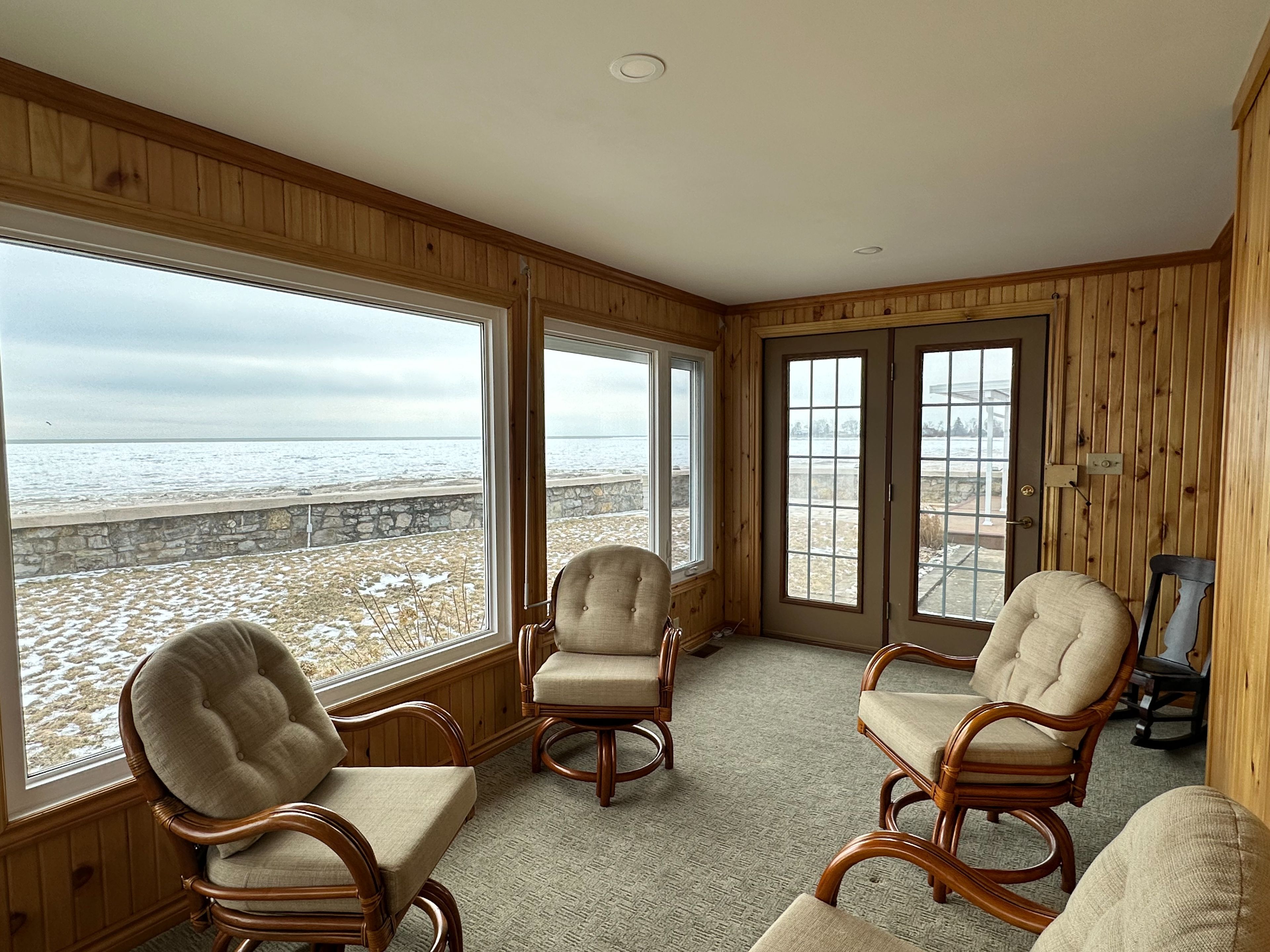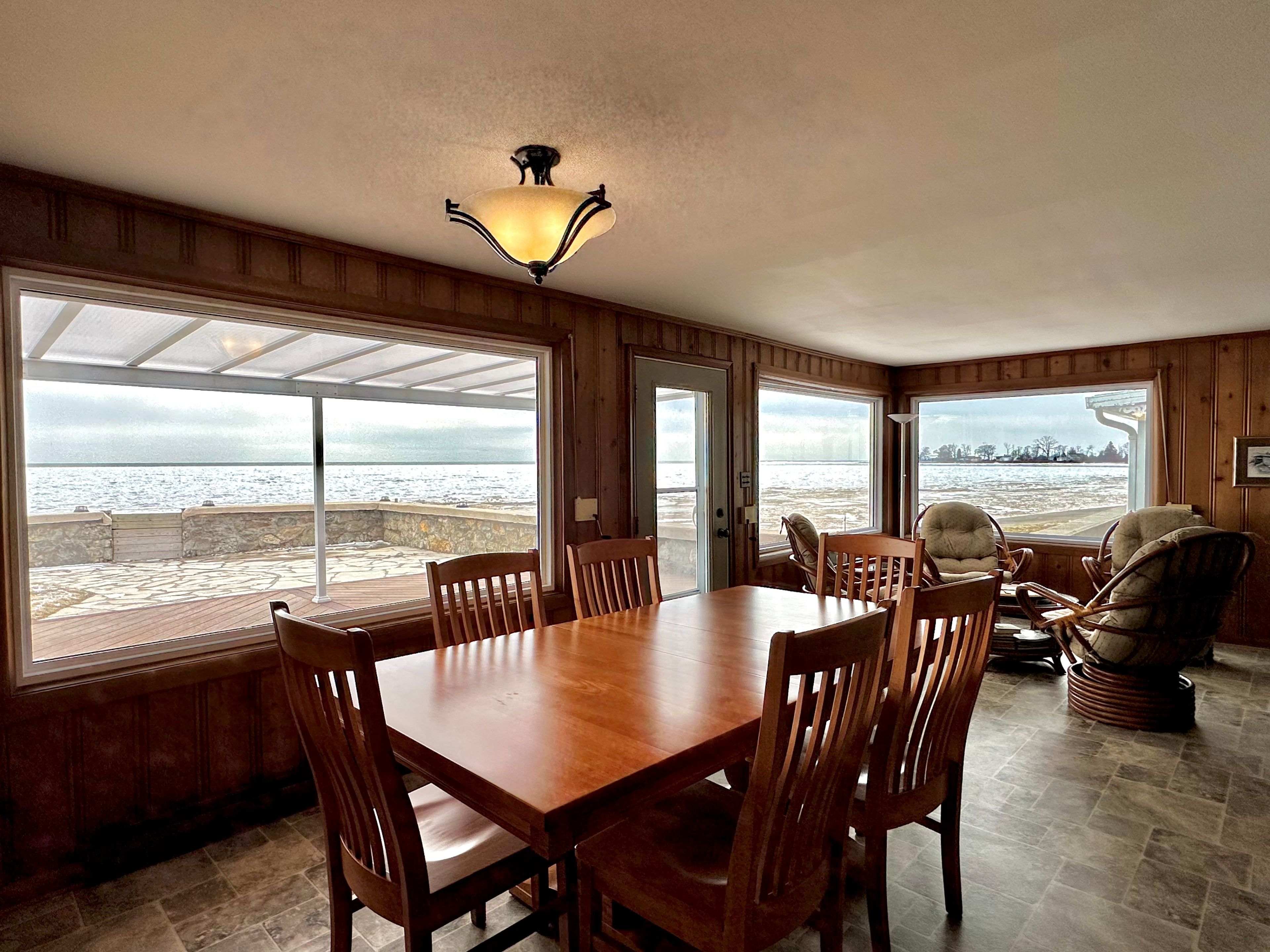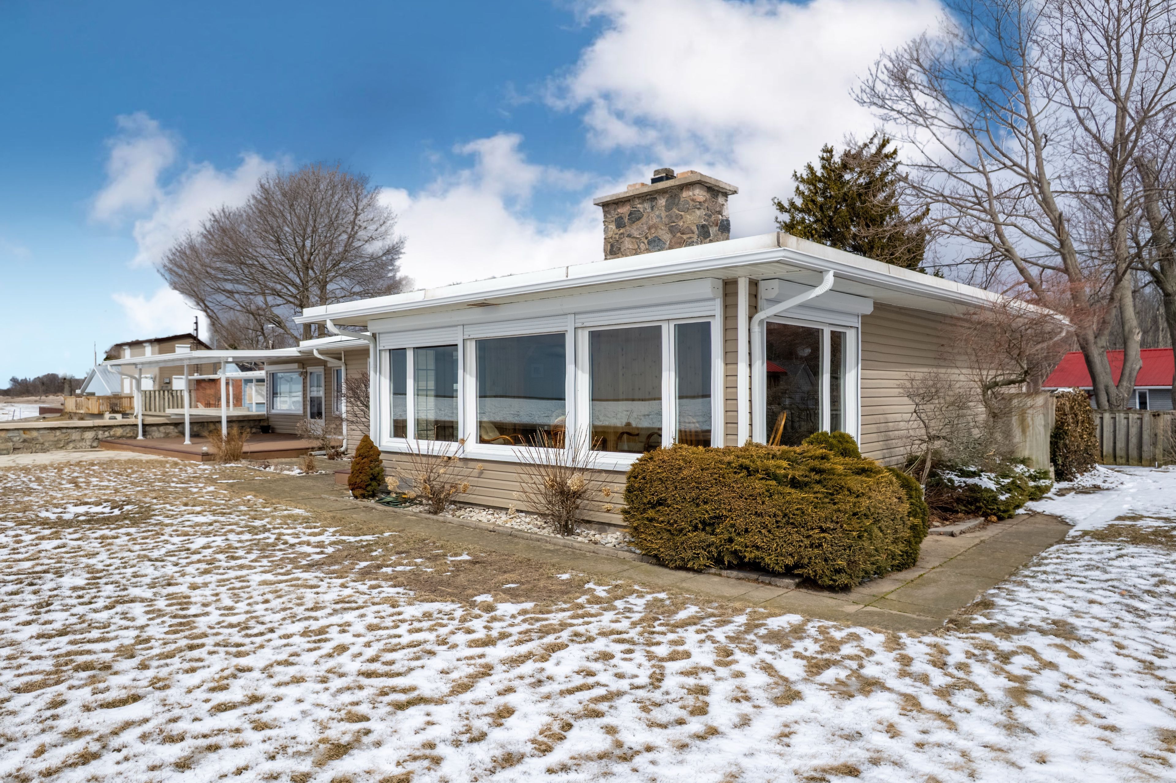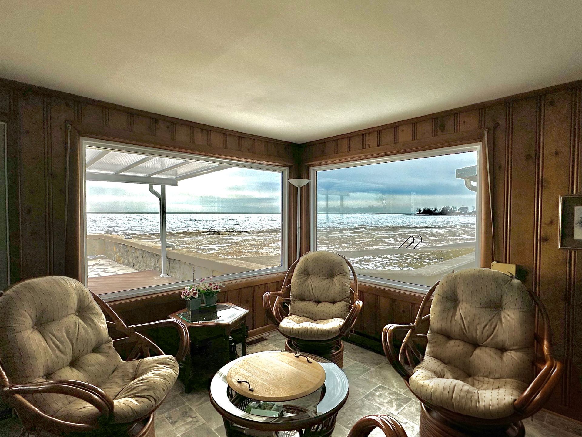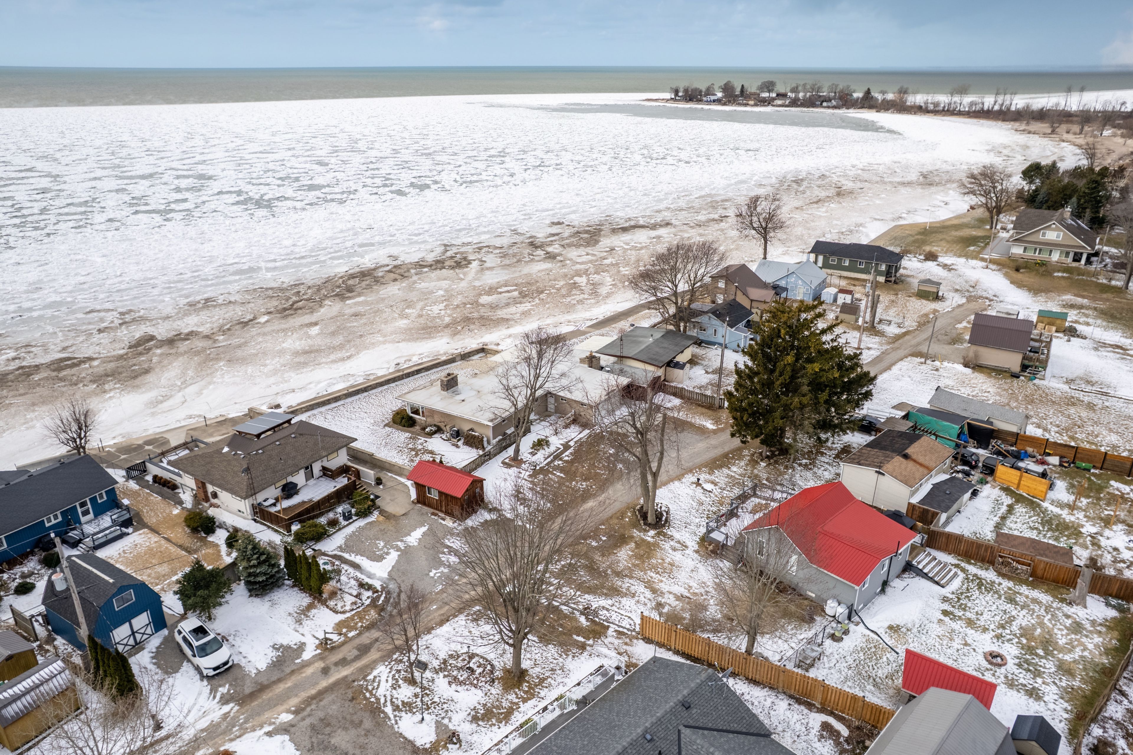 Incredible waterfront opportunity on lake erie! This exceptional waterfront property offers over 100 feet of shoreline, tucked away in a quiet, sought-after enclave. Lovingly maintained by the same owner for more than 20 years, this sprawling ranch-style bungalow showcases breathtaking, unobstructed water views from the moment you step inside. The welcoming interior features an open-concept, updated kitchen with rich wood cabinetry, granite countertops, and a functional peninsula-perfect for entertaining. A separate dining area and sitting room are perfectly positioned to capture serene views of the yard and lake beyond. Unwind in the cozy living room, complete with warm pine paneling and a wood-burning fireplace with airtight insert. Designed with family living in mind, the home offers four spacious bedrooms and two full bathrooms. The primary suite is a true retreat, featuring a generous bedroom, a private sitting area / sunroom overlooking the water, a 4-piece ensuite with separate tub and glass/tile shower, granite counters, and a bonus cedar closet. Comfort and peace of mind are ensured year-round with upgraded insulation, an updated propane furnace, central air, a backup generator, and roll-down shutters. Step outside to enjoy low-maintenance trex-style decking, a retractable awning, flagstone patio, a protective break wall, and beautiful usable outdoor space. The property is complete with a double garage, ample parking, and a storage shed. A rare chance to own a prime stretch of lake erie property-ideal for your luxurious lakeside escape.