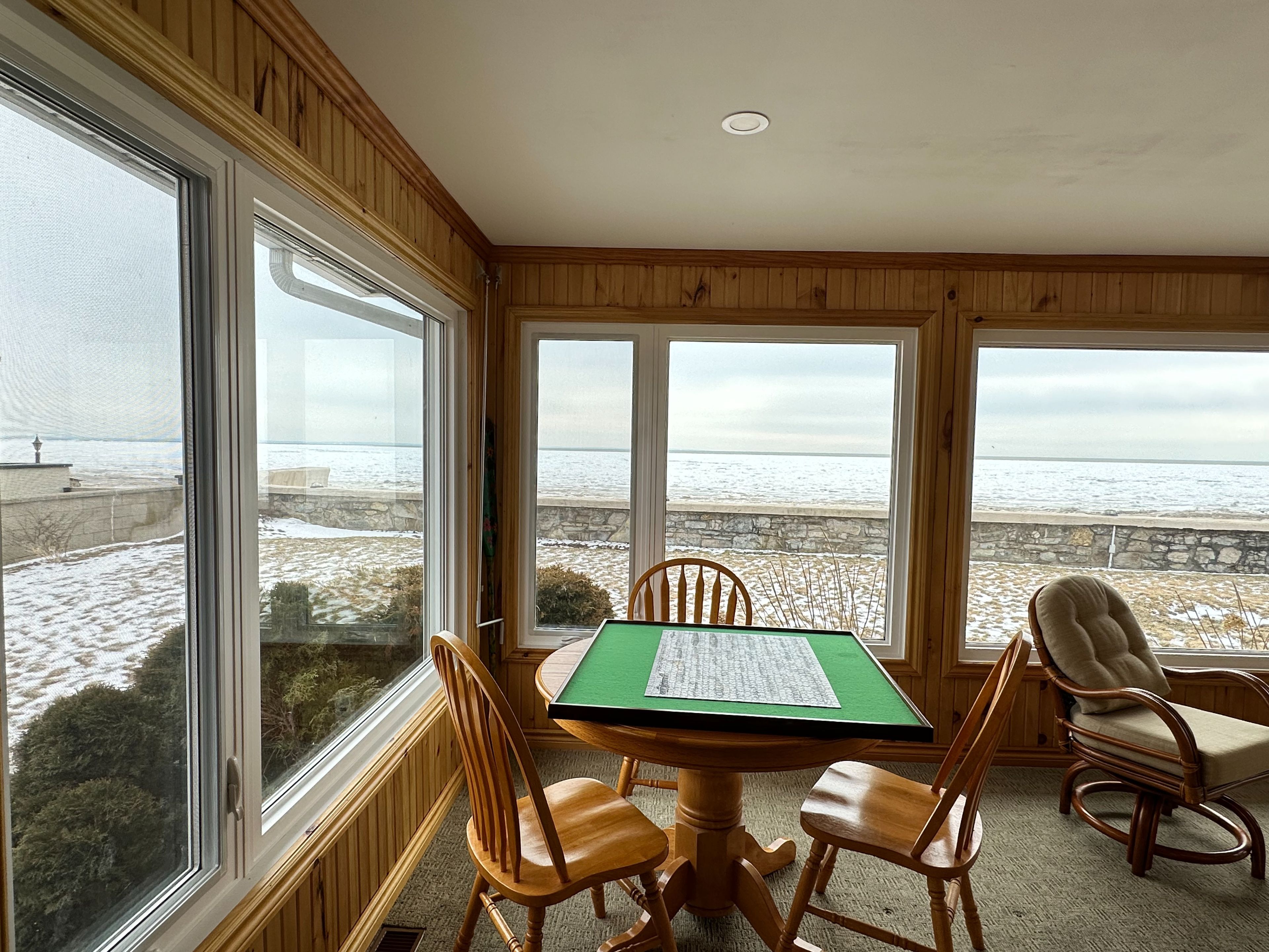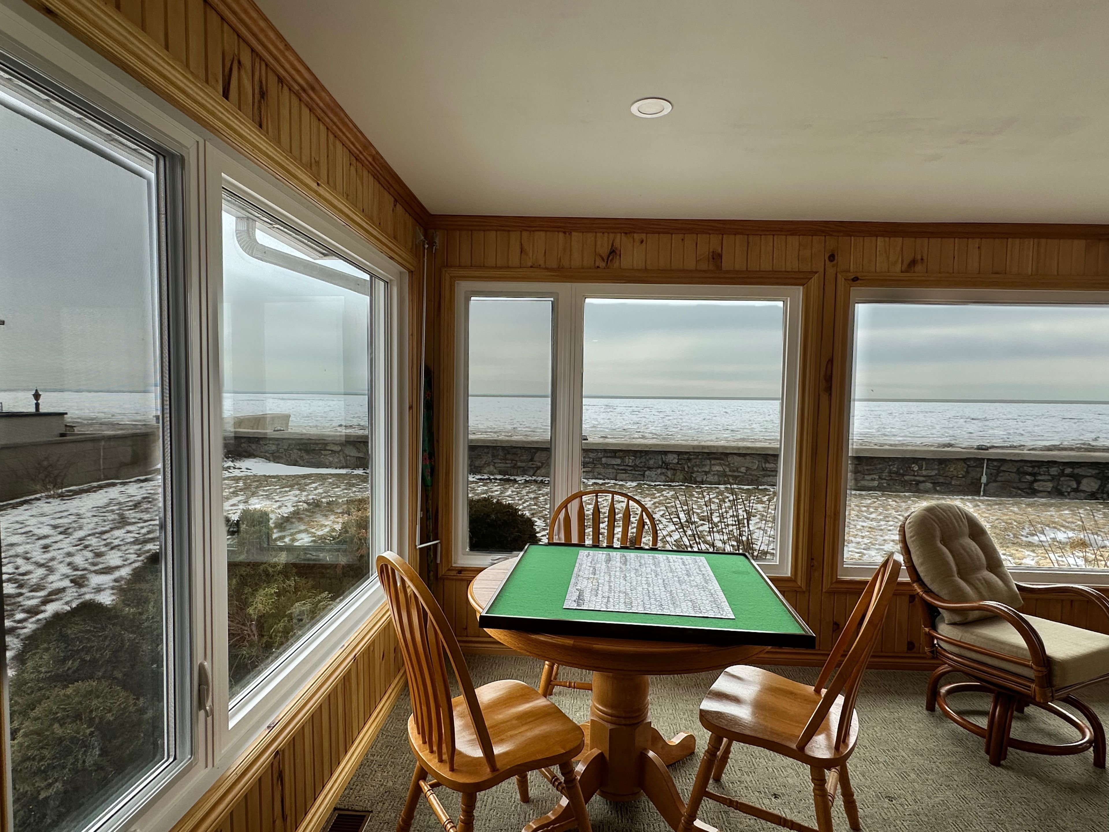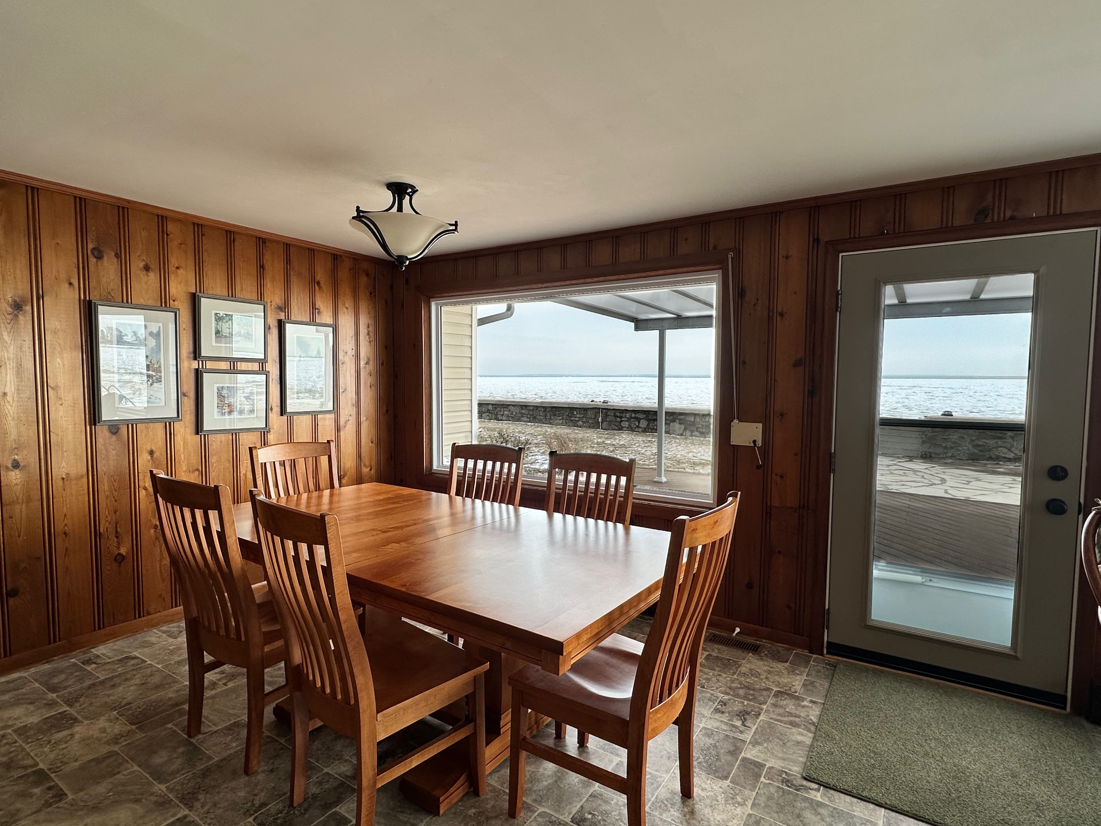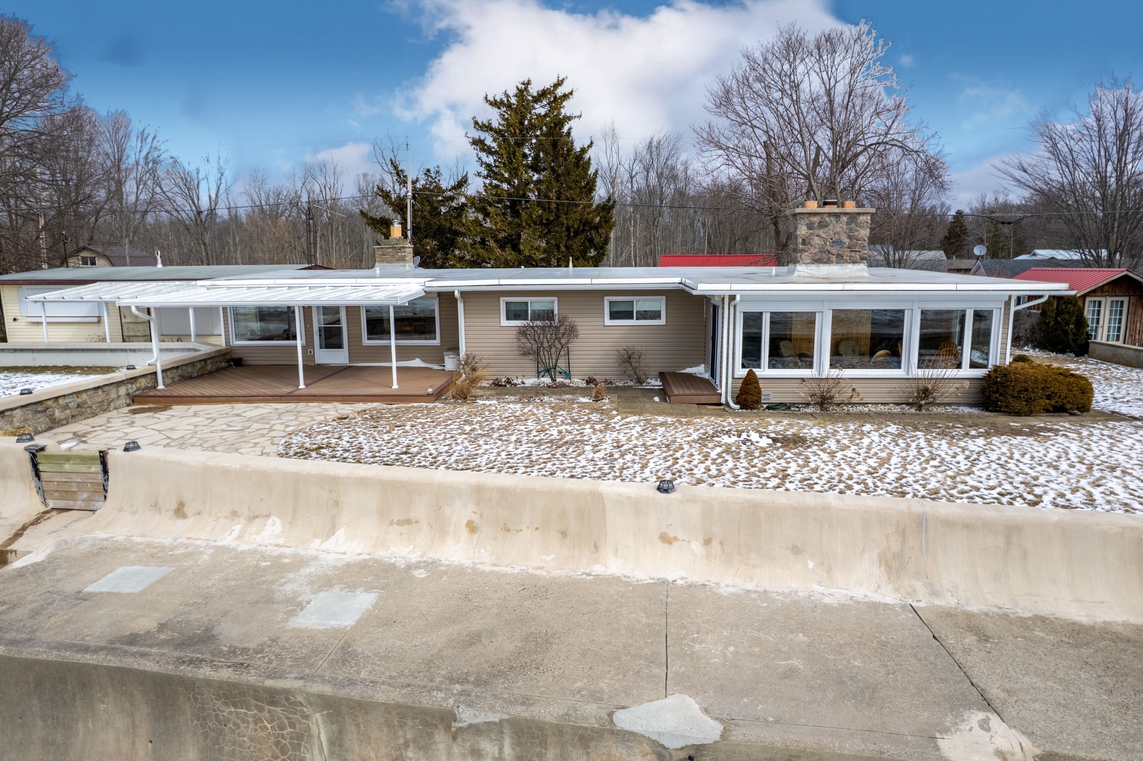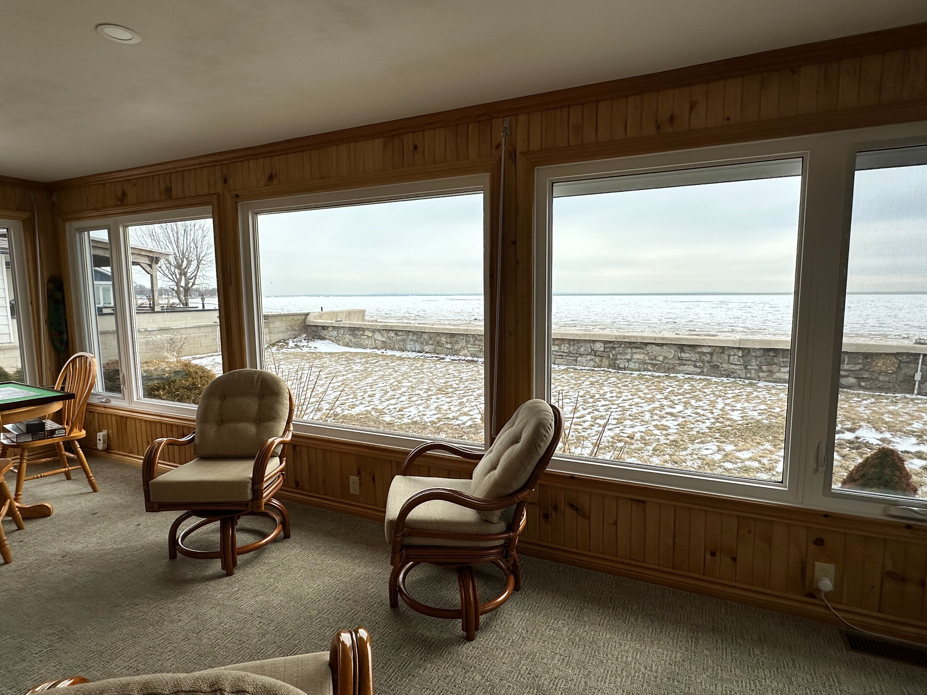 Incredible waterfront opportunity on lake erie! This exceptional waterfront property offers over 100 feet of shoreline, tucked away in a quiet, sought-after enclave. Lovingly maintained by the same owner for more than 20 years, this sprawling ranch-style bungalow showcases breathtaking, unobstructed water views from the moment you step inside. The welcoming interior features an open-concept, updated kitchen with rich wood cabinetry, granite countertops, and a functional peninsula-perfect for entertaining. A separate dining area and sitting room are perfectly positioned to capture serene views of the yard and lake beyond. Unwind in the cozy living room, complete with warm pine paneling and a wood-burning fireplace with airtight insert. Designed with family living in mind, the home offers four spacious bedrooms and two full bathrooms. The primary suite is a true retreat, featuring a generous bedroom, a private sitting area / sunroom overlooking the water, a 4-piece ensuite with separate tub and glass/tile shower, granite counters, and a bonus cedar closet. Comfort and peace of mind are ensured year-round with upgraded insulation, an updated propane furnace, central air, a backup generator, and roll-down shutters. Step outside to enjoy low-maintenance trex-style decking, a retractable awning, flagstone patio, a protective break wall, and beautiful usable outdoor space. The property is complete with a double garage, ample parking, and a storage shed. A rare chance to own a prime stretch of lake erie property-ideal for your luxurious lakeside escape.