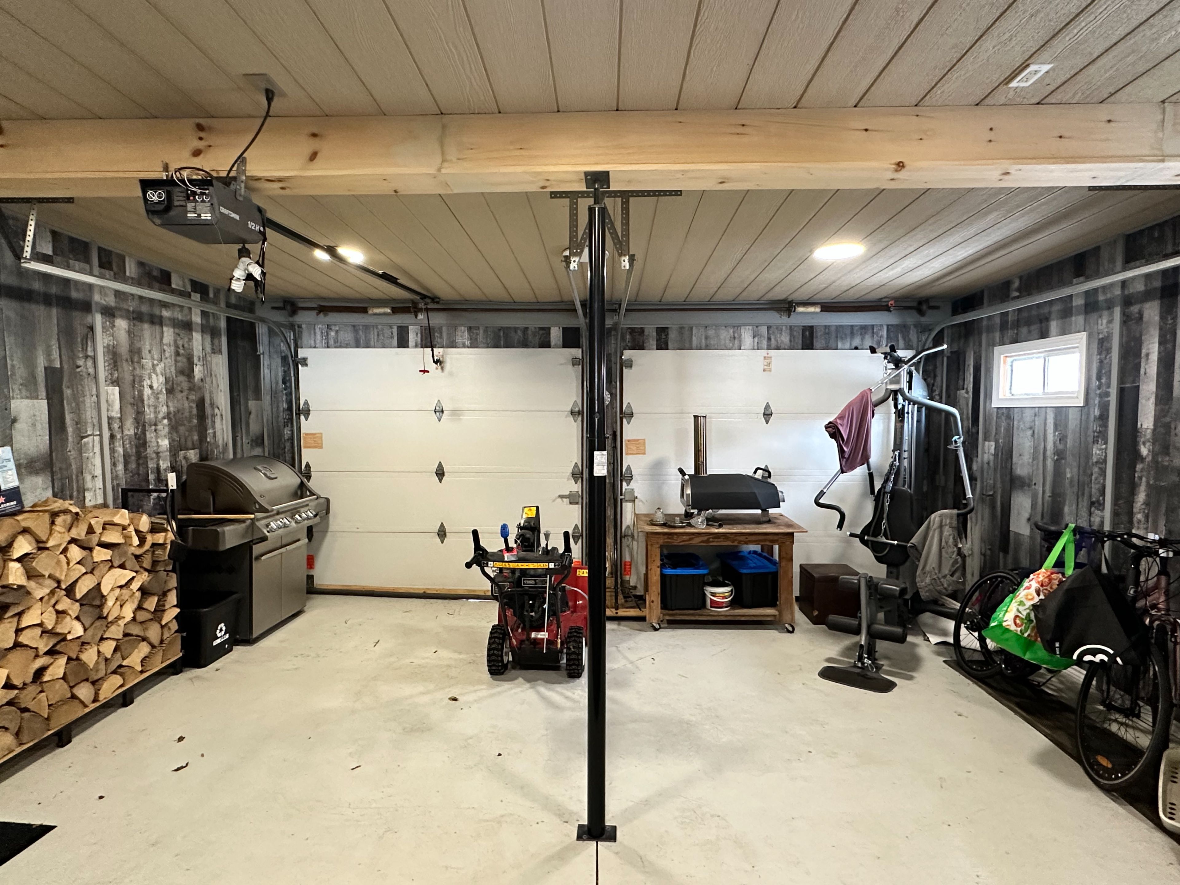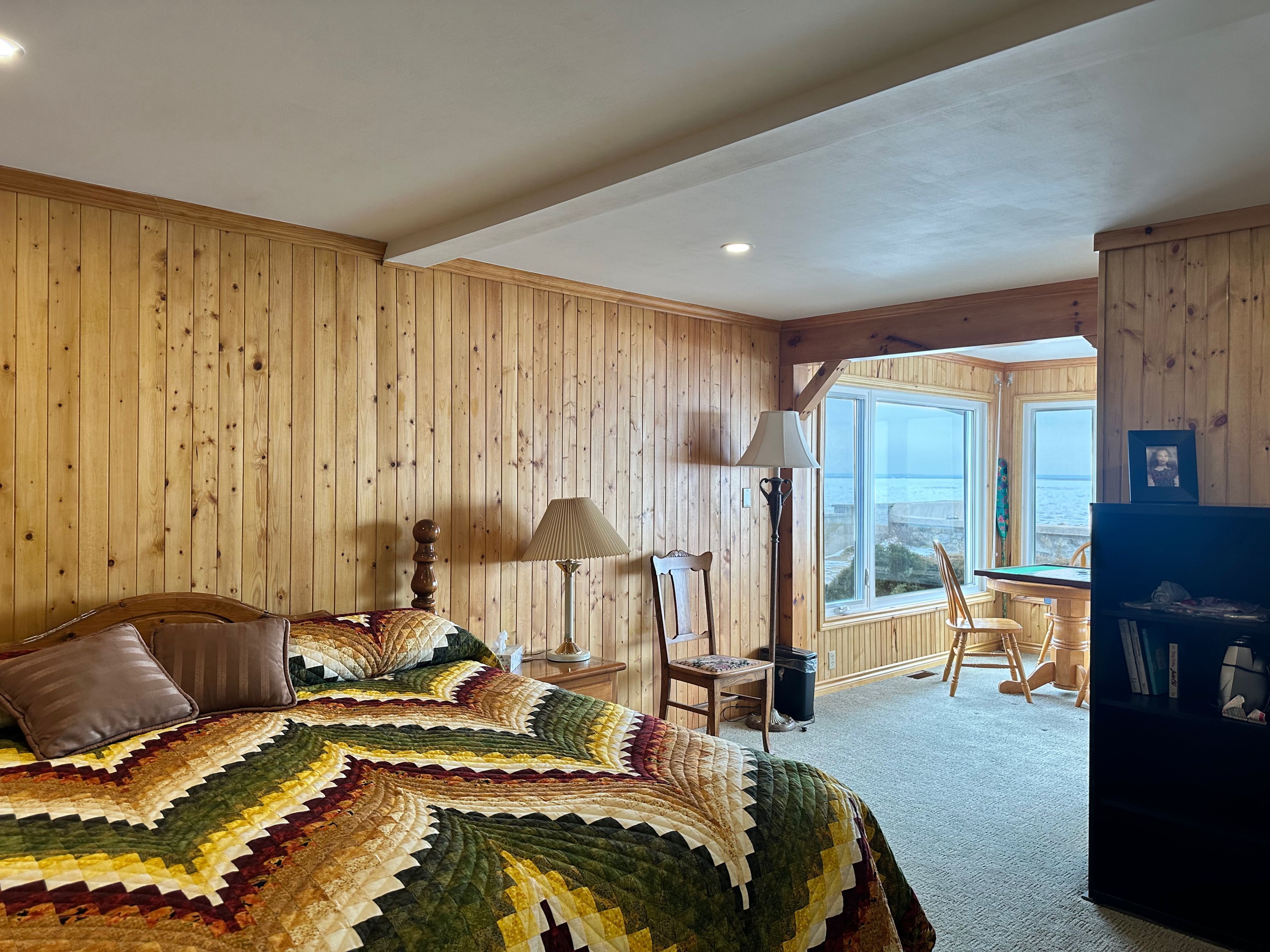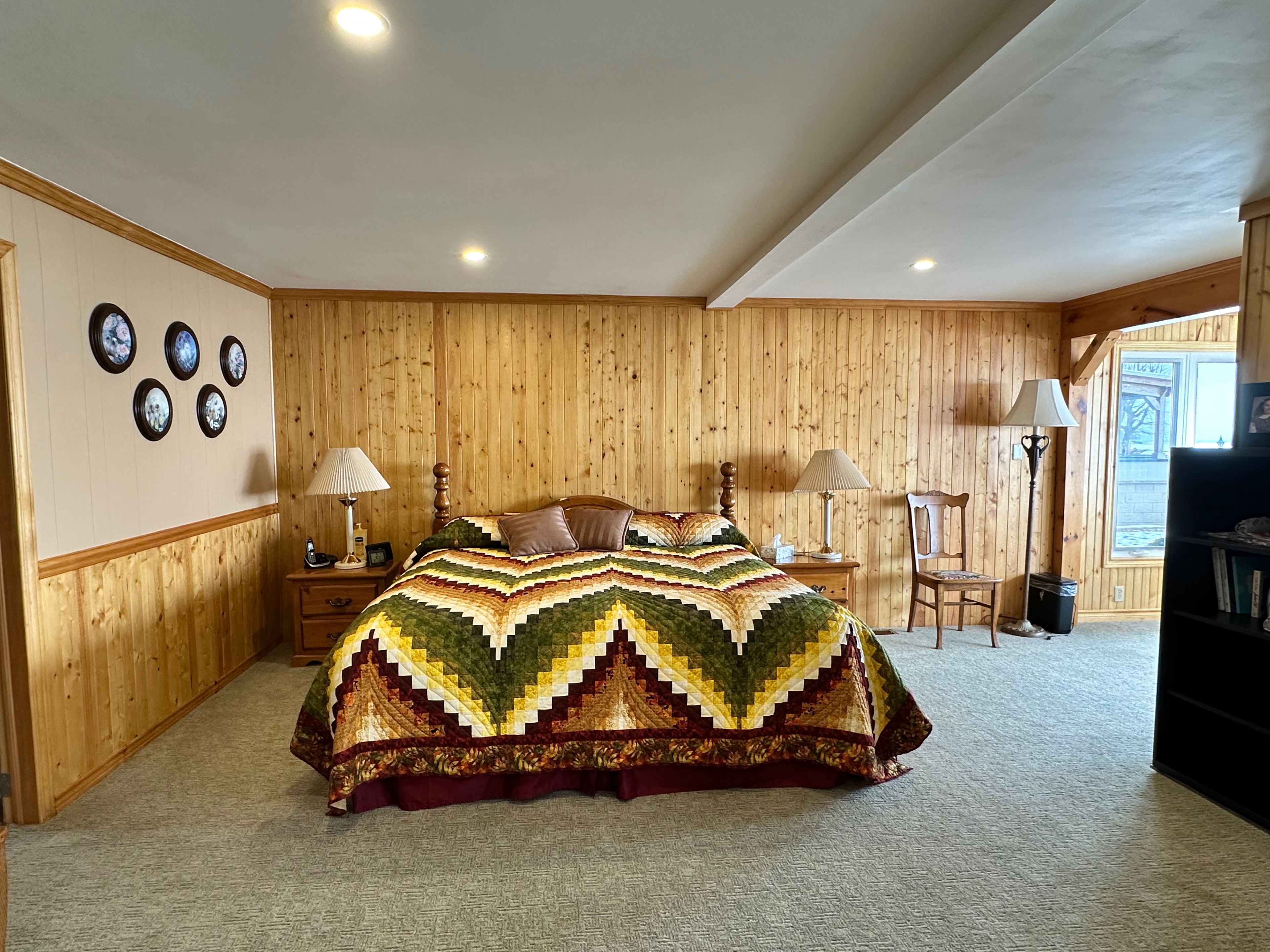 • Cozy living room with a wood-burning fireplace and warm pine paneling.