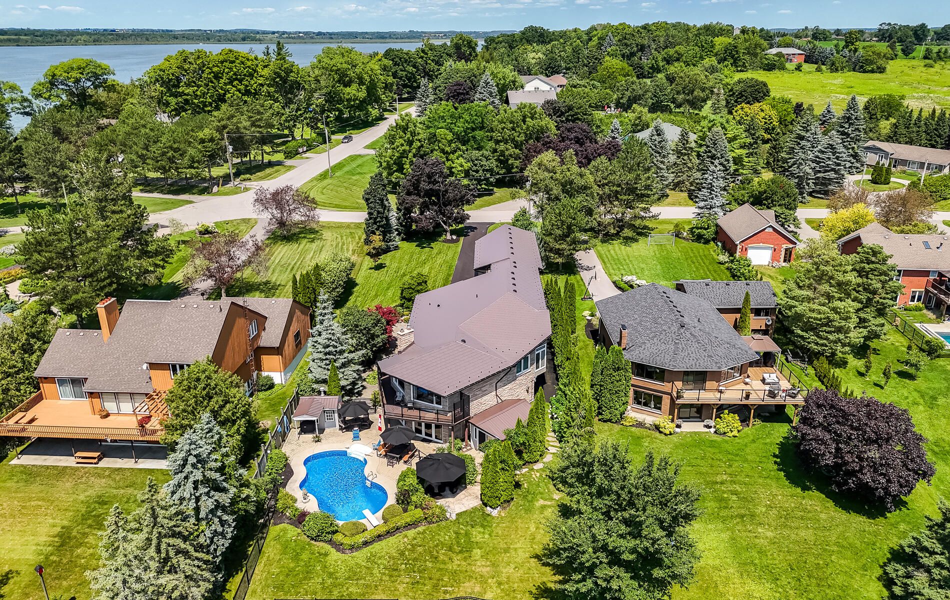 Renovated, improved and lovingly cared for, this property is truly unique. Located on a deep, south facing, lot w/80' of water frontage. Easy enjoyment of fishing/boating/snowmobiling/ice hockey. The custom compass star marks the heated portion on the driveway. Walk the landscaped entrance to the double front door of timeless design. The living room has wall-to-wall windows overlooking the lake and pool. The walkout to the balcony provides a sheltered spot for your morning coffee. The kitchen is spacious and renovated with high-end appliances & granite counters. Hardwood flrs throughout the main level. The primary bdrm has a 5pc ensuite with large steam shower. Walkout from the main fl family room to the covered bbq entertainment area which also provides access to the 20x44 loft over the detached garage. The loft is perfect for work space or party room with built-in sound. The comfortable & family friendly walkout bsmt boasts a brick wood-burning fireplace with w/o to inground pool and patio. 5 fireplaces add warmth to this spacious home no matter what the weather. Landscaped lot gently slopes down to the waterfront. Mature trees and cedars make it private. Two heated garages with 4 access doors & room for 5 cars will intrigue any car enthusiast. Truly worth a look as this home shows pride of ownership on all levels. Situated on a quiet dead-end street. Be in before summer to enjoy all this home has to offer! See attached list of improvements.