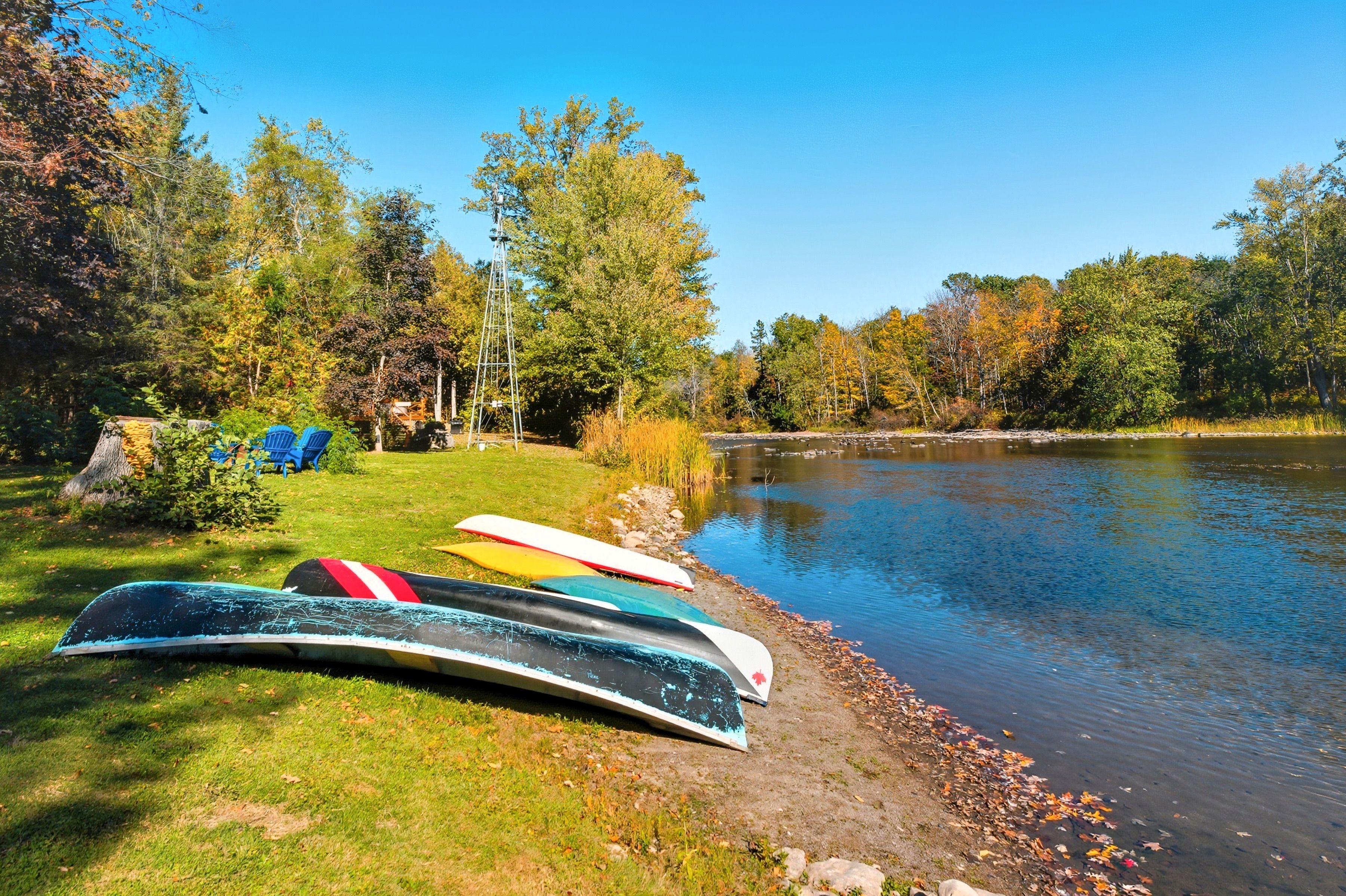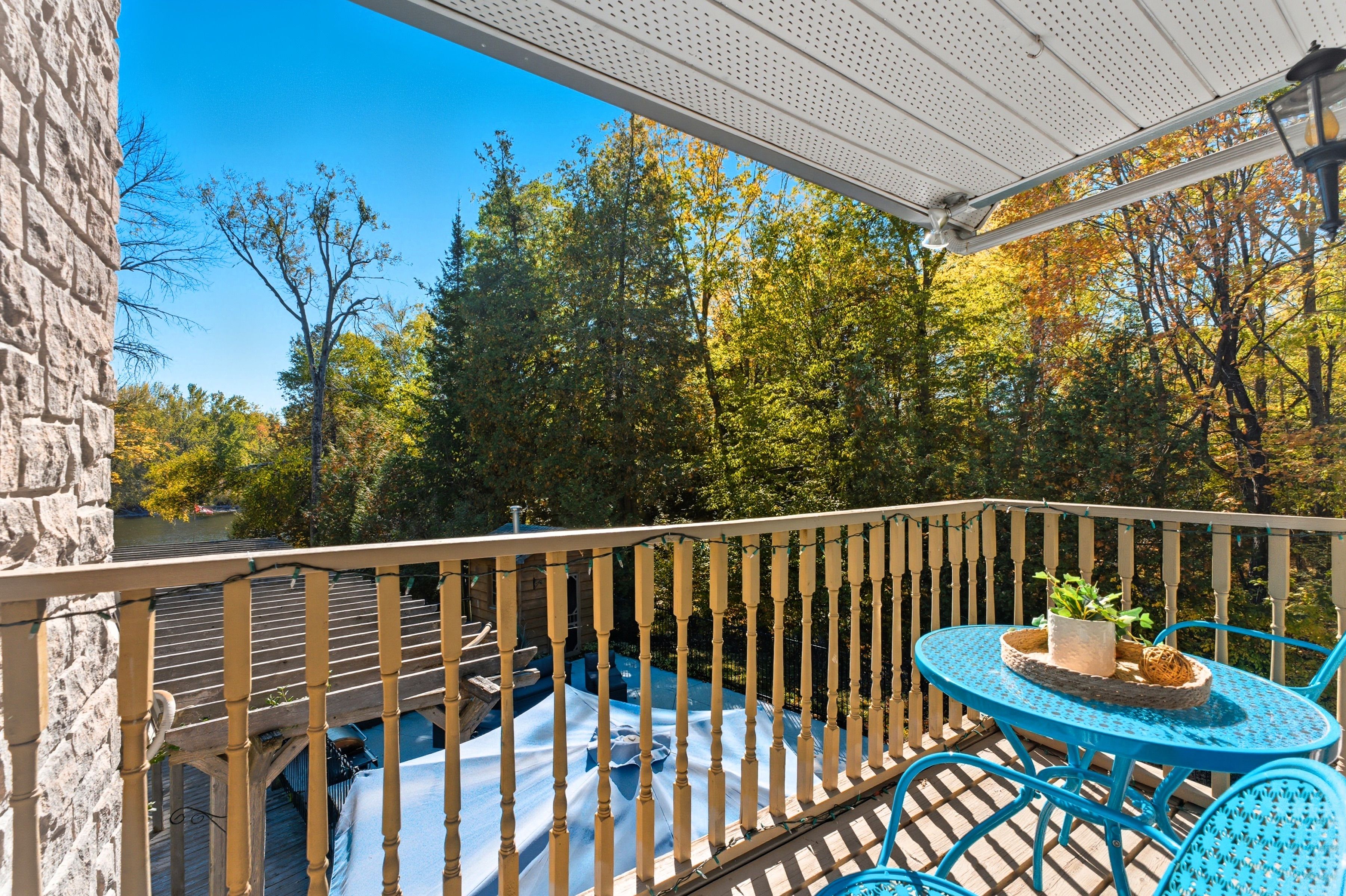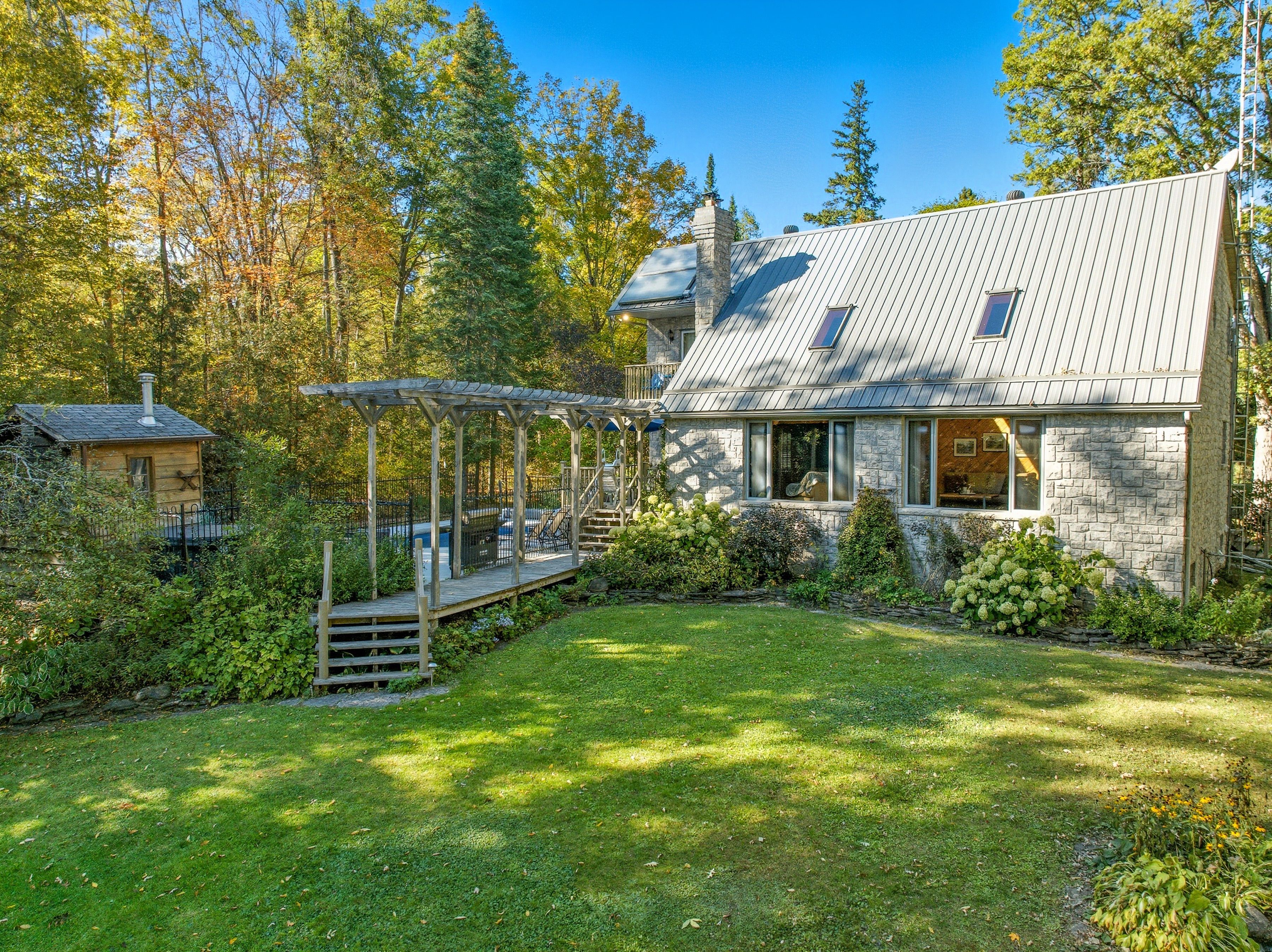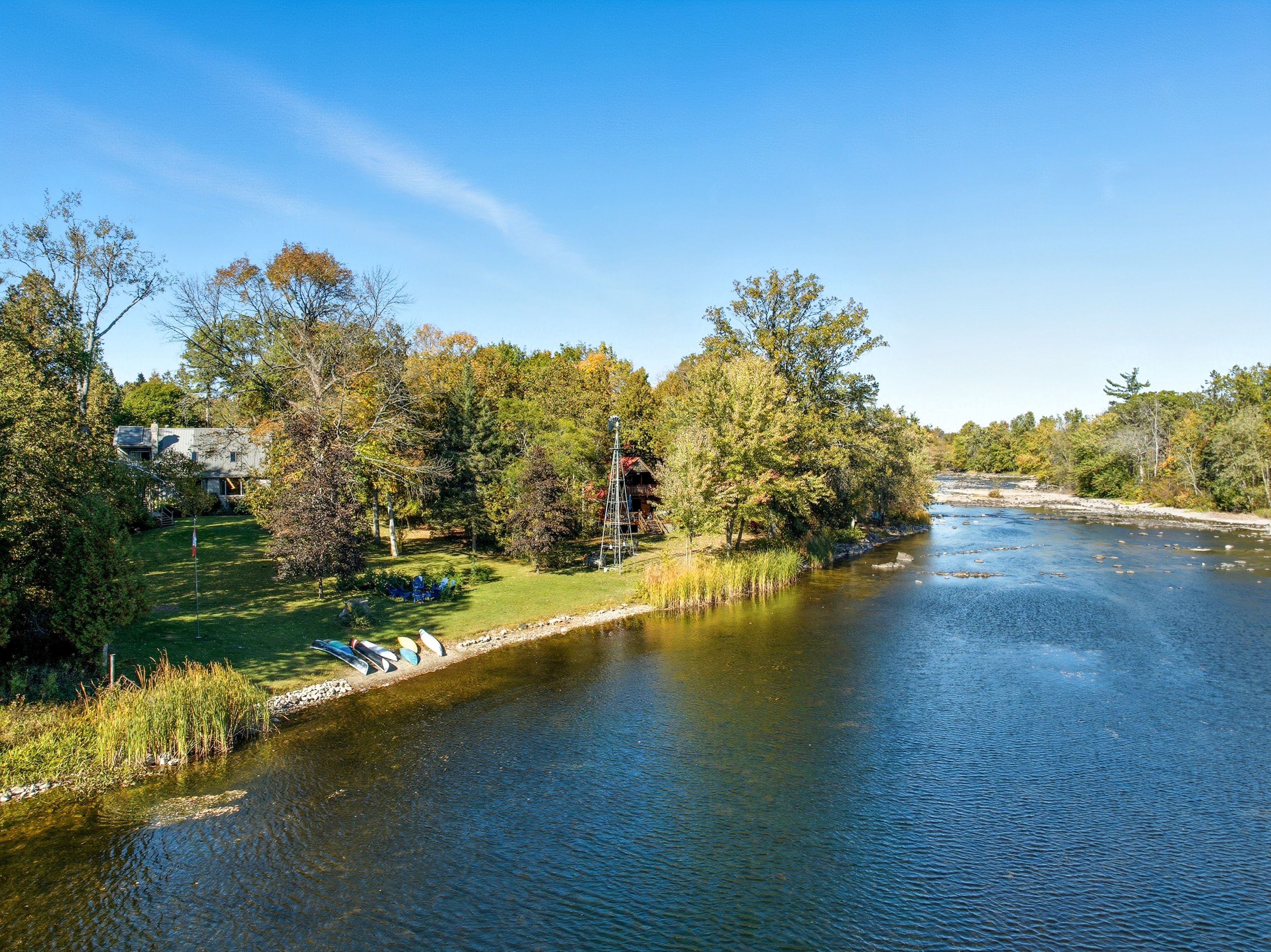 Between campbellford and marmora sits a riverside estate. A quiet, peaceful, serene place with a building made of stone, built with care--a much loved home. The main floor is open and bright with a high vaulted ceiling, large windows with views of the river, a wood stove for warmth on crisp autumn days. Open to the living room is a warm cherry wood kitchen with granite counters and stainless steel appliance. It flows to the dining room with a walk out to your saltwater pool and out to the backyard, your retreat. On this floor is also a tiled shower, a study/laundry/room. Upstairs, the master has its own balcony with breath-taking views. Two more bedrooms wait down the hall. The bath is large, with a jetted tub and a shower. The large basement family/bar/games room has a walk up for easy access, a wet-bar, a former fireplace (that could be brought back) and another utility room with tonnes of storage. Outside the land has so much to offer. A heated salt-water pool. A hot tub. A large heated -insulated garage that is perfect for tinkering, building fixing-or storing your toys. There's a greenhouse. A basketball court. A bunkie with root cellar. There are treehouses, a small fenced paddock. The river runs here. Over a hundred feet of riverfront. You can swim, boat and fish. The estate is built for life. Many ways to heat it. A generator backup if the power fails and supplemental wood heat. A built-in water sprinkler for the grass, a gorgeous stone and rock waterfall. Gardens a plenty. This is more than a home. This is a stead. A dream stead.