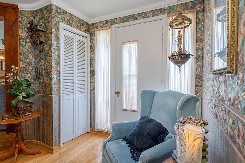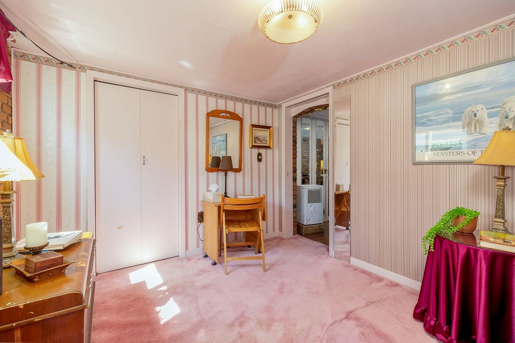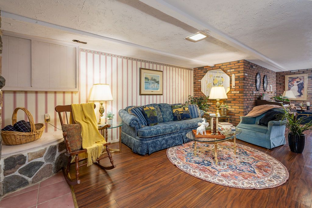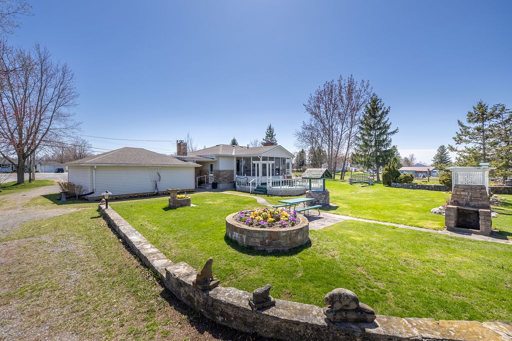 An extraordinary property where timeless craftmanship meets serene outdoor beauty-truly a setting worthy of hosting a wedding. This lovingly maintained bungalow showcases a stunning hand-crafted stone wall. Thoughtfully designed by the owner, a lifelong master stone mason, adding a rare and enduring character to the home. The oversized kitchen is both functional and striking, featuring built-in appliances and an impressive custom brick feature over the range. Patio doors open to a spacious screened-in covered deck, creating the perfect extension of living space for elegant entertaining or peaceful evenings overlooking the breathtaking grounds. The landscaped yard is a true showpiece, complete with lush gardens, a charming stone bridge, a well and an inviting outdoor picturesque retreat. Inside, the living and dining areas are enhanced by rich hardwood flooring, while the beautifully appointed main bath features a stylish stand-up shower. The lower level offers a generous recreation room with a cozy wood-burning stove, and additional bedroom and a large laundry area along with a convenient walk-up to the yard. A covered breezeway connects to the detached double car garage, the extended driveway leads to a 30' x 10'5" workshop - ideal for hobbyists or additional storage. Perfectly situated just minutes from highway 401, cfb kingston and downtown, this exceptional property offers a rare blend of elegance, comfort and convenience.
