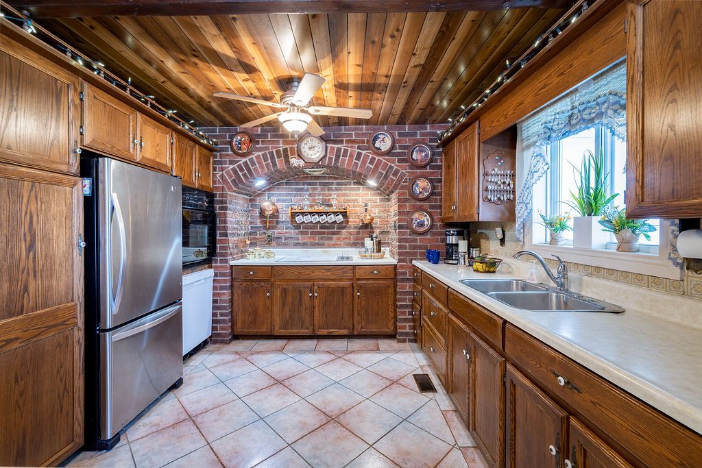 • Oversized kitchen with built-in appliances and custom brick feature.