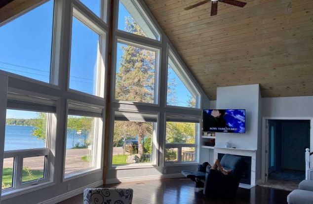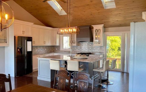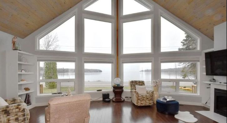 • Spacious interior with cathedral ceilings, large windows, and custom kitchen.
