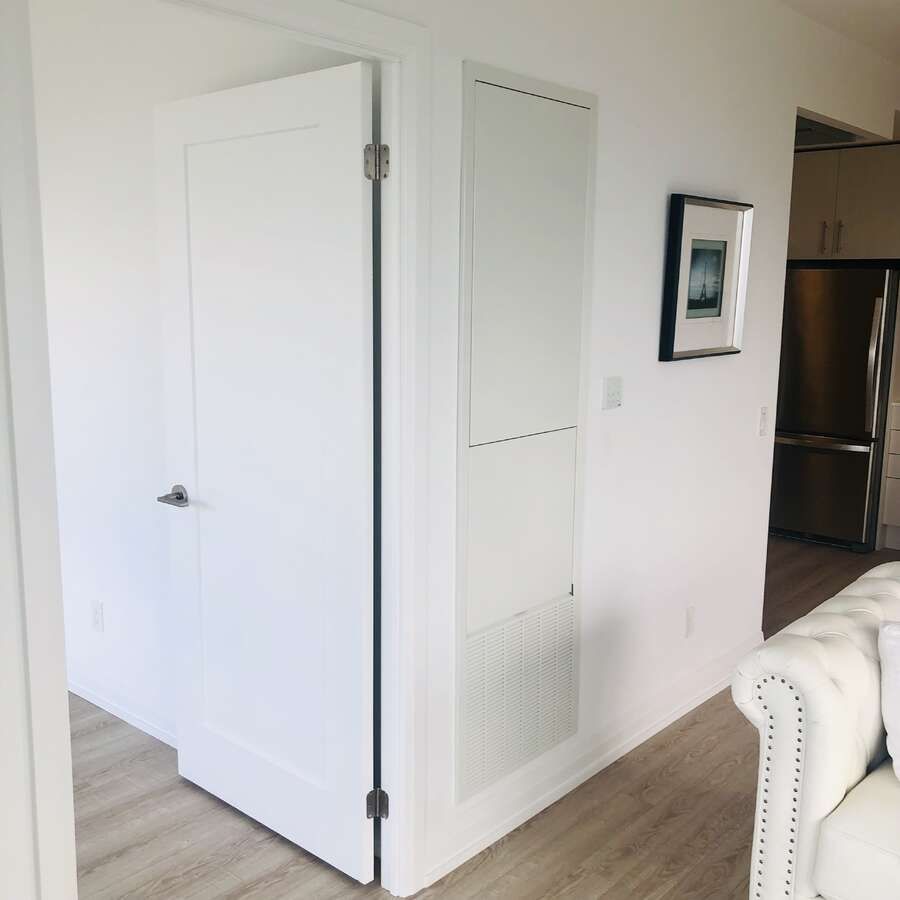 *** visit the realtor website for further information about this listing *** linx condo sub-penthouse on the 27th floor offers 3 bedrooms and 2 full bathrooms with a split-bedroom layout, 9-ft ceilings, and floor-to-ceiling windows. A 21-ft private balcony showcases panoramic city, park and lake views. The kitchen features quartz countertops with a porcelain backsplash, valance lighting, and full-size stainless steel appliances including a 30" fridge, 30" slide-in range, combo hoodfan/microwave, and 24" paneled dishwasher. Bathrooms include a marble countertop with integrated basin, 12"x24" porcelain floor and wall tiles, deep soaker tub, frameless glass shower enclosure, chrome low-flow fixtures, and a modern timed exhaust fan. In-suite laundry provides a high-efficiency front-loading washer and dryer. Mechanical systems include an individually controlled fan-coil hvac with integrated erv, on-demand heating/cooling, and individual hydro and water metering. Lighting/electrical details include 3-way track lighting in the kitchen, and white decora-style receptacles and switches. Security/technology highlights include a 24-hour concierge with monitored cameras, category 5 wiring to principal rooms, and high-speed fibre internet included in the maintenance fees (rogers ignite 500u, unlimited usage). Smart-living features (via the building app) include suite lock capability, app-integrated fob access, in-app video intercom, two smart thermostats, automated parcel lockers, and direct messaging to property management. Amenities include a gym and yoga room, resident lounge and co-working areas, children's play spaces, outdoor terrace with bbqs, party/entertainment lounge, ping-pong/recreation area, guest suites, pet washing station, and automated garbage/recycling on each floor. Prime location with a transit score of 97: steps to main street subway, ttc buses/streetcars, go train, and a wide range of restaurants, shops, parks, and recreation.