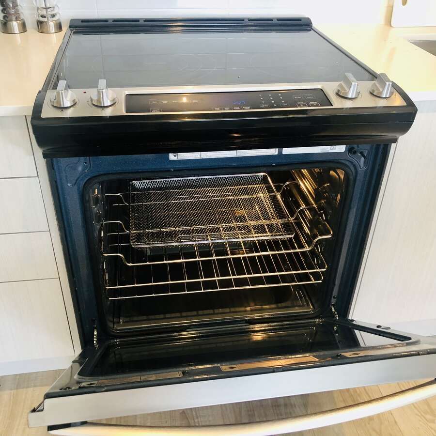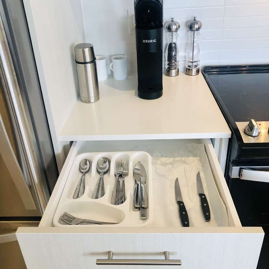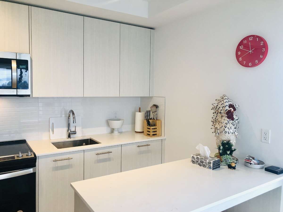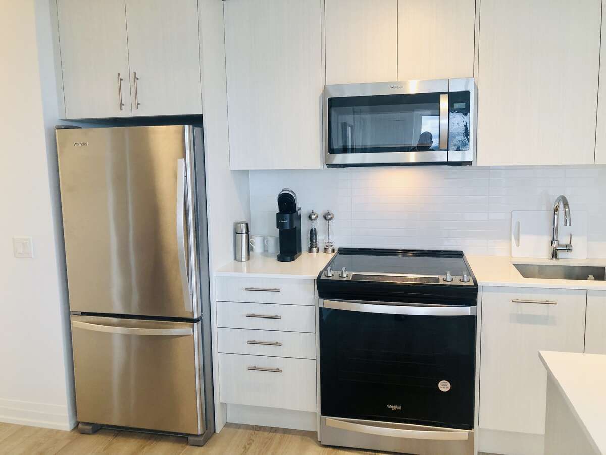 • Modern kitchen equipped with quartz countertops and full-size stainless steel appliances.