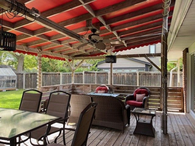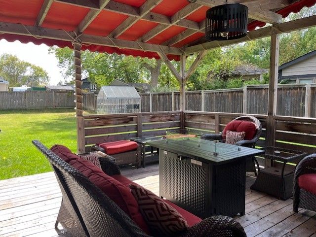 • Private fenced backyard with oversized deck, fire table, and outdoor kitchen.
