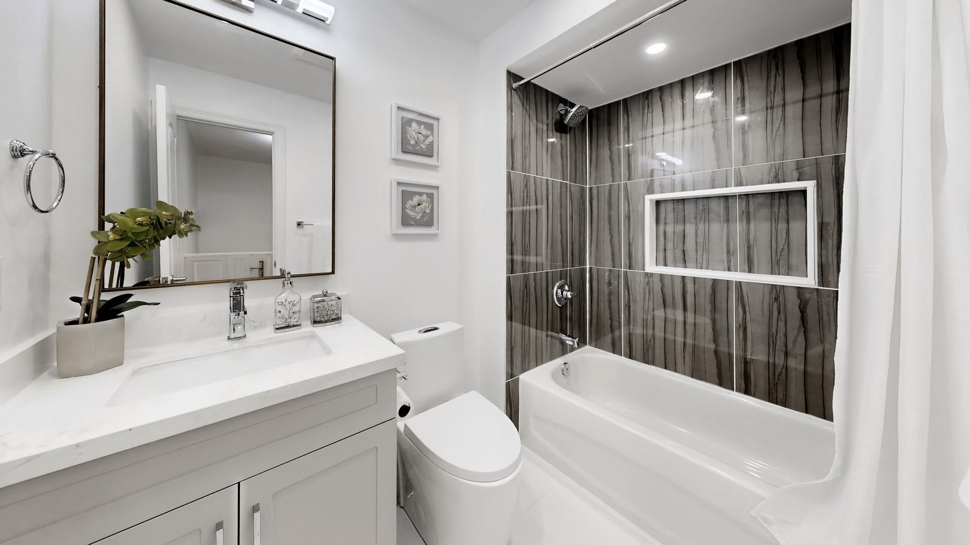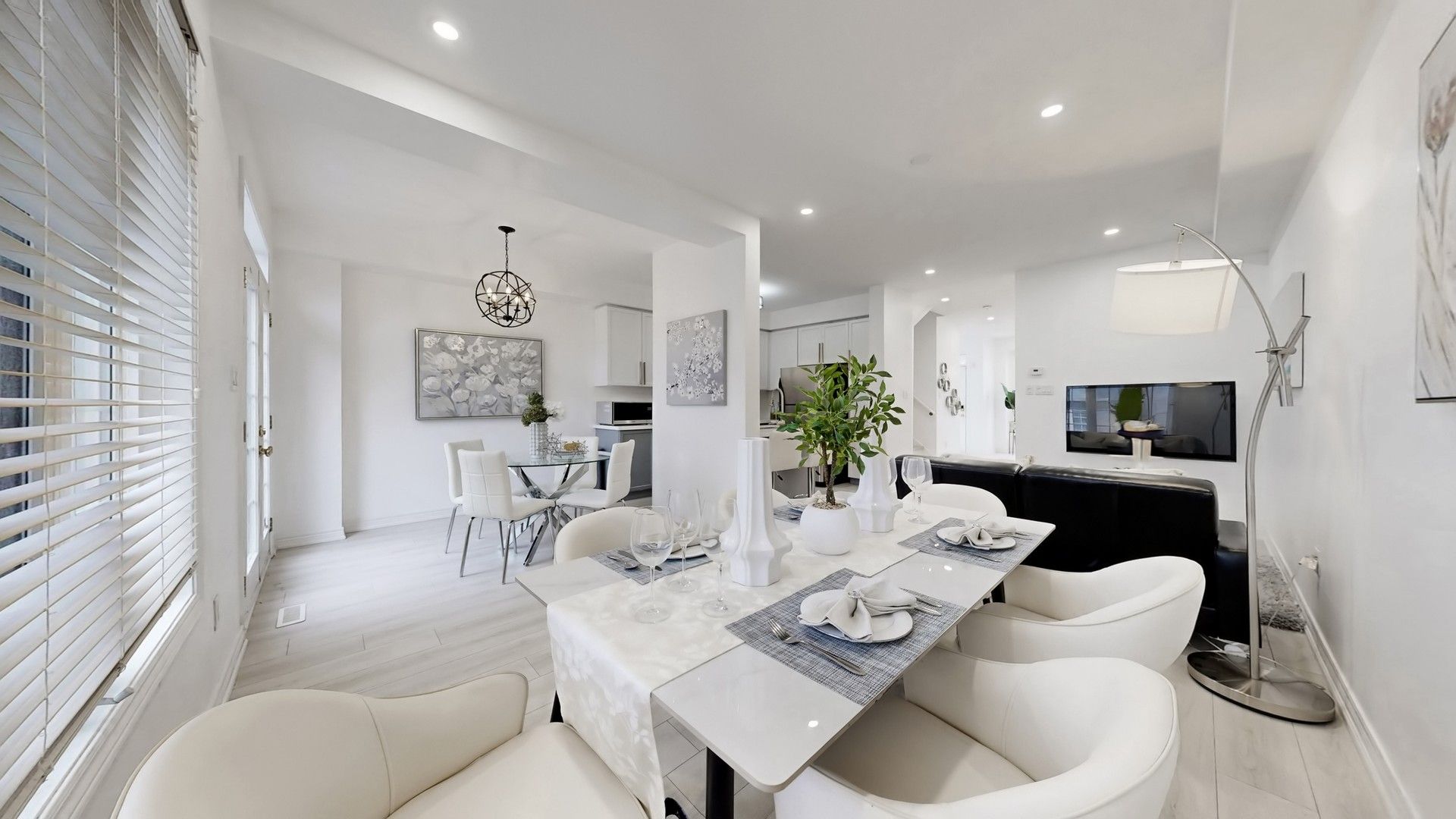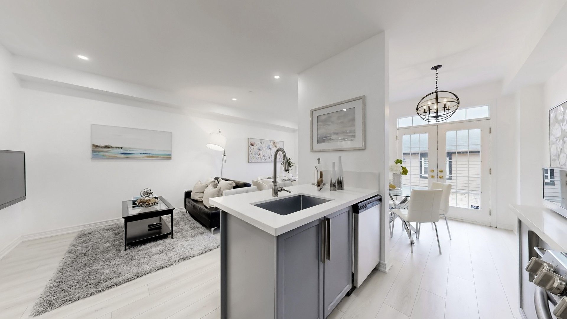 • Open concept layout with a modern kitchen featuring quartz countertops and stainless steel appliances.
