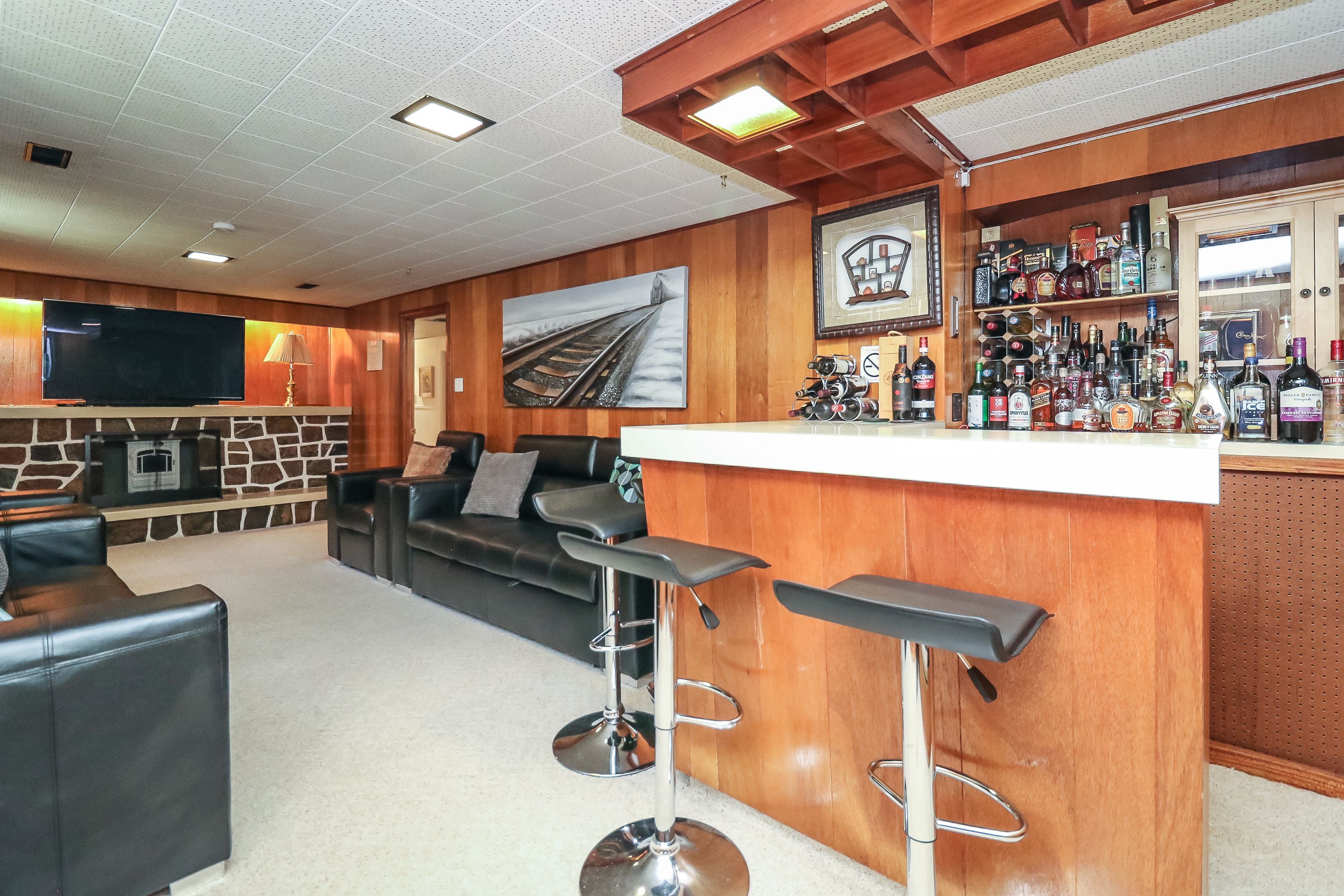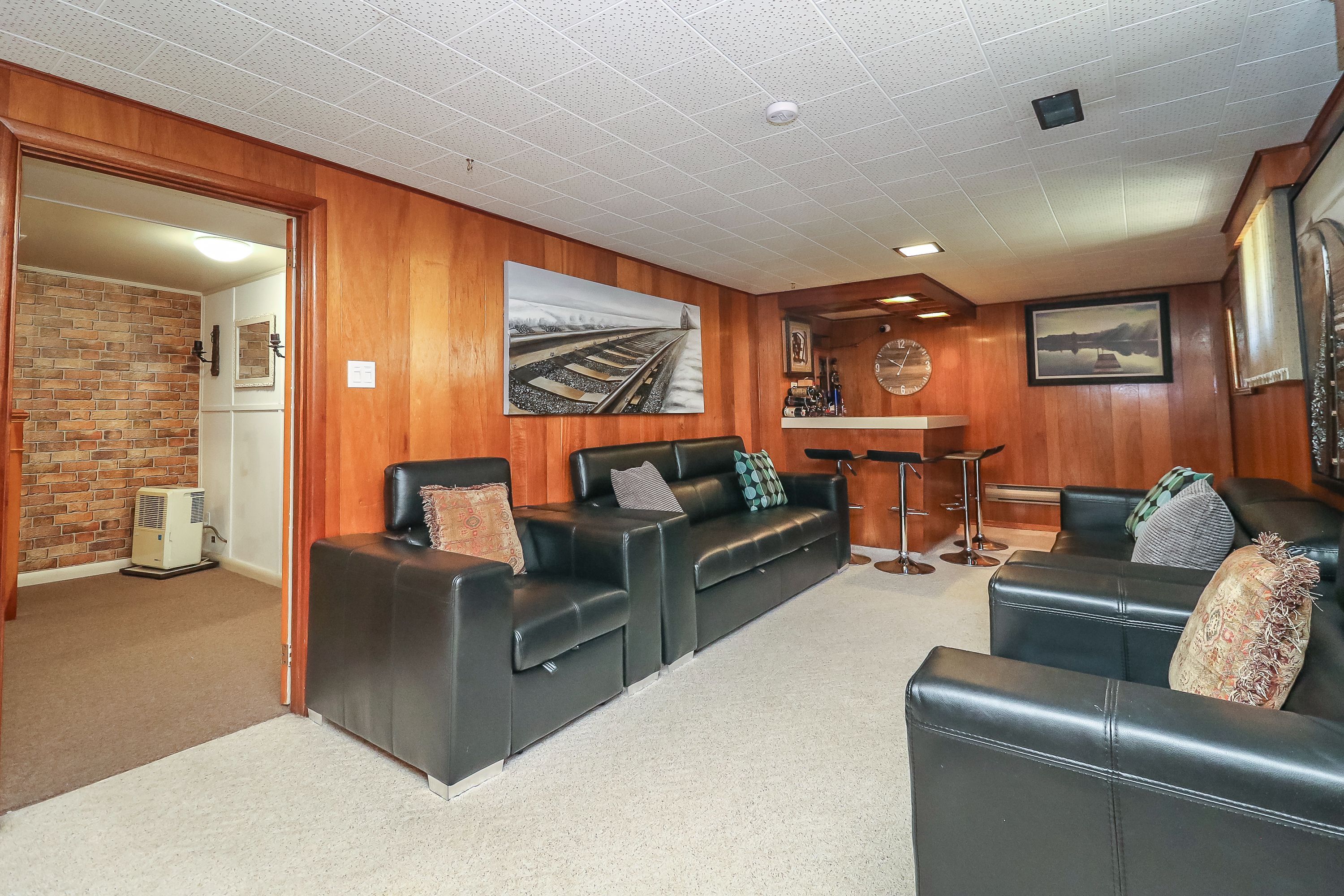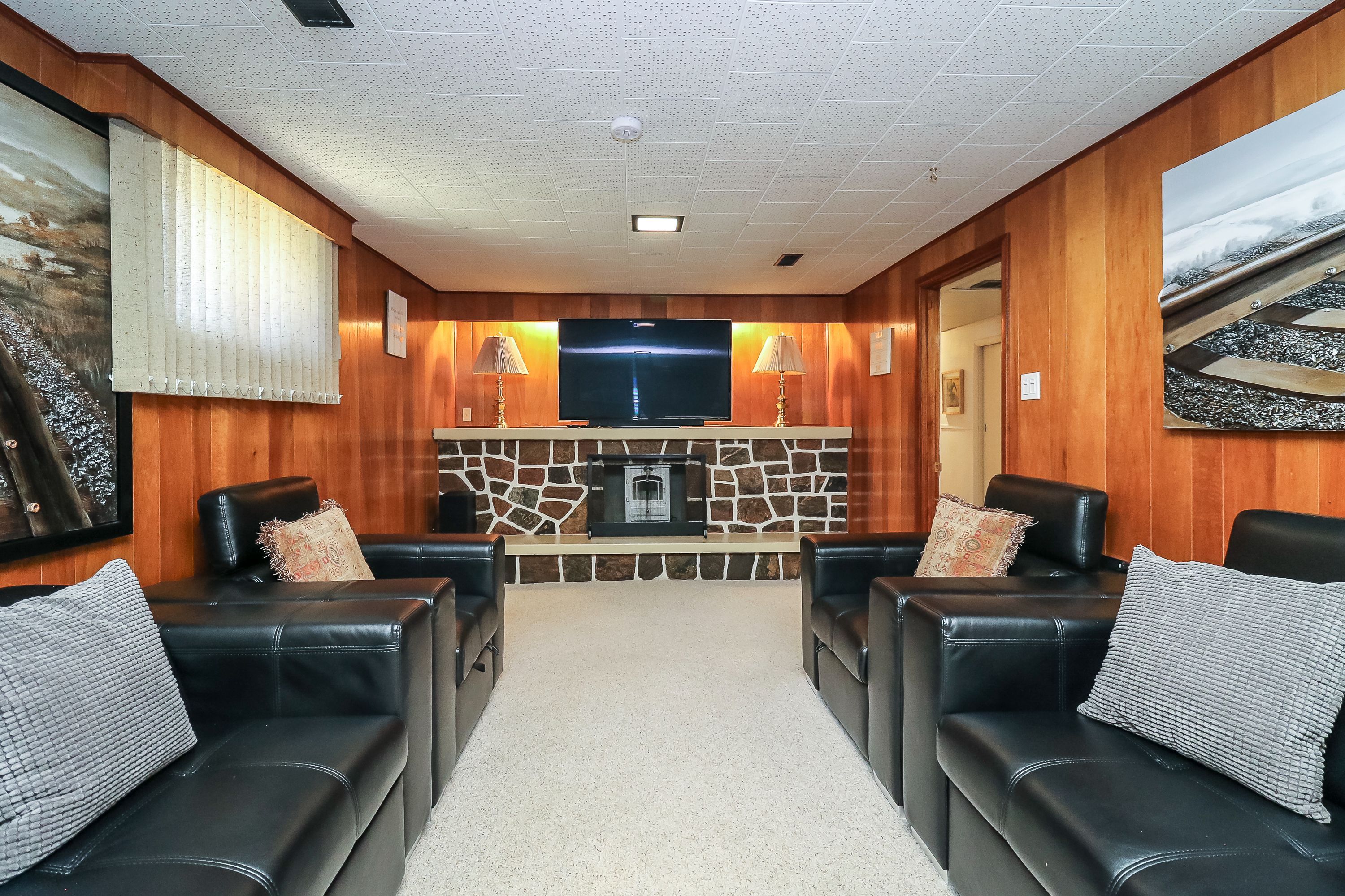 • Large rec room with a cozy faux stone fireplace.