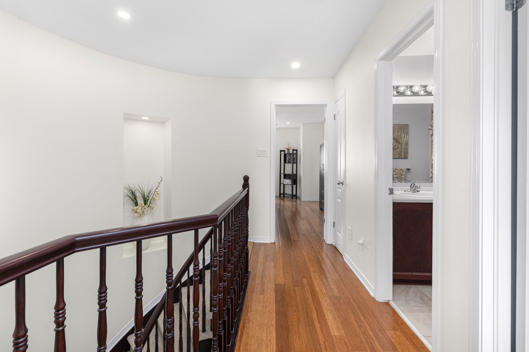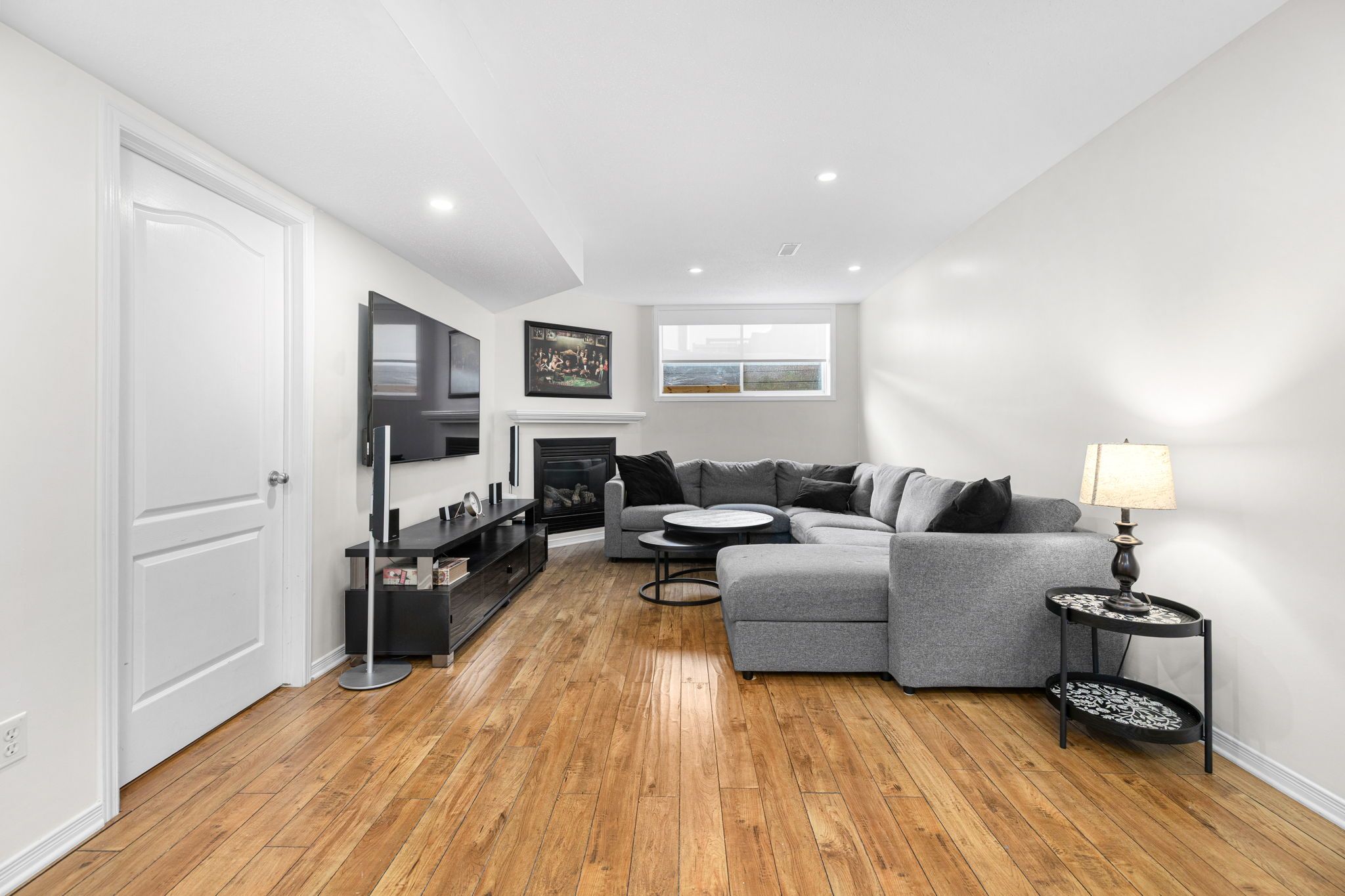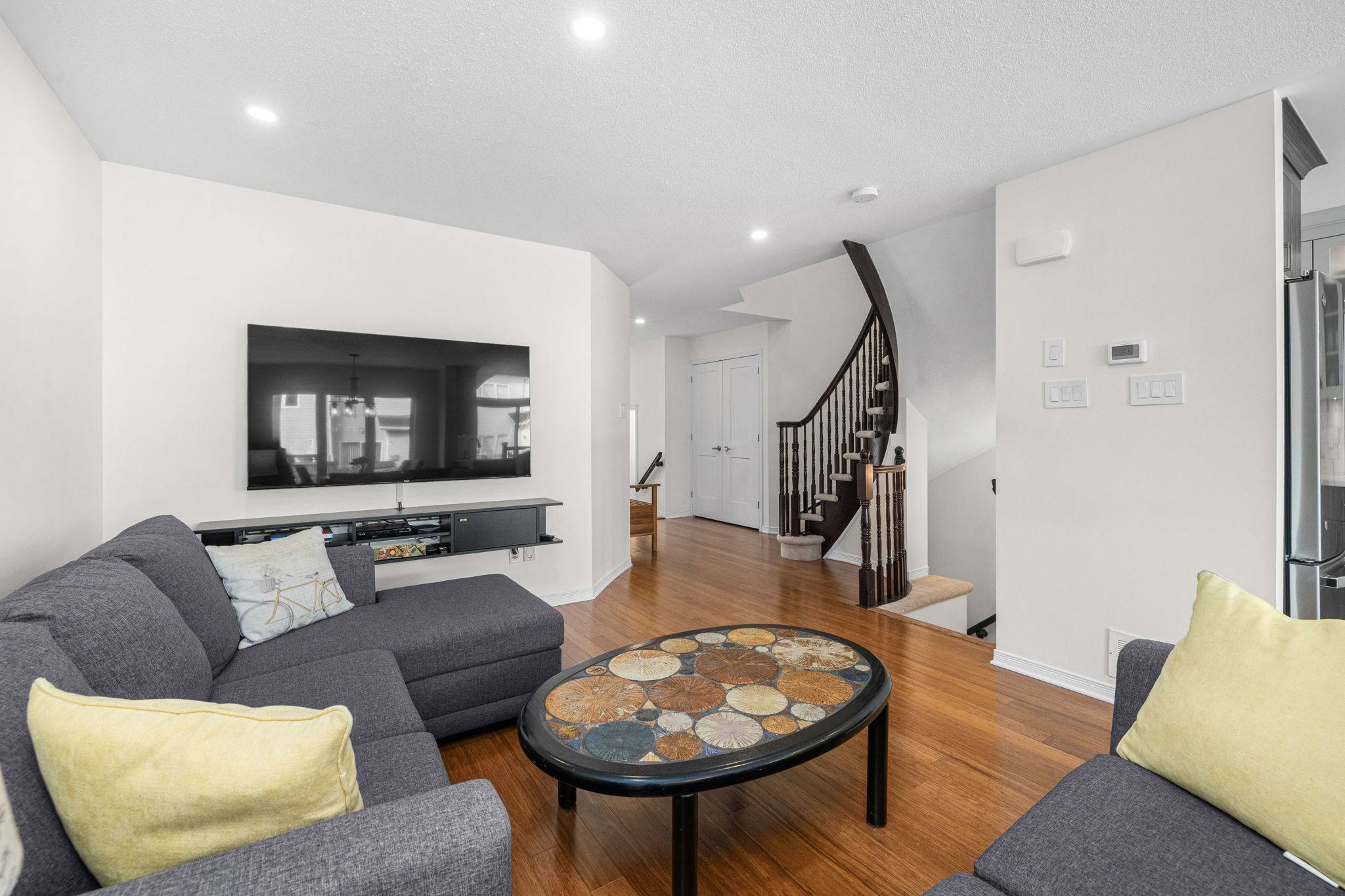 Extensively updated ever popular minto manhattan freehold townhome boasting just over 130k in recent updates. Upon entering this immaculately cared for 3 bedroom/2. 5 bathroom home located on a quiet family street you will be greeted by an inviting spacious entrance with a newly renovated powder room. One of the highlights of this beautiful home is the completely remodeled kitchen which features ample cabinetry with custom pull out cabinets, quartz counters, undermount lighting, ss appliances and modern ceramic tiles. Adjacent to the kitchen is the dining and living room which is complemented by bamboo flooring and loads of pot lights. The circular staircase leads you to the second level which also features bamboo flooring in all 3 bedrooms and the hallway. The spacious master has a large wic and a newly updated ensuite bathroom with free standing tub, modern vanity with quartz and separate shower. There are two other generous bedrooms including the second bedroom with custom built-in shelving, perfect for the book enthusiast. The beautifully finished lower level features high grade laminate flooring,a cozy gas fireplace and pot lights. The backyard has a convenient 2 tier deck which is perfect for summer bbqs. This immaculate home has undergone several recent updates such as: freshly painted throughout, roof '20/22, furnace & a/c '23, kitchen '23, ensuite bathroom '20, pot lights '22/23, custom bookshelf '21, powder room '23, deck '16. Only carpet on staircases. Ideally situated closer to great schools, parks, transit, shopping..