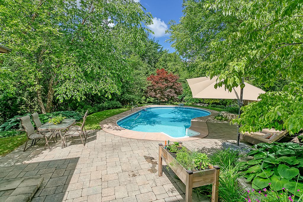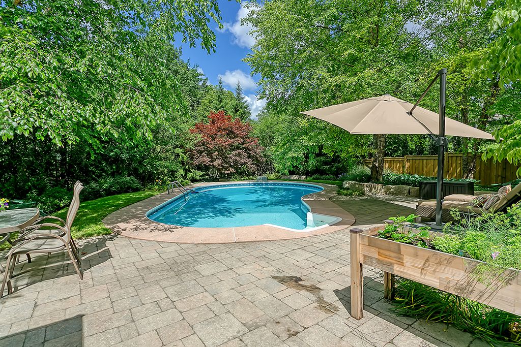 An outstanding and truly irreplaceable property backing onto 16 mile creek and the world-renowned glen abbey golf course. The gorgeous, private lot features an in-ground pool and charming cabana-an ideal setting for outdoor entertaining and family gatherings. This impeccably maintained four-bedroom family home has been thoughtfully updated throughout. The stunning cream kitchen features stainless steel appliances, granite countertops, and an oversized island, seamlessly opening to a warm and inviting family room with a wood-burning fireplace. Maple hardwood flooring runs throughout. Elegant formal dining room, complemented by a bright living room with a charming bay window. The upper level offers four generously sized bedrooms, an updated main bath, and a delightful reading nook. The primary retreat includes a walk-in closet and a beautifully renovated, spa-inspired ensuite with a freestanding soaker tub and separate shower. The fully finished basement provides exceptional additional living space with a wood-burning fireplace, games room, and an additional three-piece bathroom.