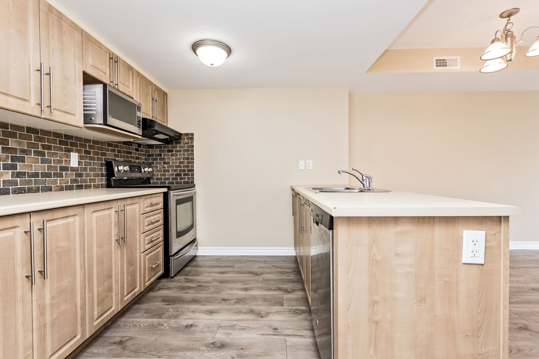 • Modern kitchen with stainless steel appliances and ample counter space.