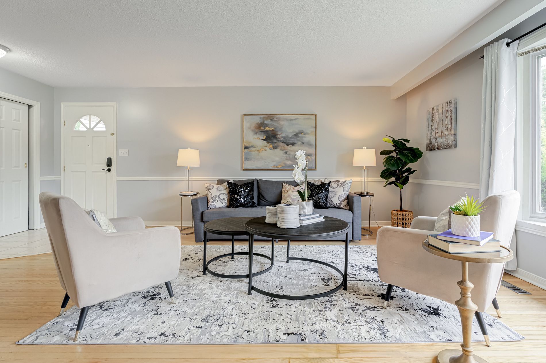 • Large living room with a bay window for natural light.