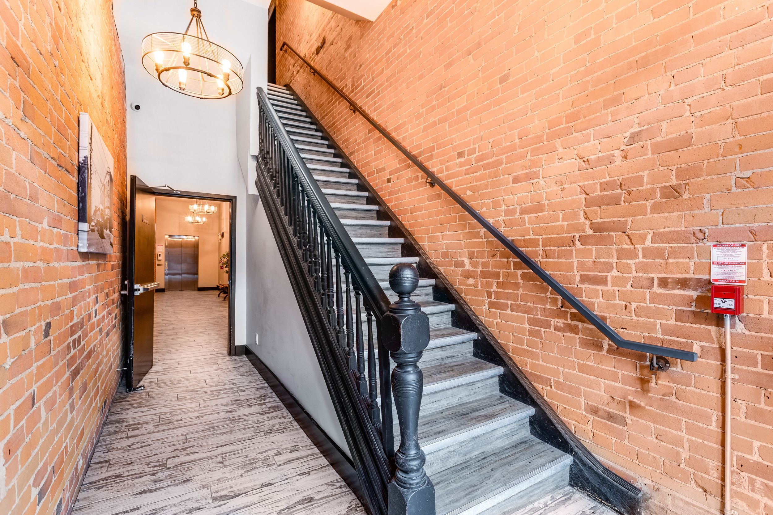 • Stylish bachelor suite with exposed brick and high ceilings.