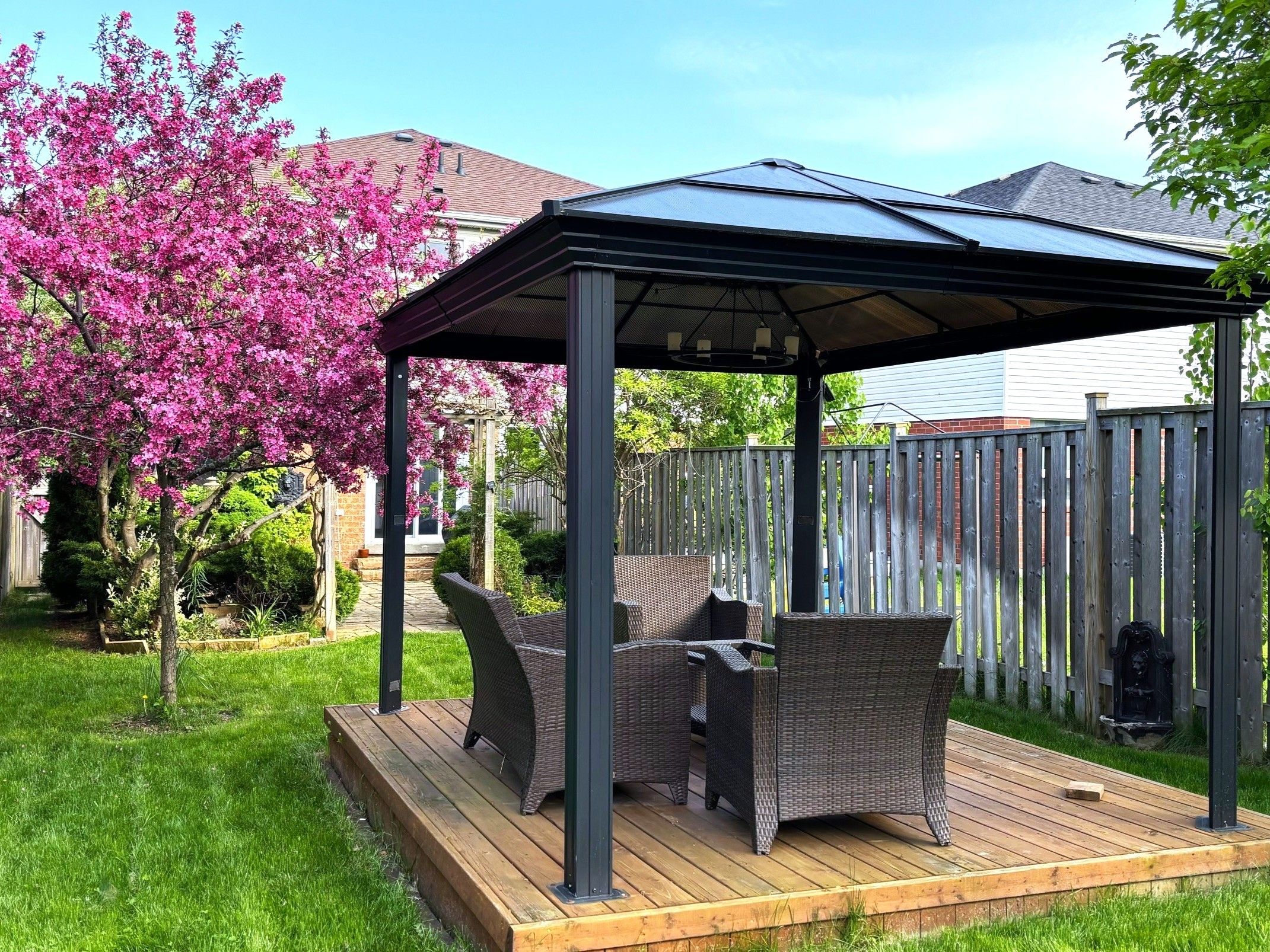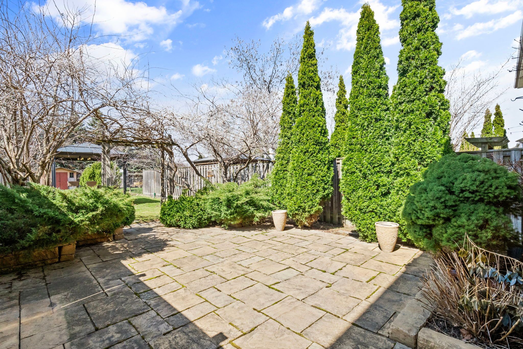 • Beautiful backyard with a gazebo, stone patio, and mature trees for relaxation.