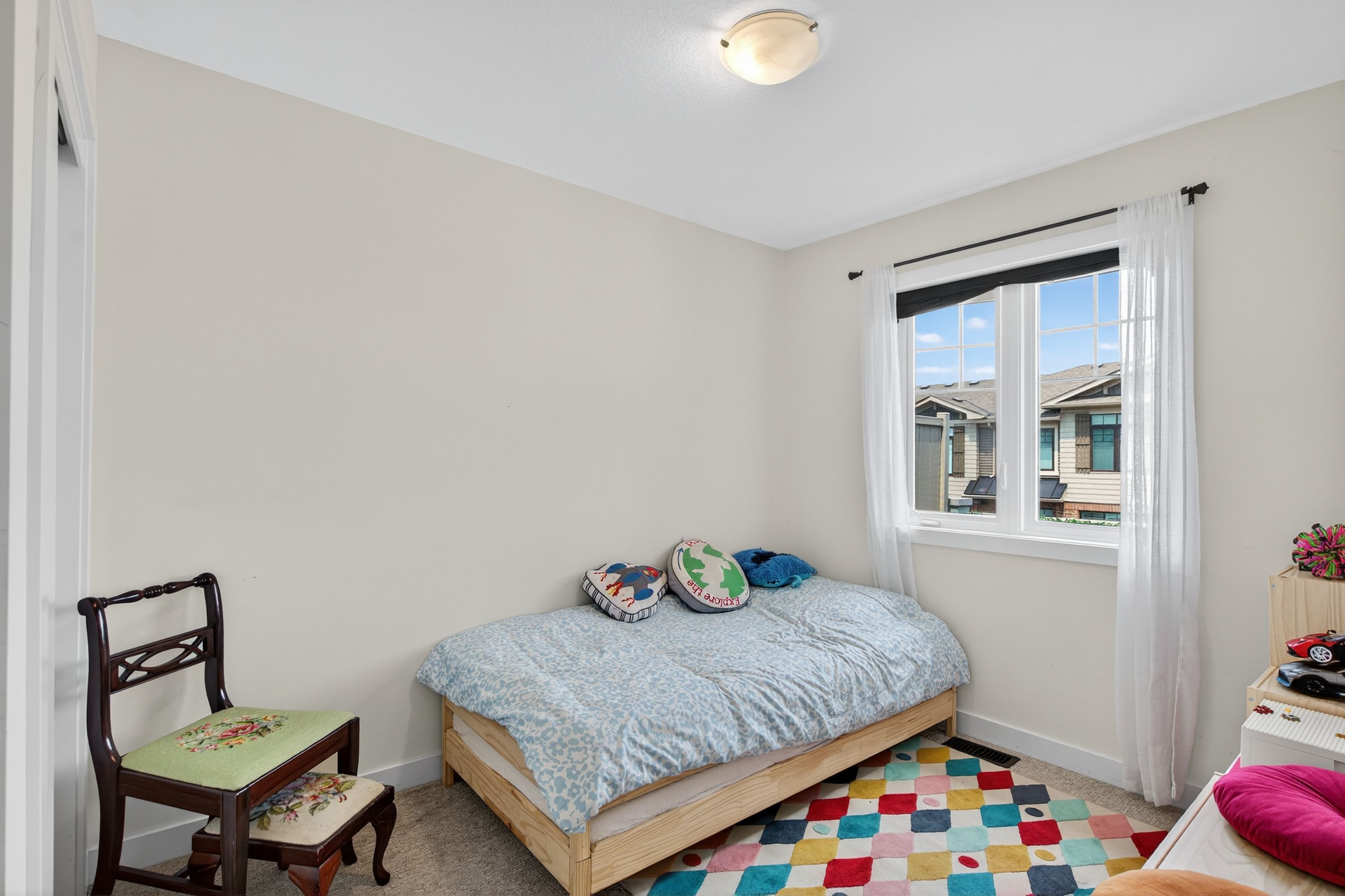 • Spacious family room with a charming feature wall and private balcony access.
