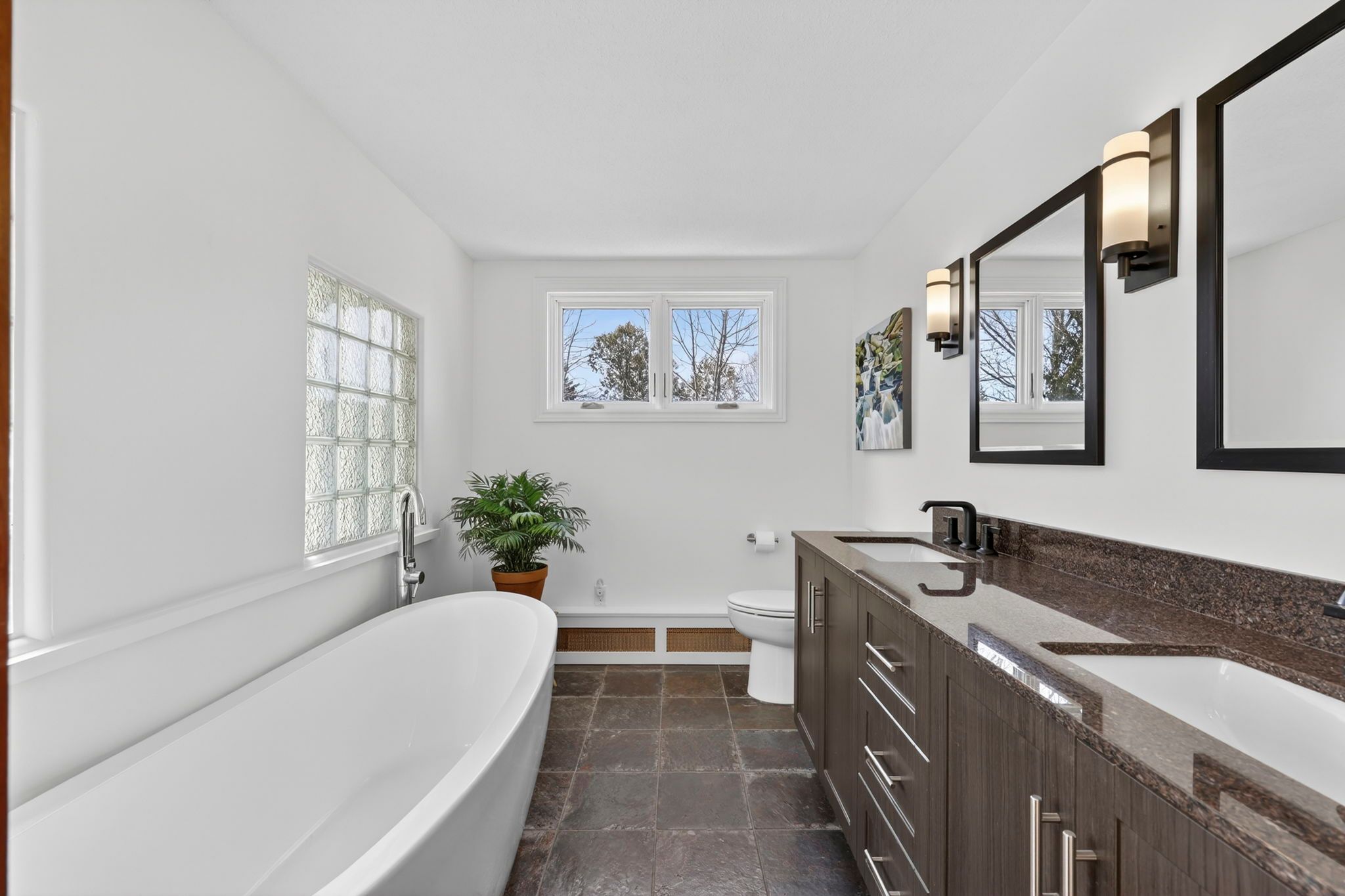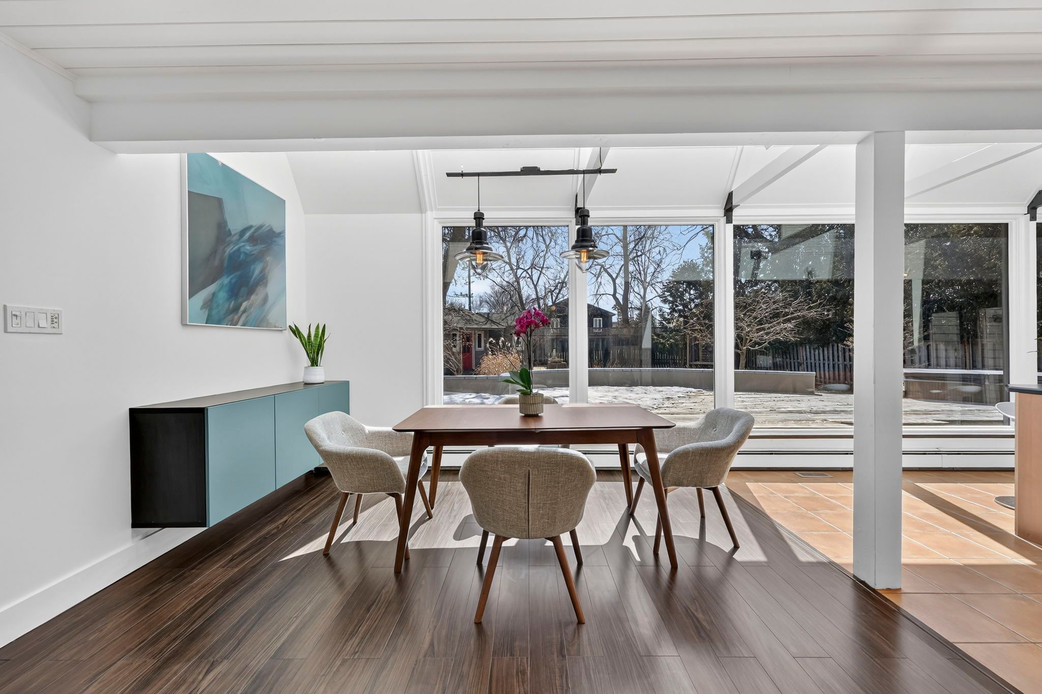 • Bright kitchen with wall-to-wall windows and skylights for natural light.