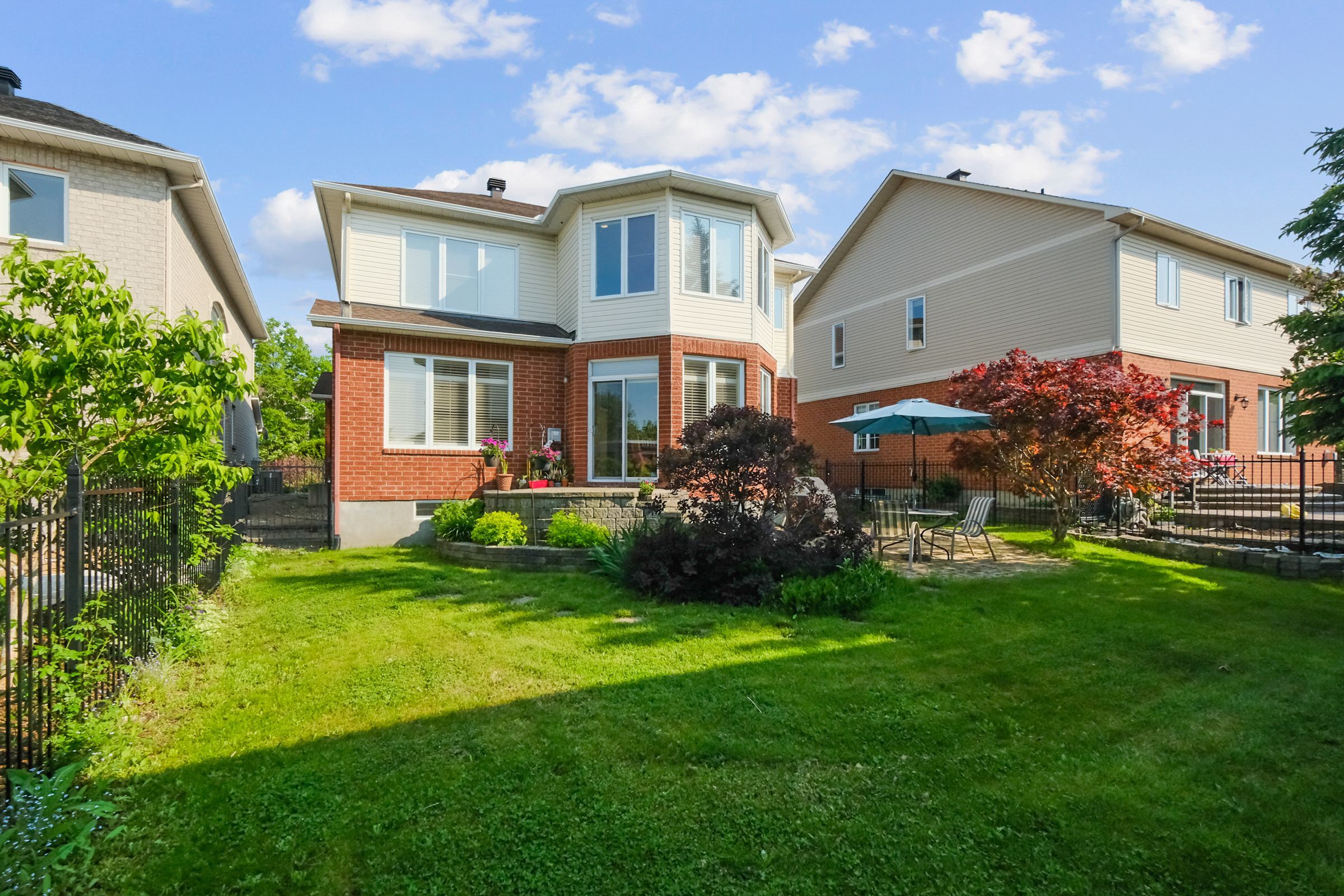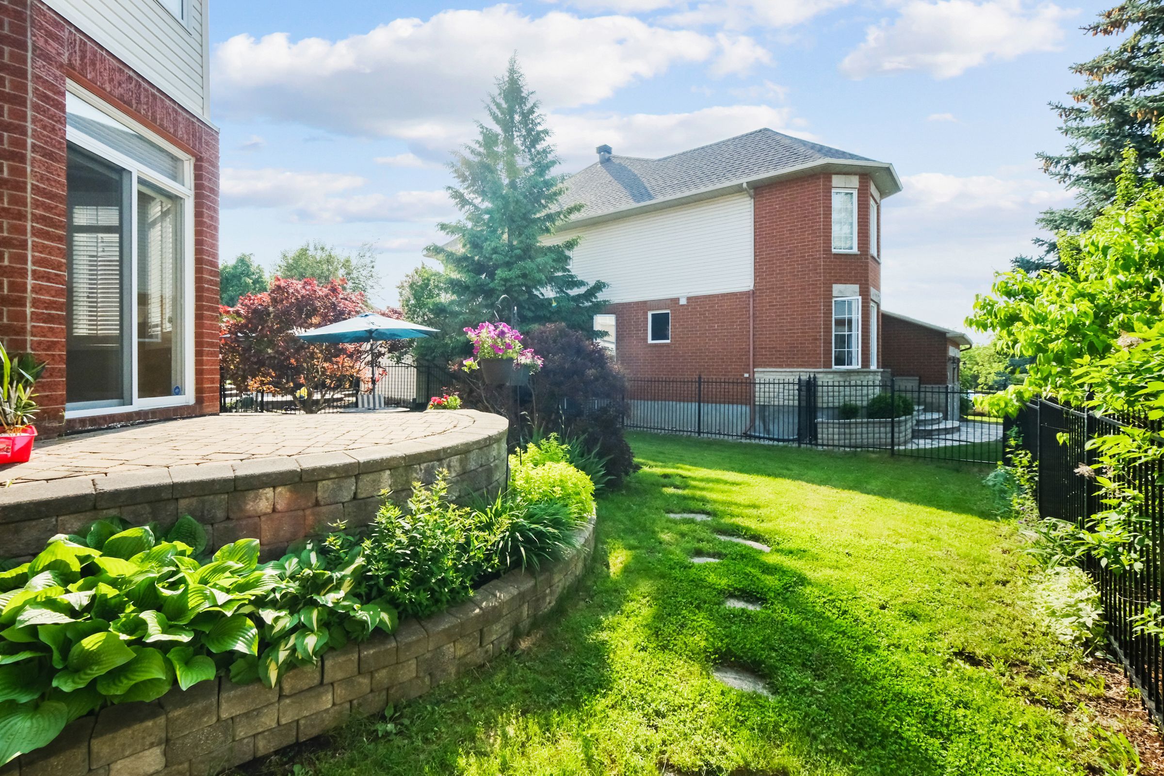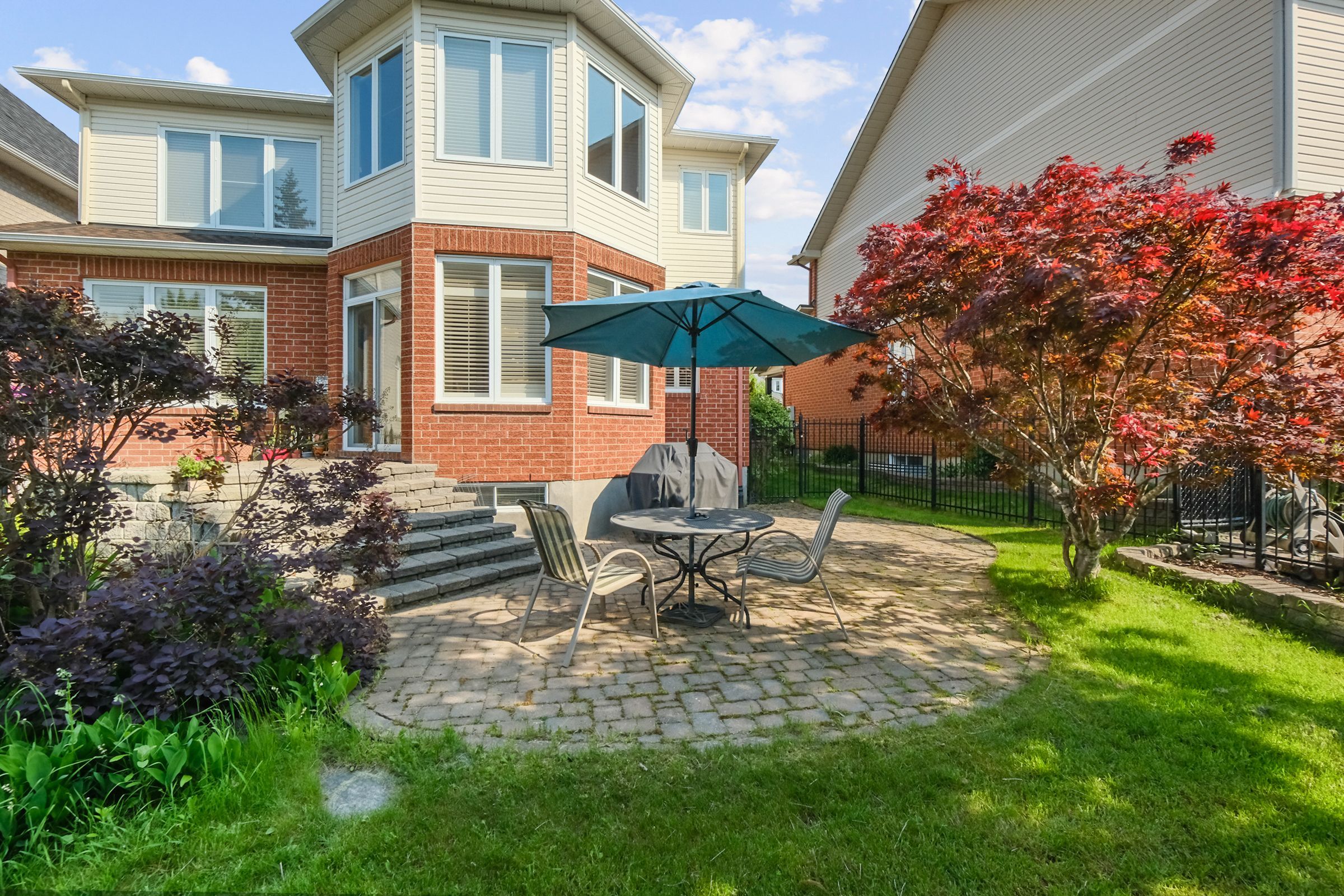 • Backyard features wrought iron fencing and interlock patio for outdoor enjoyment.