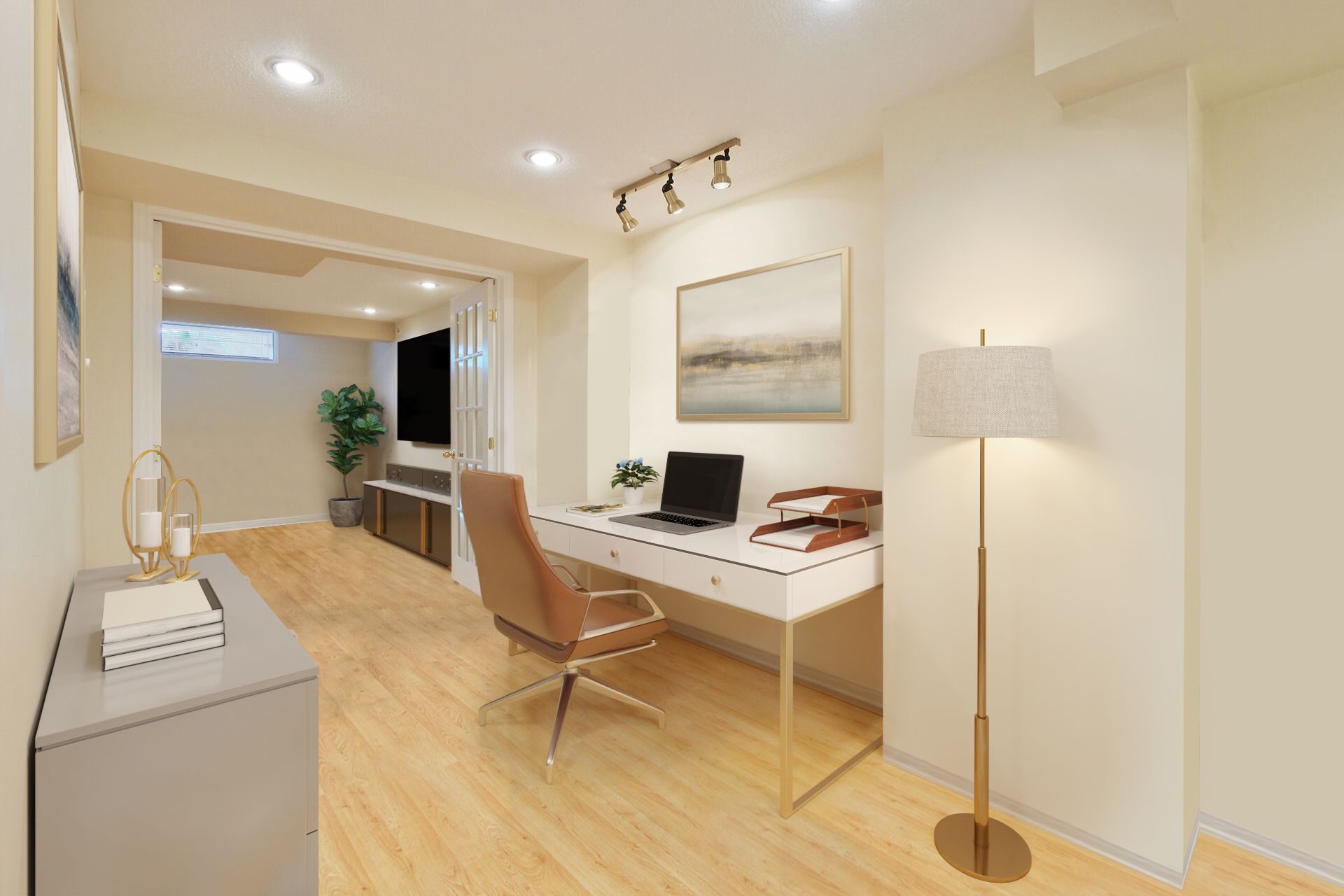 • Fully finished basement includes a large family room and hobby spaces.