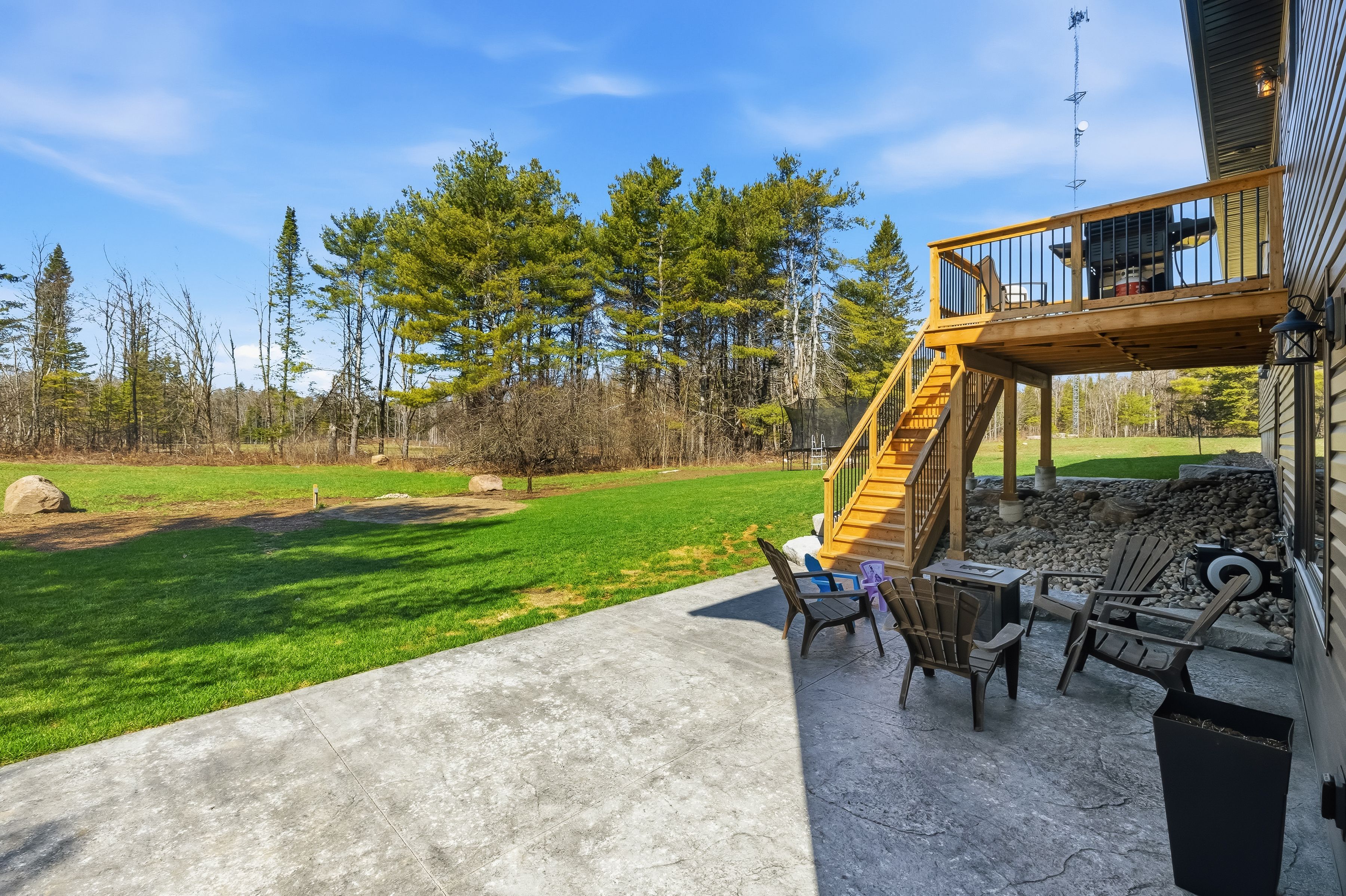 Welcome to this custom-built bungalow tucked away on a private country lot at the end of a paved cul-de-sac, surrounded by mature trees and offering desirable east/west exposure. Thoughtfully designed with 3 bedrooms and open-concept main-floor living, this home features 9' ceilings throughout and an impressive 12. 5' vaulted ceiling in the living room. The kitchen is well appointed with a center island, ample storage, and patio doors leading to the deck-perfect for outdoor entertaining. The primary suite boasts a walk-in closet and a 4-piece ensuite with an enormous walk-in shower. Enjoy the convenience of main-floor laundry with direct access to the oversized garage. The fully finished walk-out basement offers a spacious rec room with large windows, a den, rough-in plumbing for a wet bar, and a 3-piece bath complete with a walk-in shower, seat, and linen closet. Exterior highlights include tremendous parking, a circular driveway, armour stone landscaping, and a stamped concrete patio area. Additional features include custom window coverings, propane forced-air heating, and a heat pump. A rare combination of privacy, quality craftsmanship, and functional living-this property truly has it all.